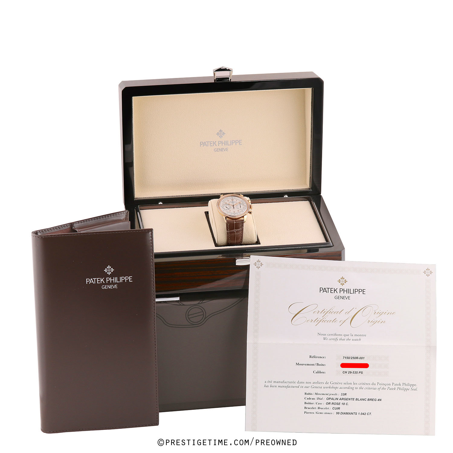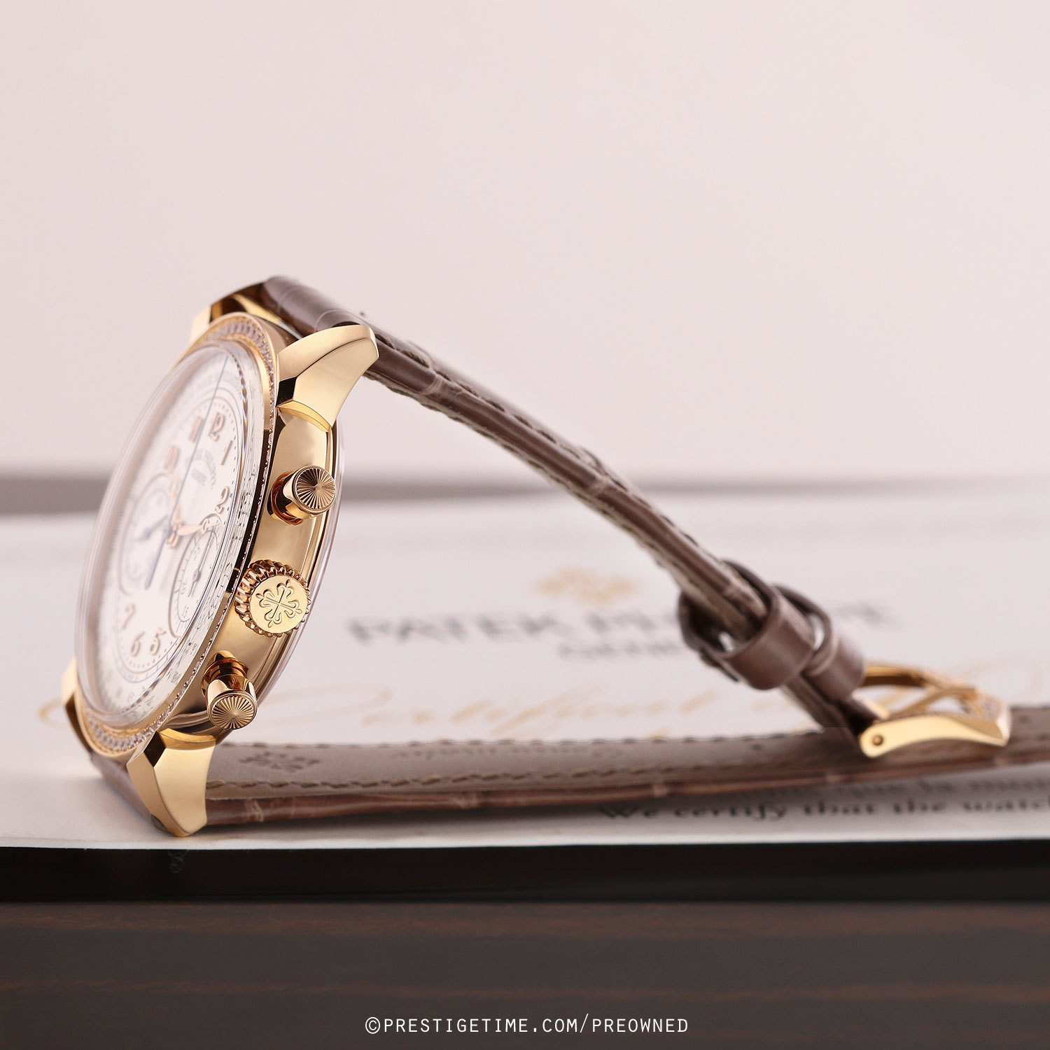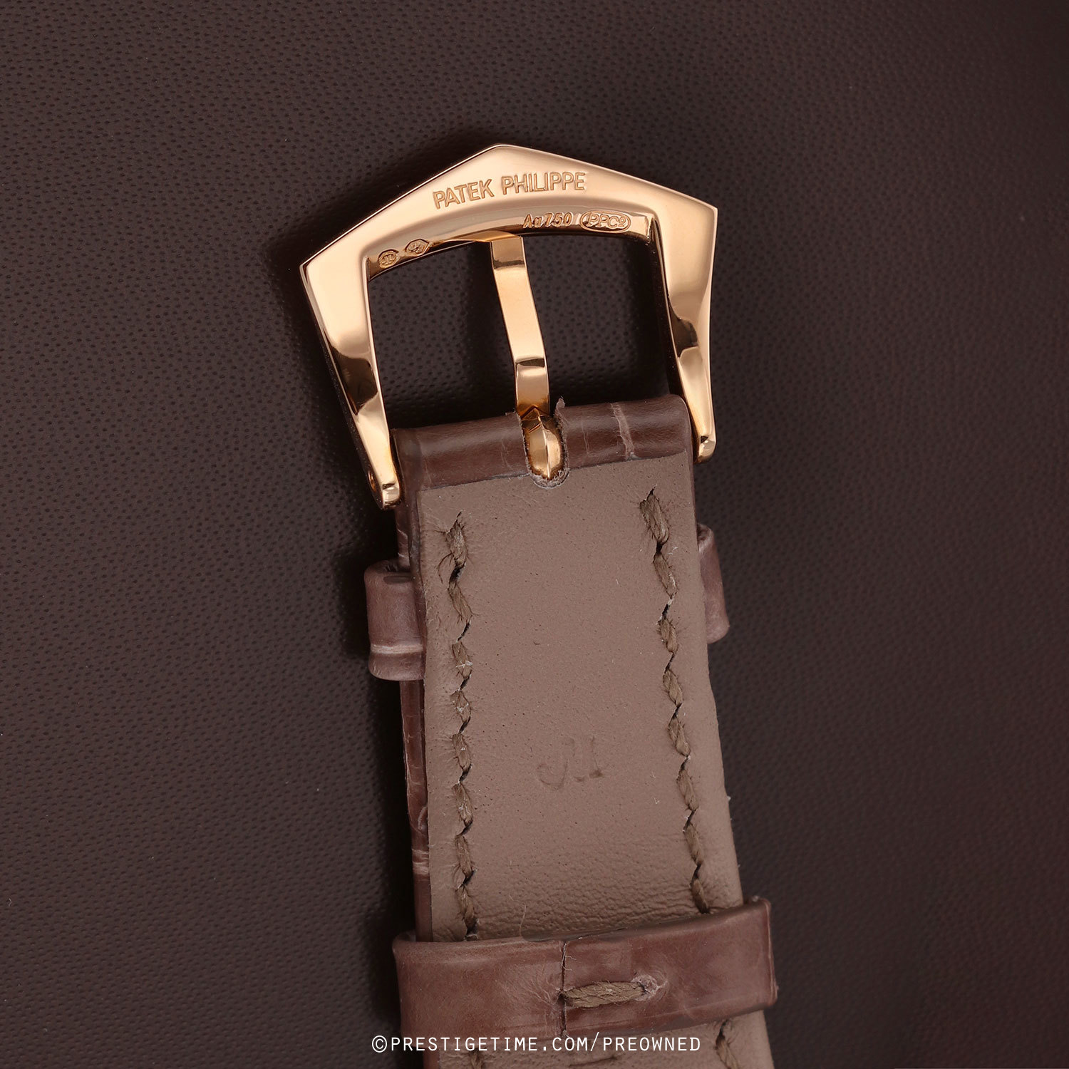 Strap: Fitted on its original Patek Philippe shiny mink-gray alligator leather strap with a polished solid 18kt rose gold tang buckle set with 27 brilliant cut diamonds weighing a total of 0.21 carats. The strap is unworn in new condition with its full wear lifespan remaining.