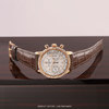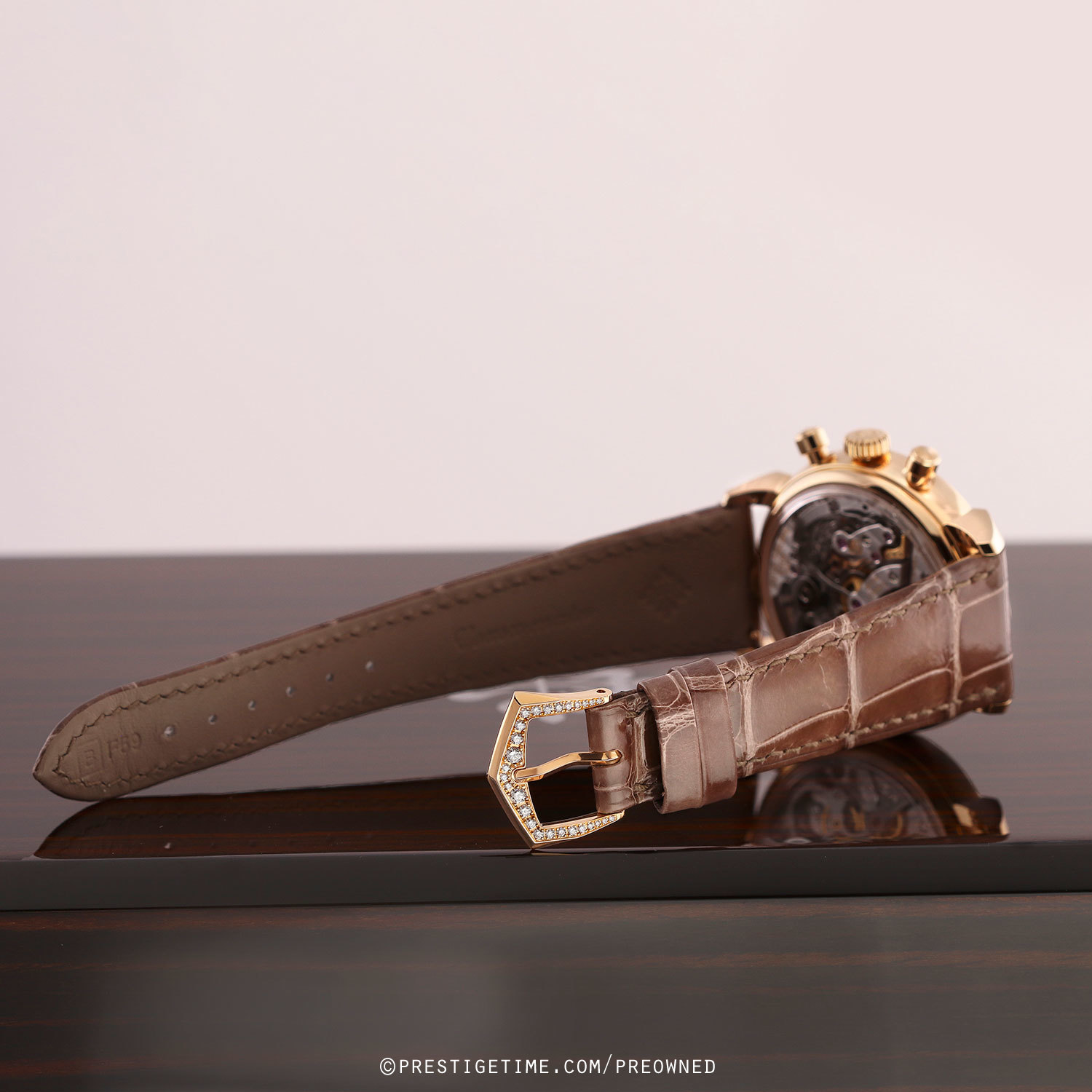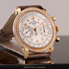 Case: Polished 18kt rose gold case. Bezel factory set with 72 diamonds weighing a total of +/- 0.78 carats. Silver opaline dial. Polished rose gold hour & minute hands, darkened white gold chronograph & seconds hands. Applied polished rose gold numeral hour markers. Applied polished rose gold dot minutes/seconds track. Small seconds sub-dial at 9 o'clock. Pulsimeter scale on the dial perimeter.