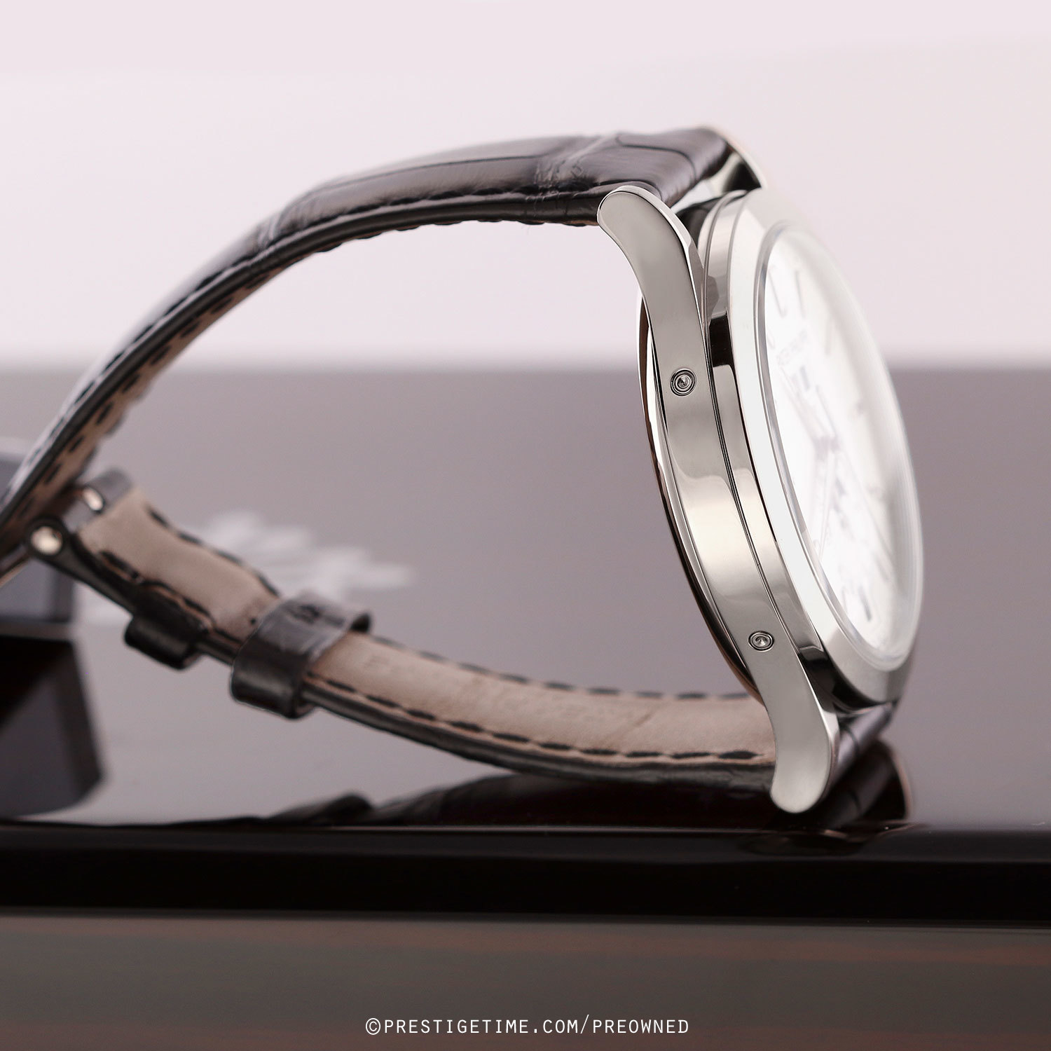 Case: Polished 18kt white gold case. Silver dial. Polished white gold hands. Applied polished white gold index hour makers. White gold dot minute/seconds track.