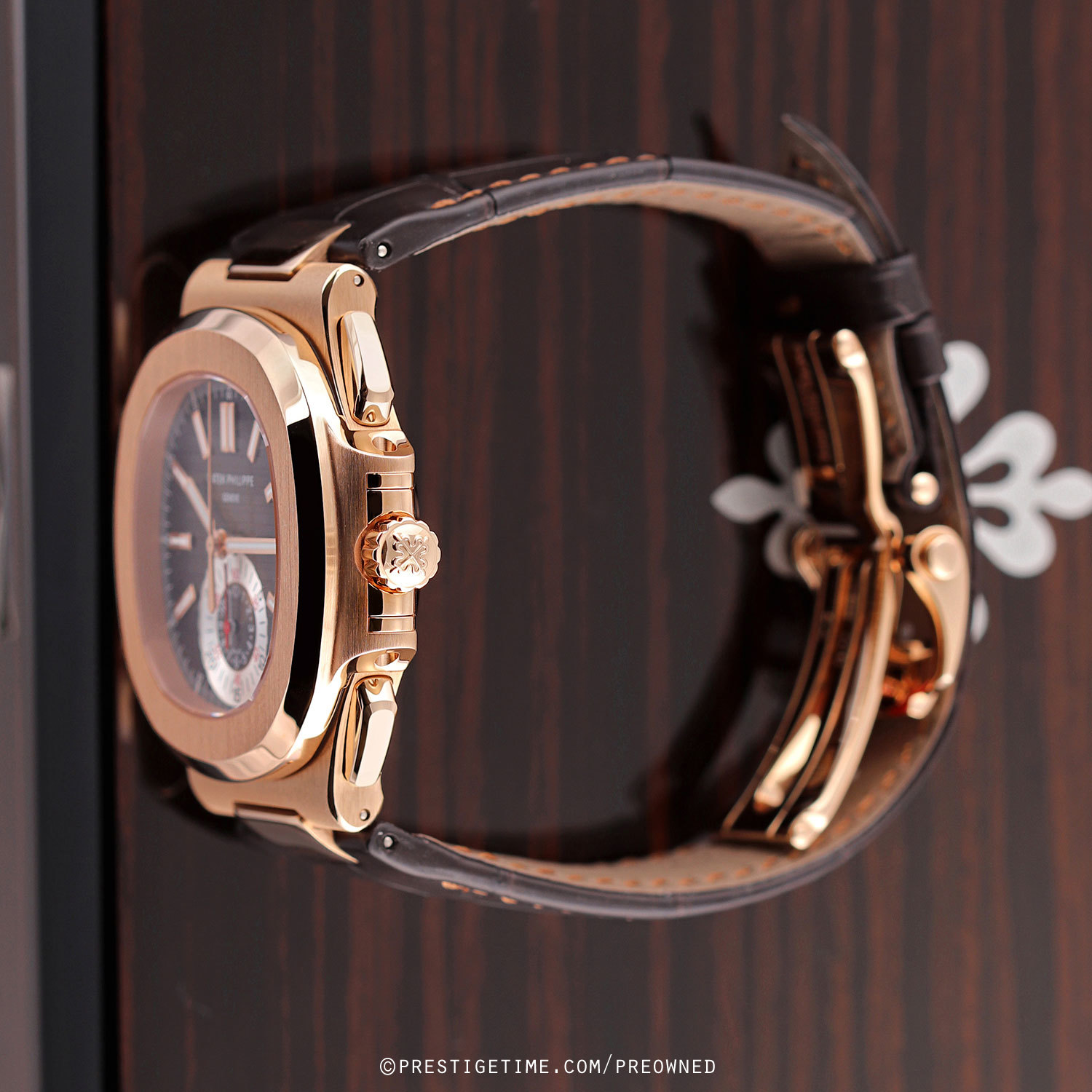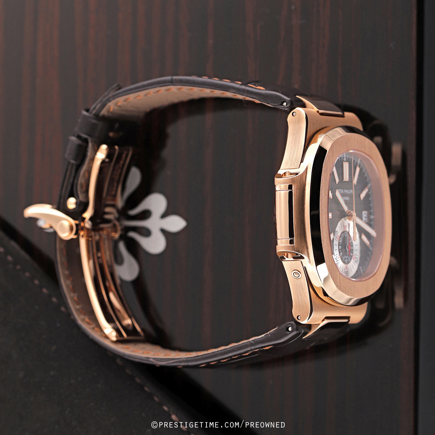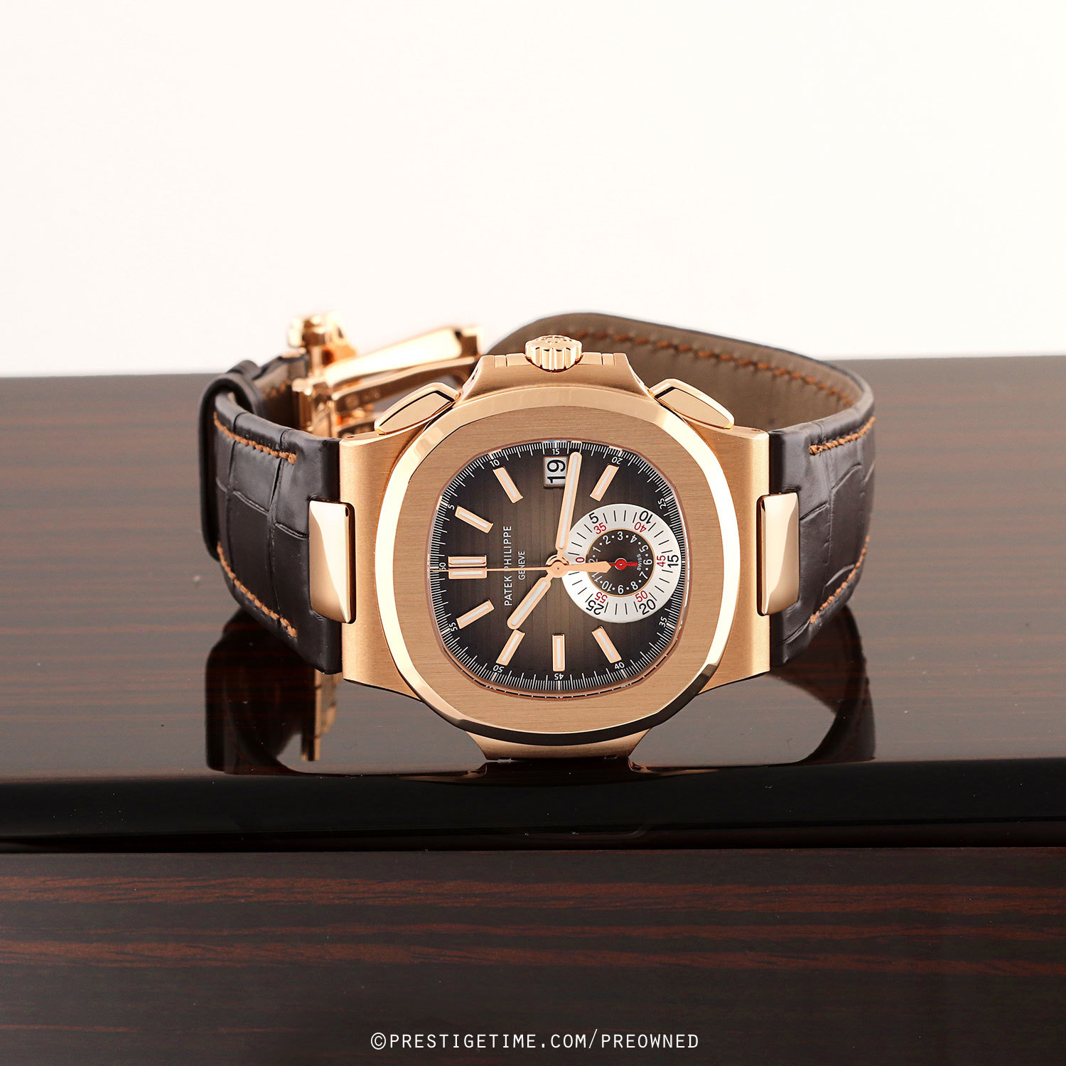 - Fitted on its original brown alligator leather strap with a solid 18kt rose gold deployant buckle. The strap is unworn.