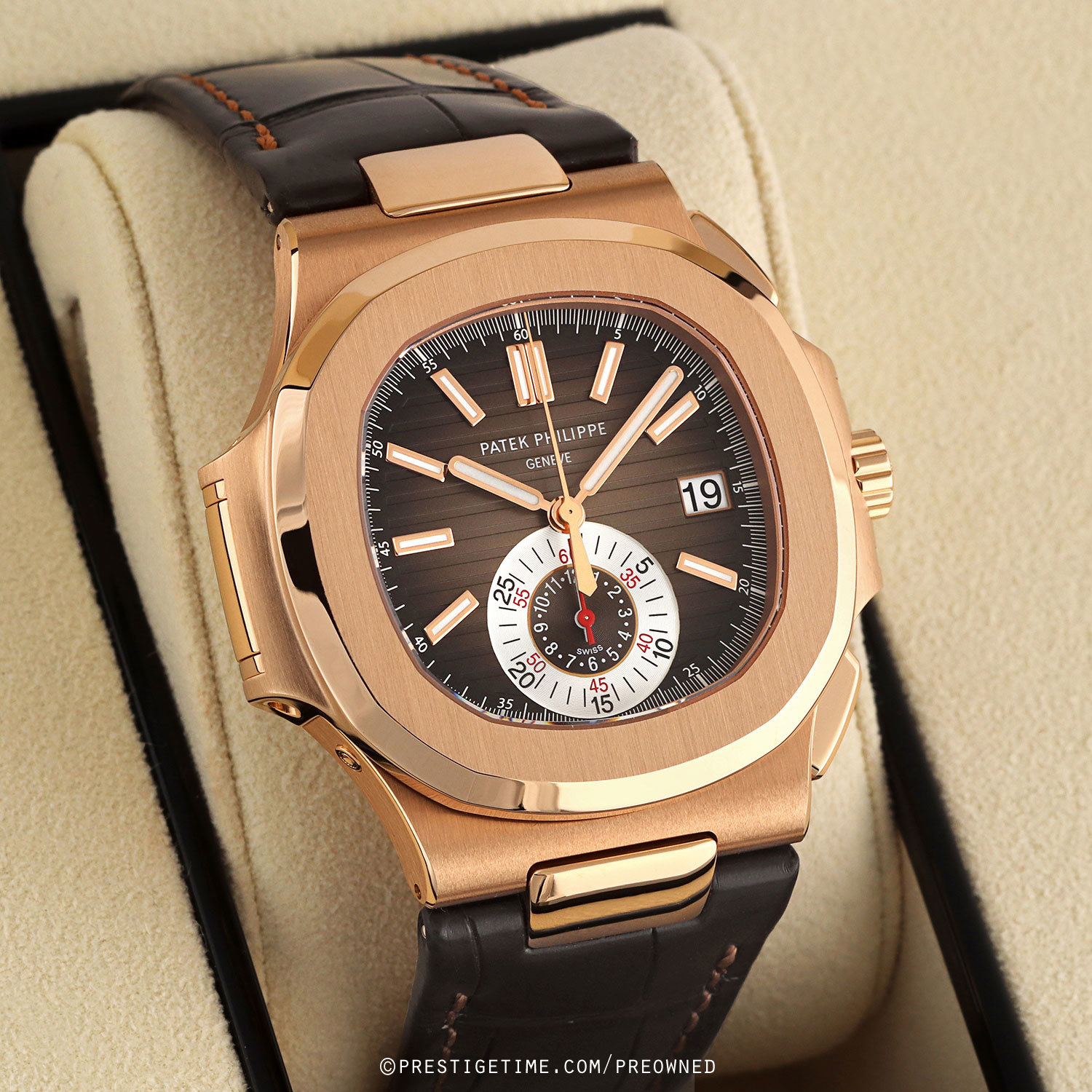 Case: Brushed & polished 18kt rose gold case. Brown gradated dial with horizontal ribbed lines design. Polished rose gold central hands, the hour & minute hands with luminous fill. Applied polished rose gold index hour markers with luminous fill. Fine printed minute/seconds & fractions of a seconds track. Date window at 3 o'clock.