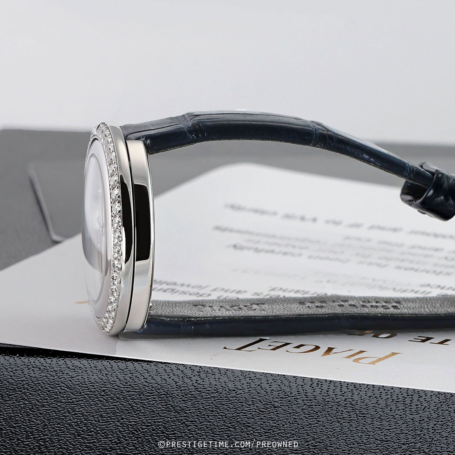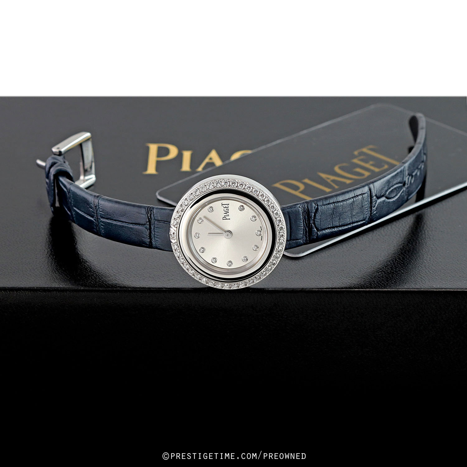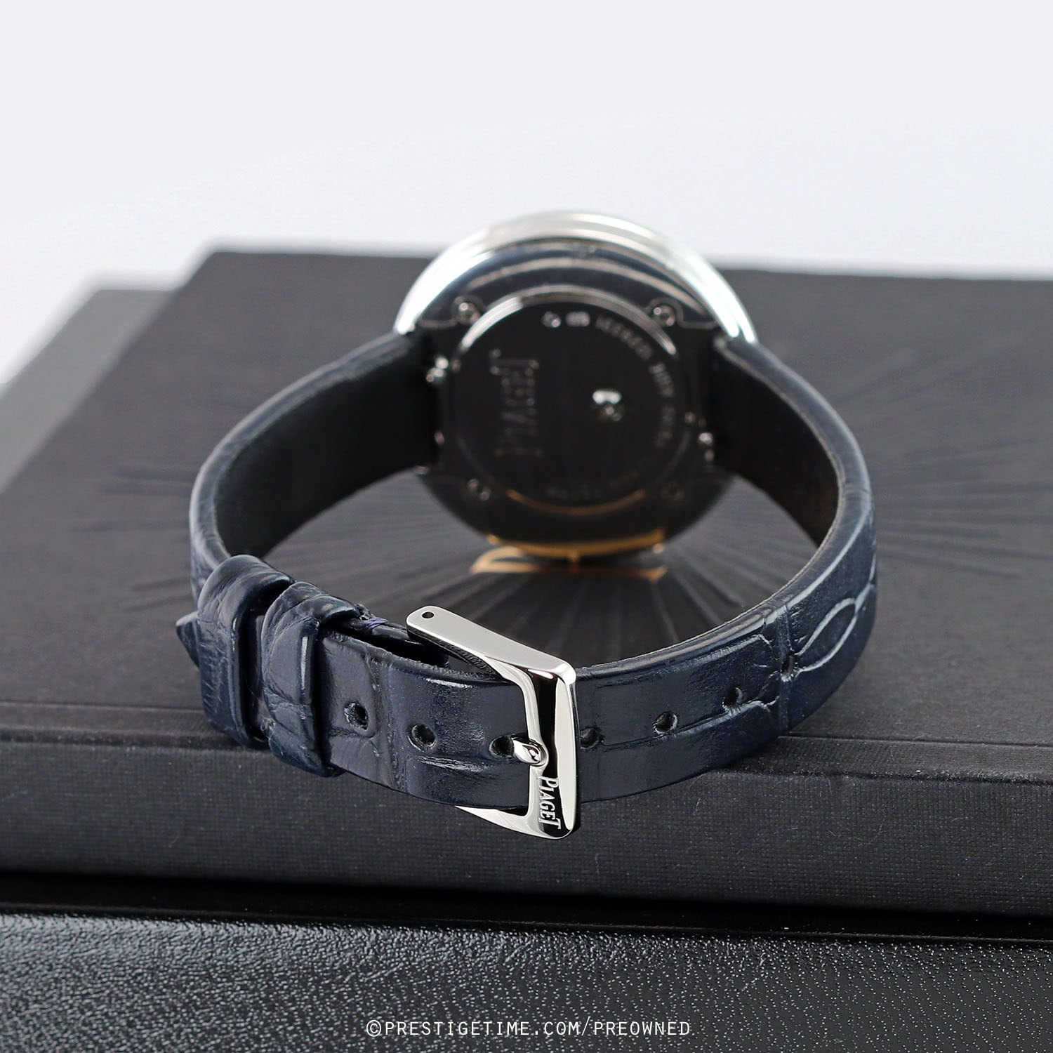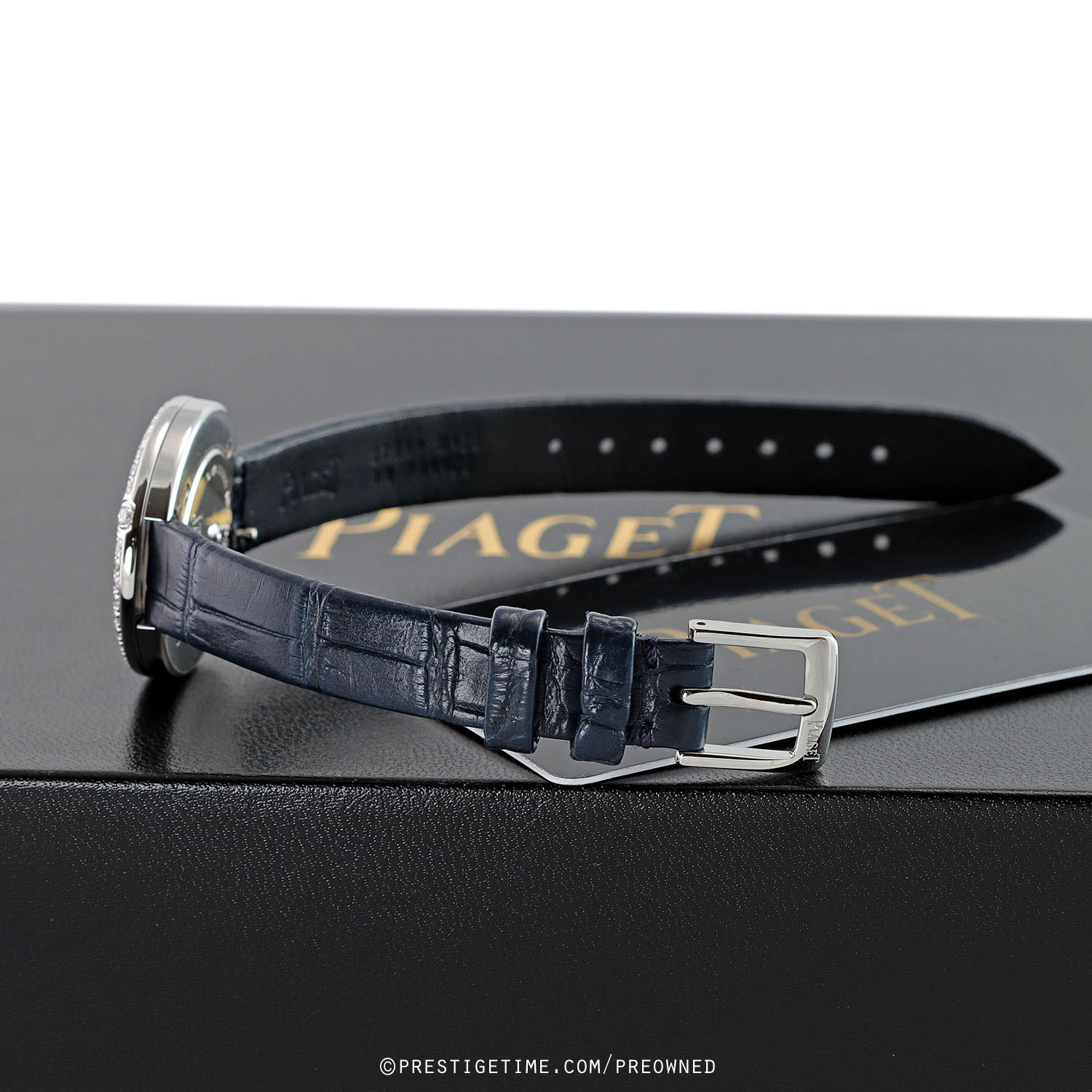 - Fitted on a Piaget original blue rolled-edge (no stitching) alligator leather strap with a polished stainless steel tang buckle. The strap is in unworn condition with its full wear lifespan remaining. However the strap does have some super light shop-wear. We would grade this strap in 99% overall condition and