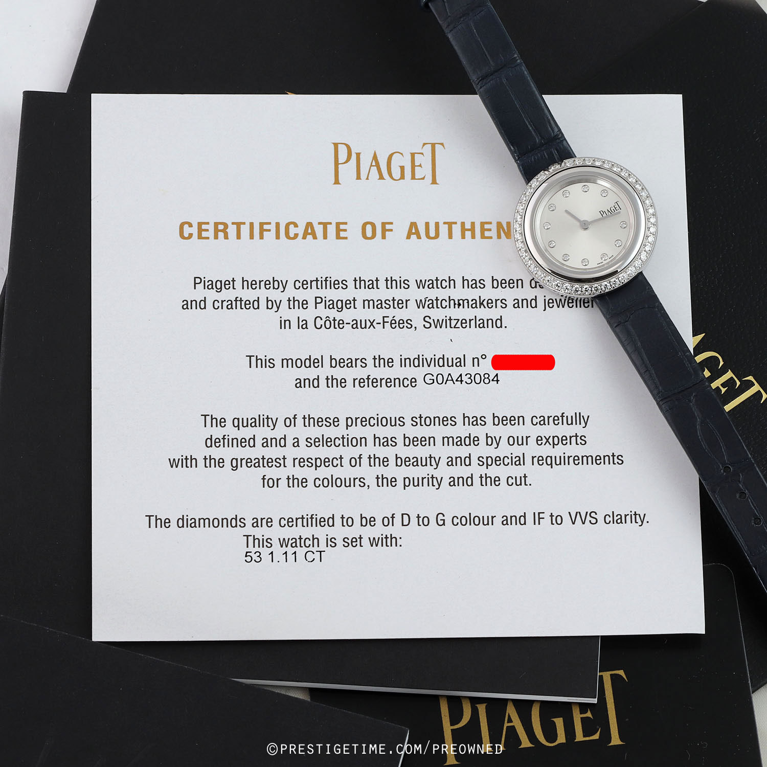 - The case & dial are set with 53 brilliant cut D-G color, IF-VVS clarity diamonds, weighing a total of +/- 1.11 carat.