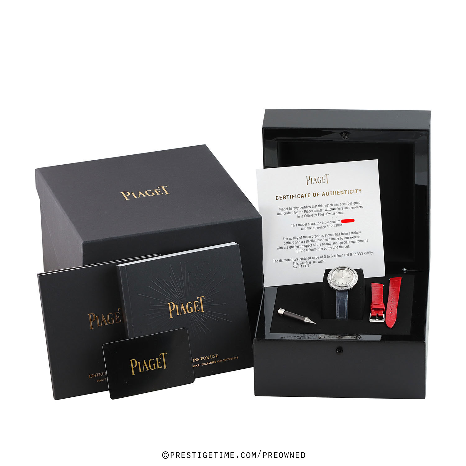 - Delivered with an additional Piaget original red rolled-edge (no stitching) alligator leather strap with a polished stainless steel tang buckle. This strap is in brand new, crisp & unworn condition with its full wear lifespan remaining.