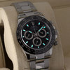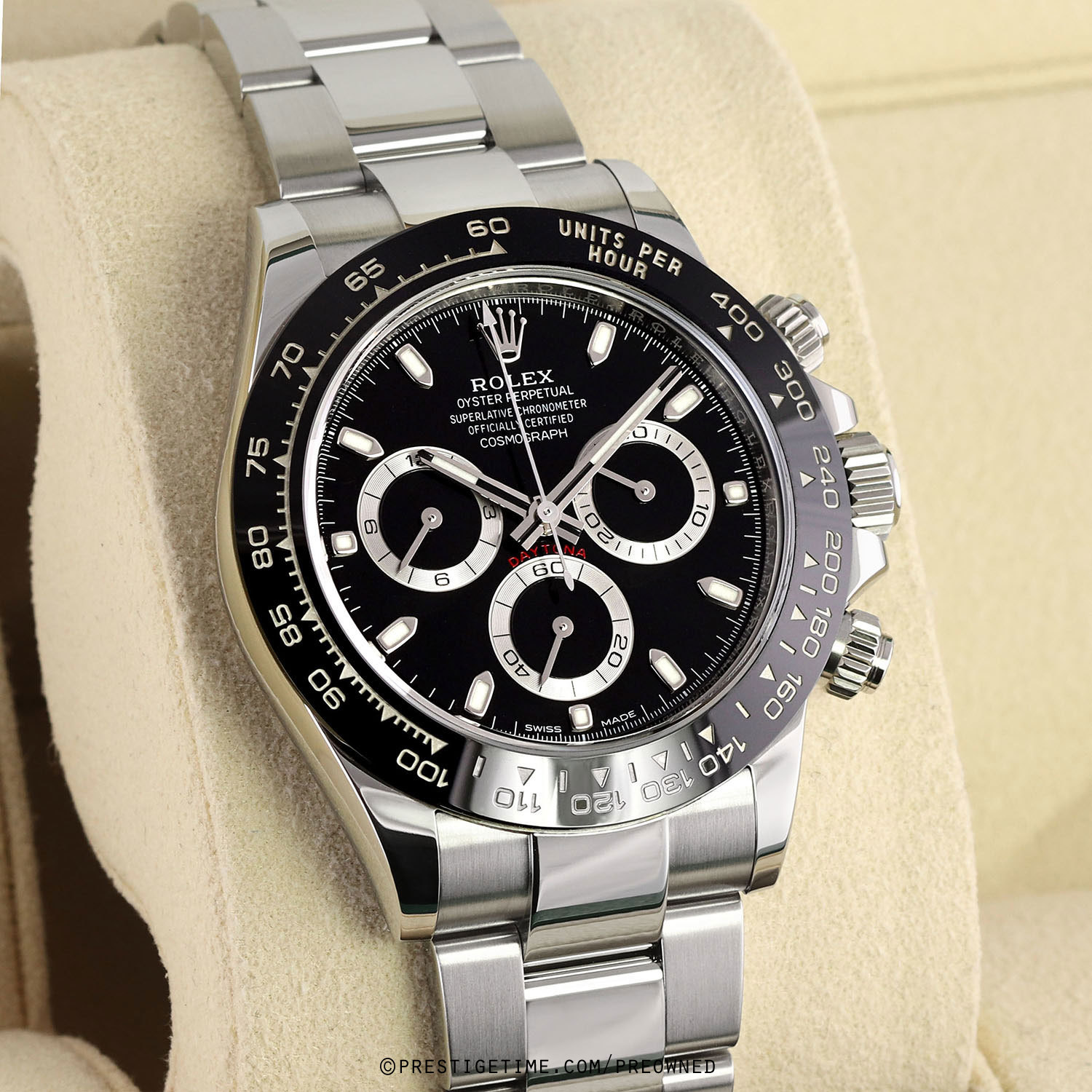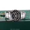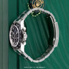Case: Polished stainless steel case & Triplock screw-down crown. Polished stainless steel chronograph buttons with screw-down collars. Polished black Cerachrom bezel, with platinum filled engraved Tachymeter scale. Black dial. Silver rimmed sub-dials. Polished hands, the hour & minute hands with partial luminous fill. Applied polished index hour markers with luminous fill. Fine printed minute/seconds & fractions of a second track on the dial perimeter. Small seconds sub-dial at 6 o'clock.