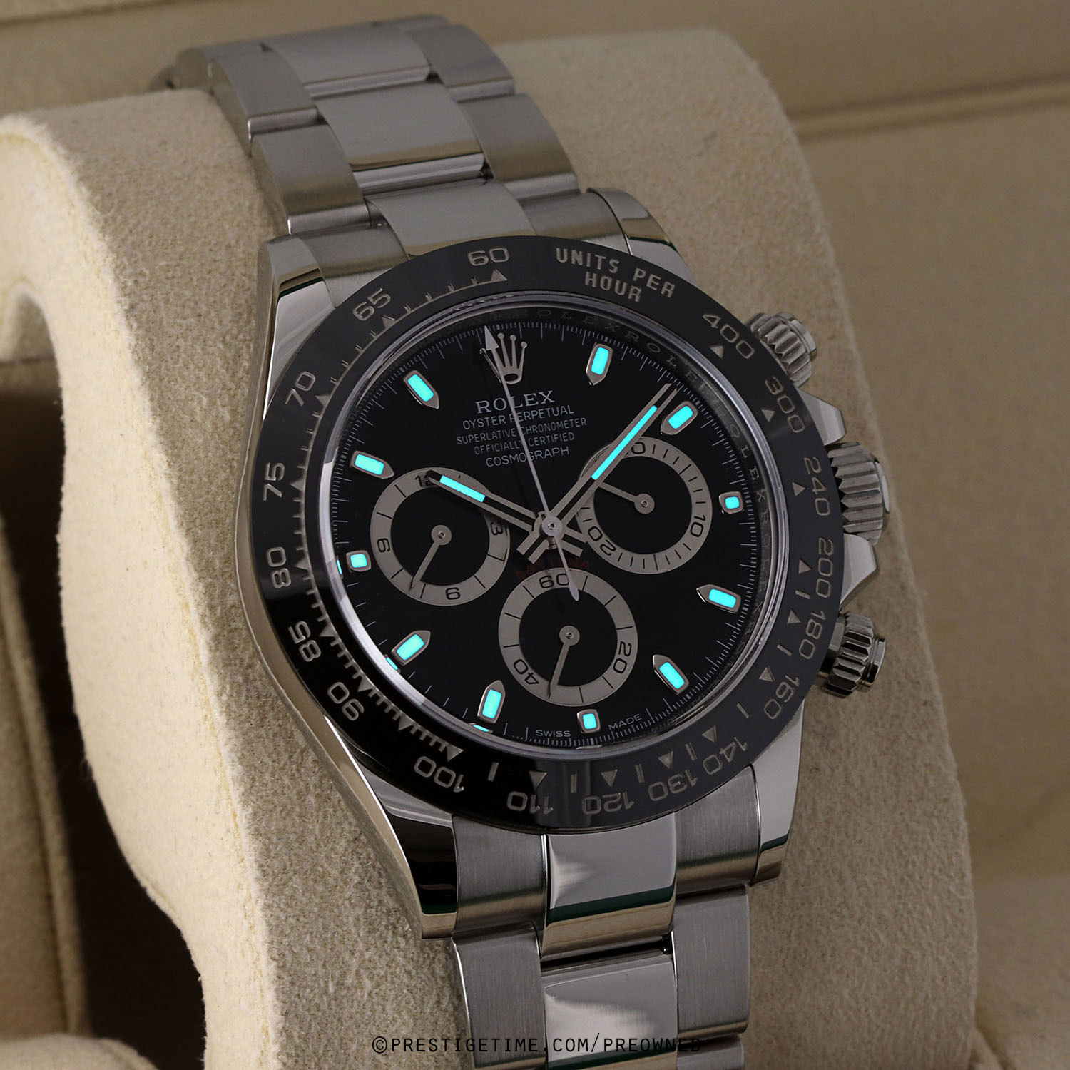 Movement: Powered by a Rolex in-house Superlative Chronometer certified calibre 4130, beats at 28,800 vph, composed out of 290 parts, contains 44 jewels & has an power reserve of of 72 hour running the time only, or 66 hours with the chronograph function running.