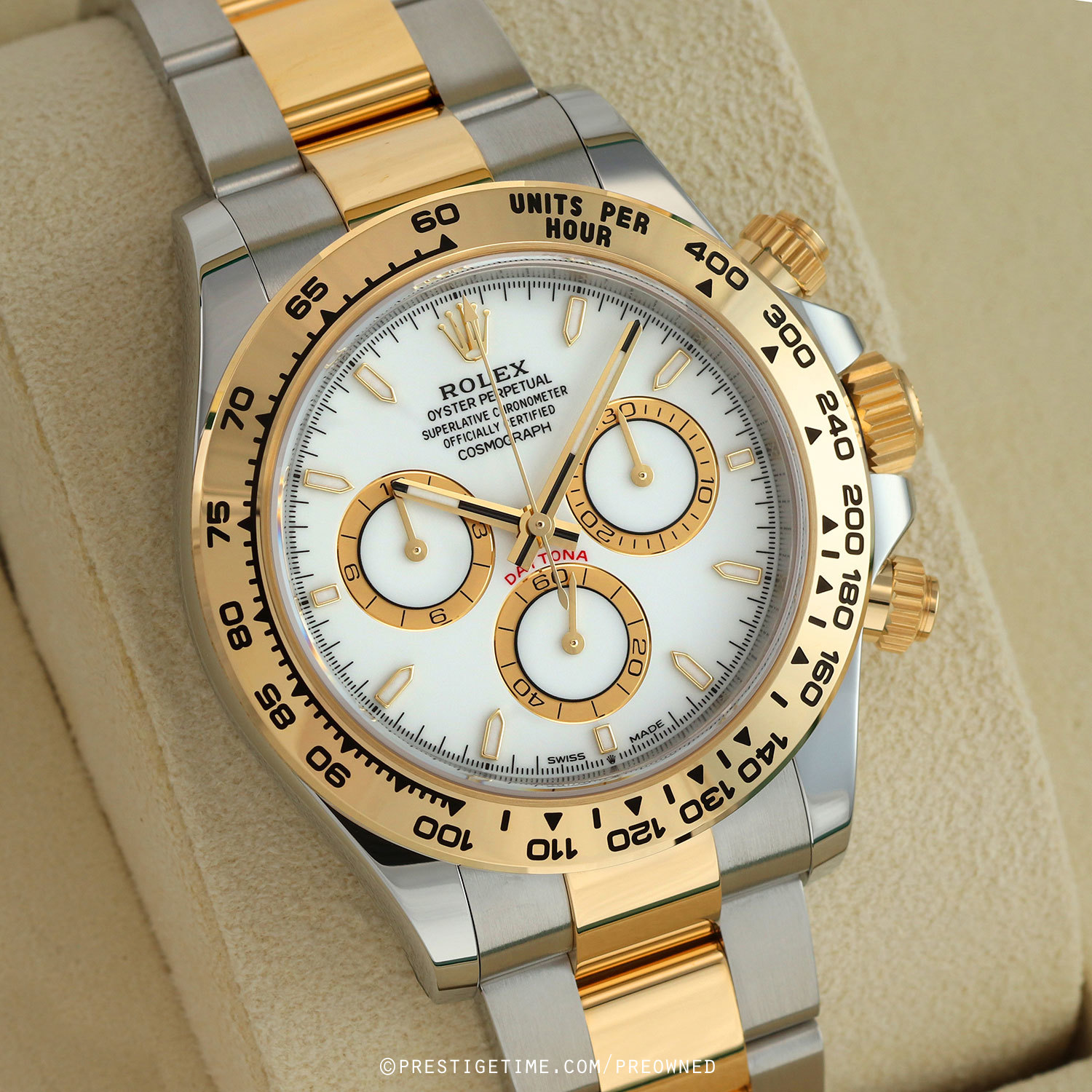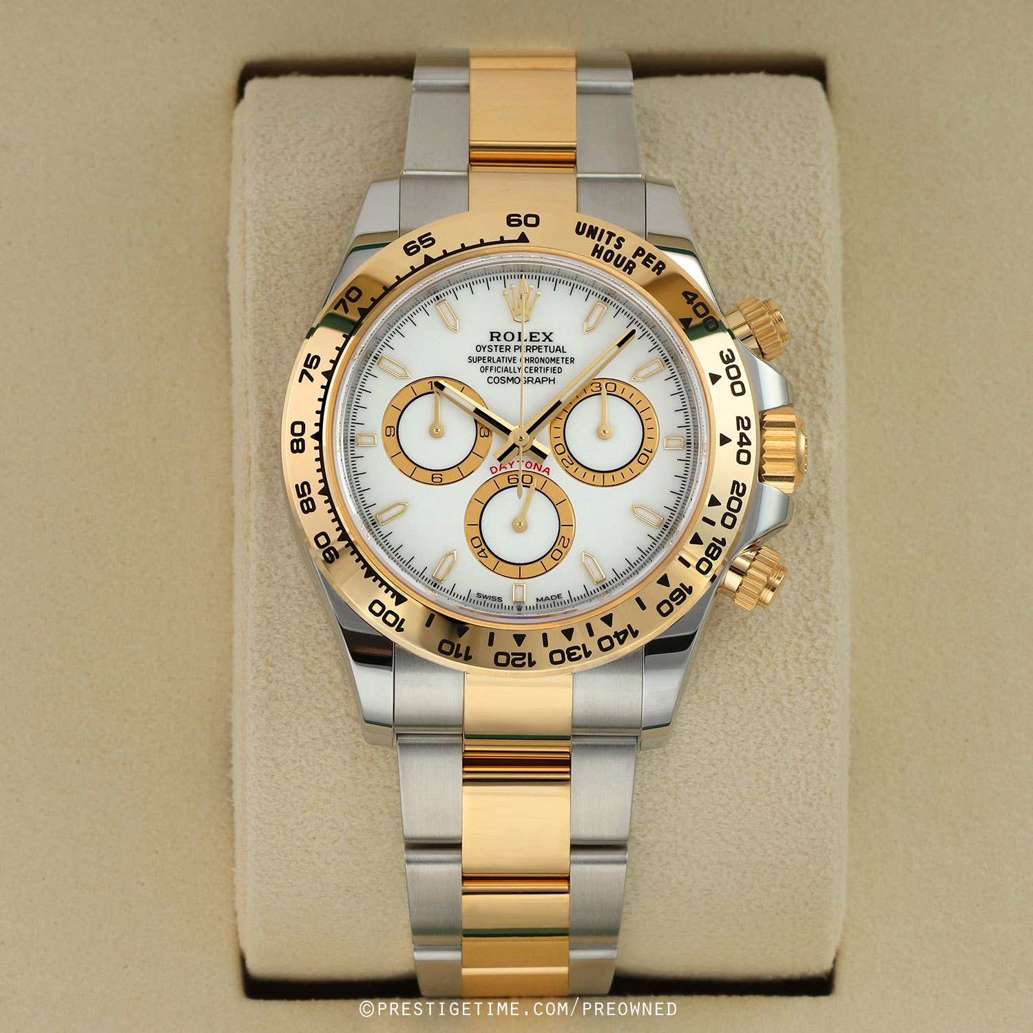 Case: Polished stainless steel case. Polished 18kt yellow gold Triplock screw-down crown, chronograph buttons with screw-down collars and bezel with an engraved & black filled Tachymeter scale. White main dial. Champagne rimmed white sub-dials. Polished yellow gold hands, the hour & minute hands with partial luminous fill. Applied polished yellow gold hour markers with luminous fill. Fine printed minute/seconds & fractions of a second track on the dial perimeter. Small seconds sub-dial at 6 o'clock.