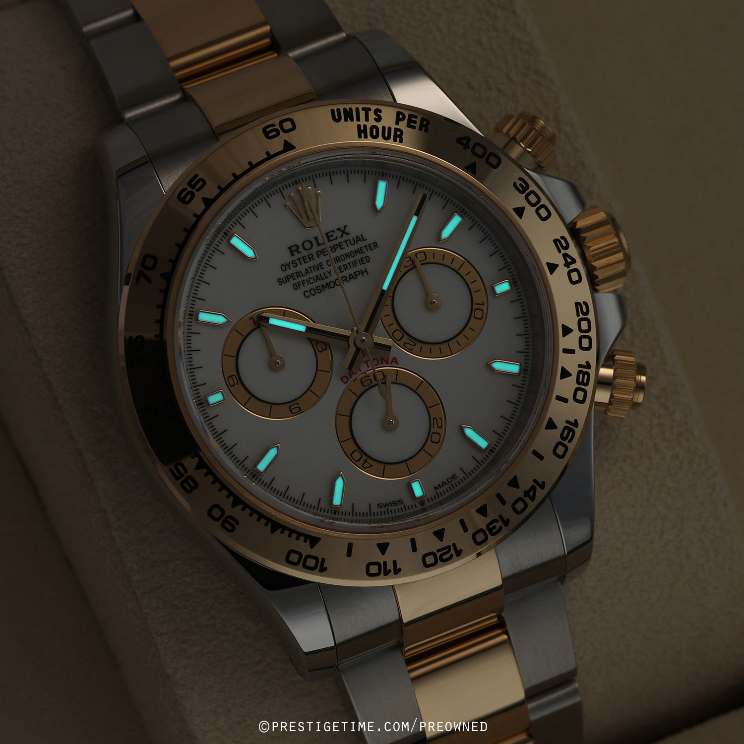 Movement: Powered by a Rolex in-house calibre 4131, beats at 28,800 vph (4Hz), contains 47 jewels & has a power reserve of +/- 72 hours (3 days). Superlative Chronometer (COSC + Rolex certification after casing). The movement features a Paramagnetic blue Parachrom hairspring, high performance Paraflex shock absorbers and a bi-directional self-winding rotor.