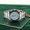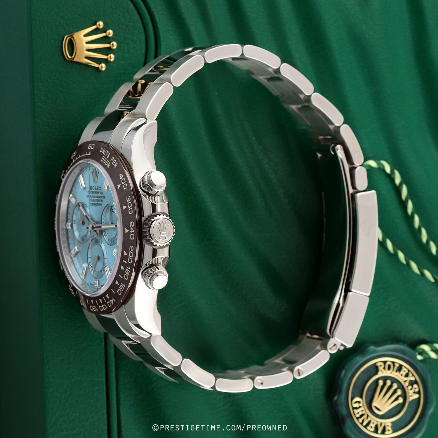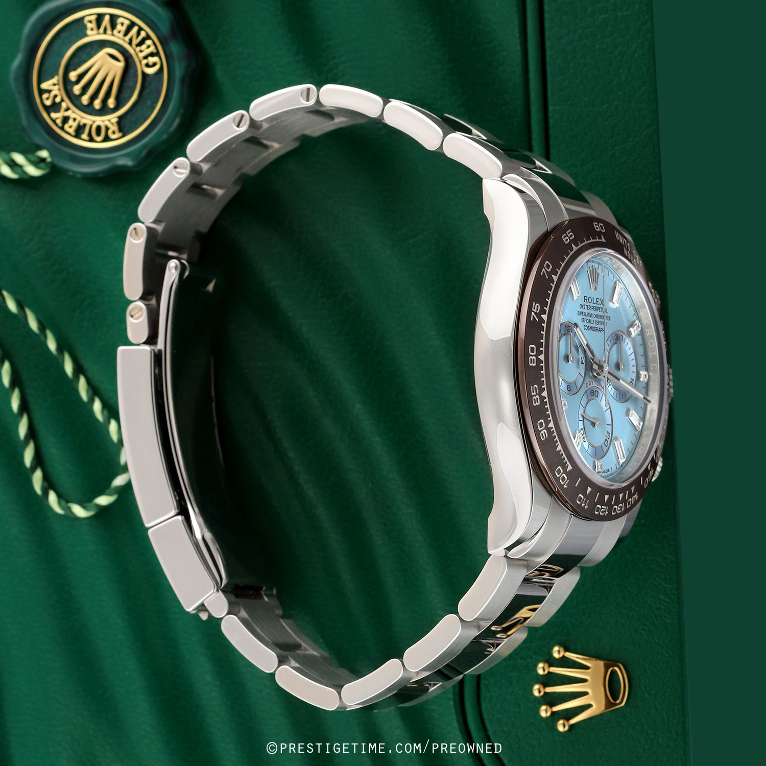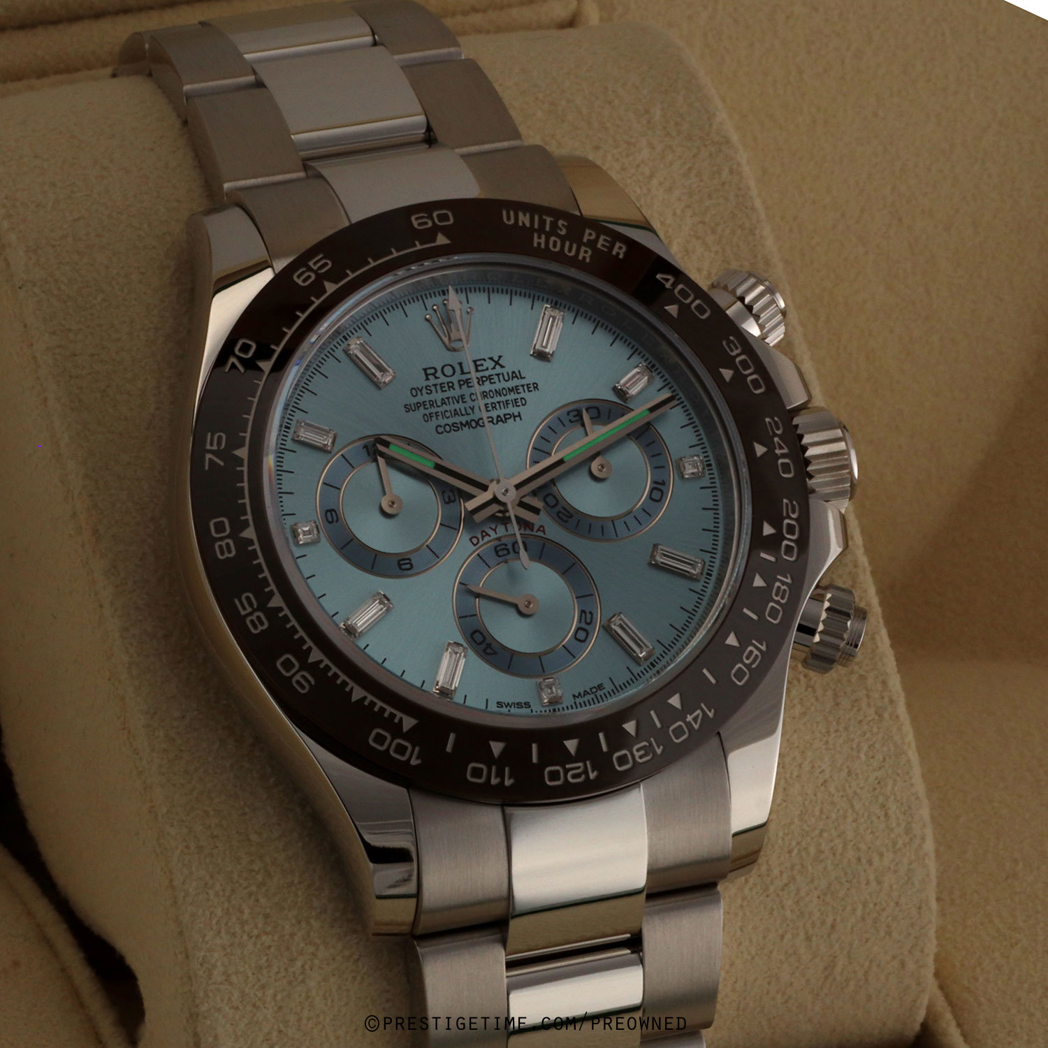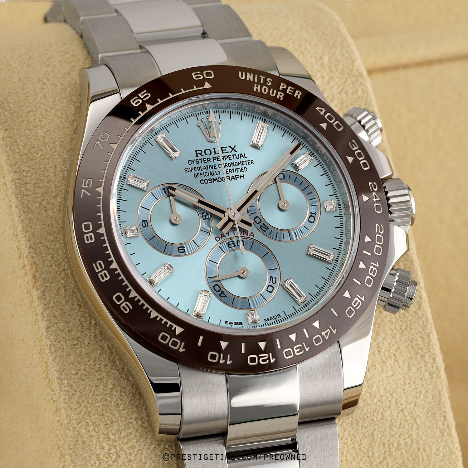 Case: Brushed & polished solid 950 platinum case. Polished Triplock screw-down crown. Polished platinum chronograph buttons with screw-down collars. Polished chestnut-brown Cerachrom bezel, with platinum filled engraved Tachymeter scale. Ice-Blue dial factory set with 11 baguette diamond hour markers. Polished hands, the hour & minute hands with partial luminous fill. Fine printed minute/seconds & fractions of a second track on the dial perimeter. Small seconds sub-dial at 6 o'clock.