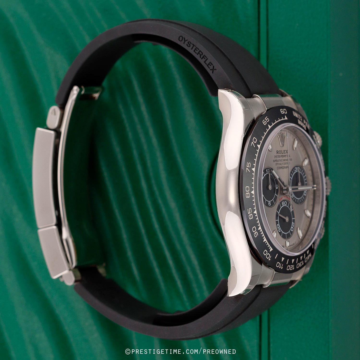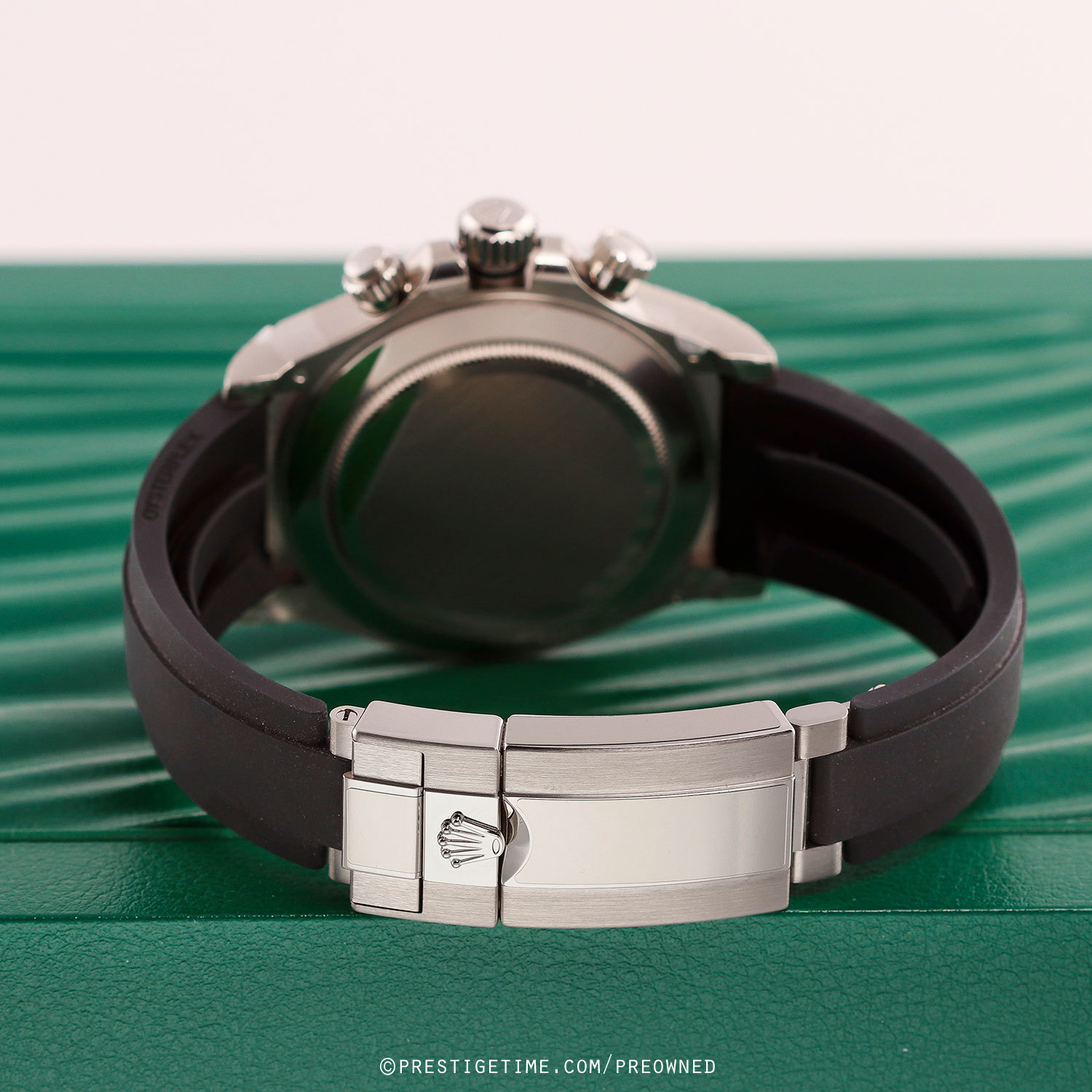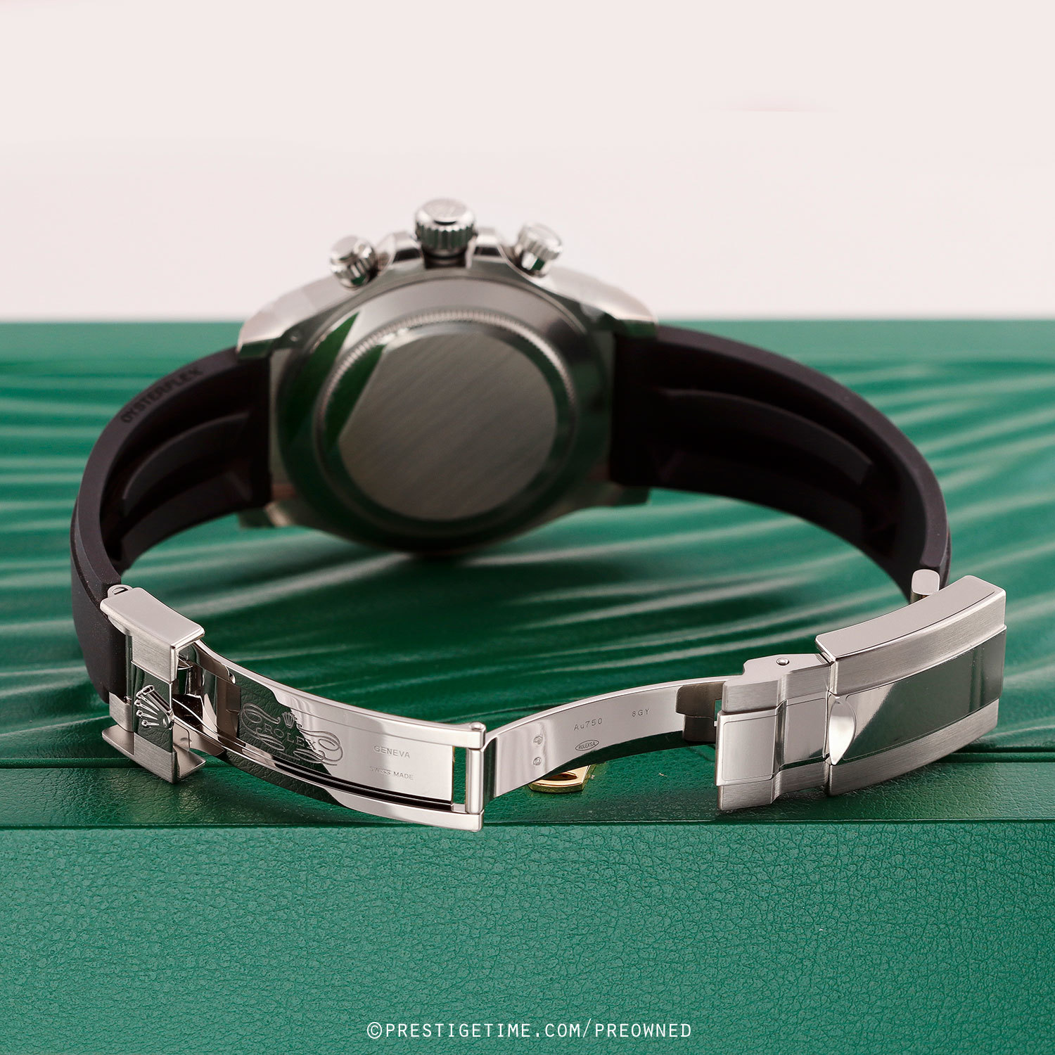 - OEM Rolex Oysterflex strap, constructed of flexible metal blades overmoulded with high-performance elastomer.