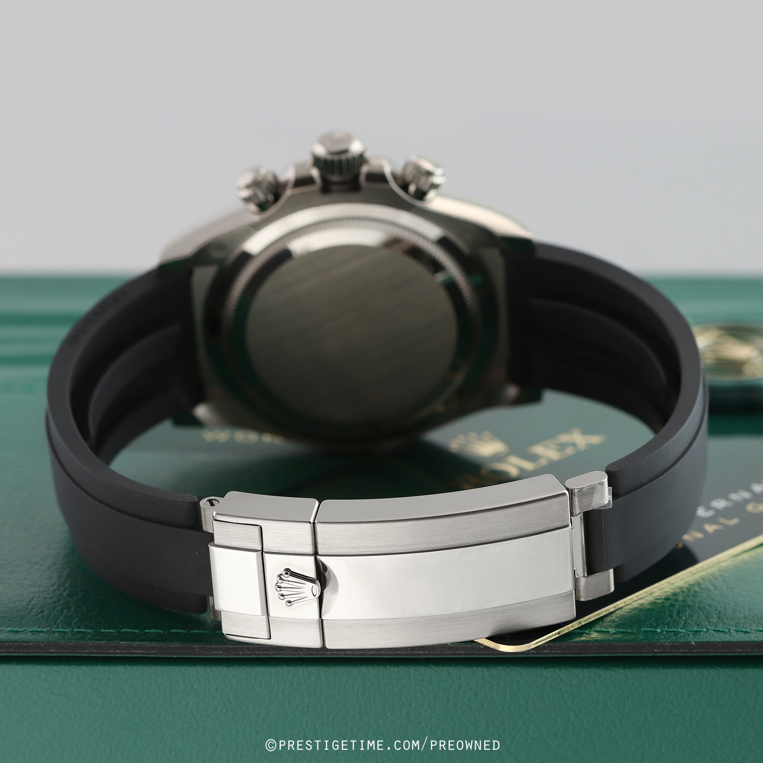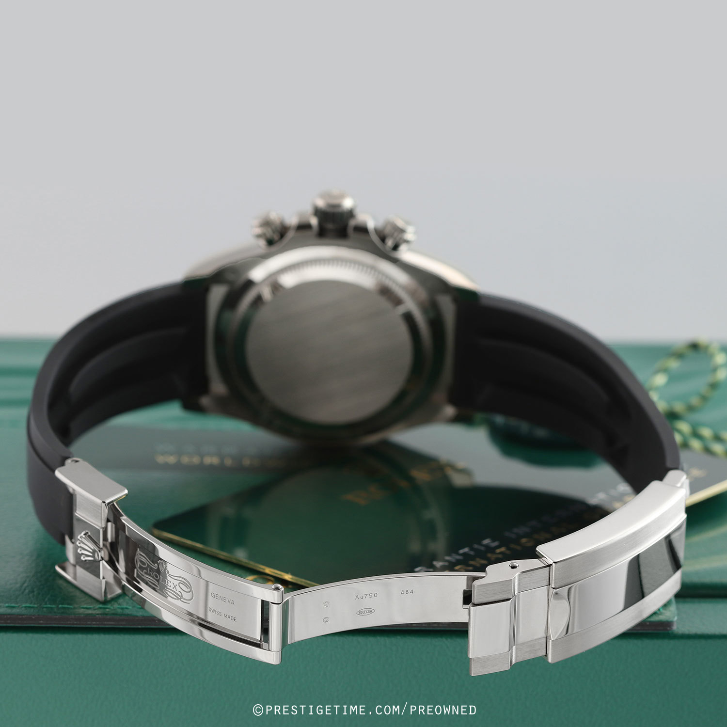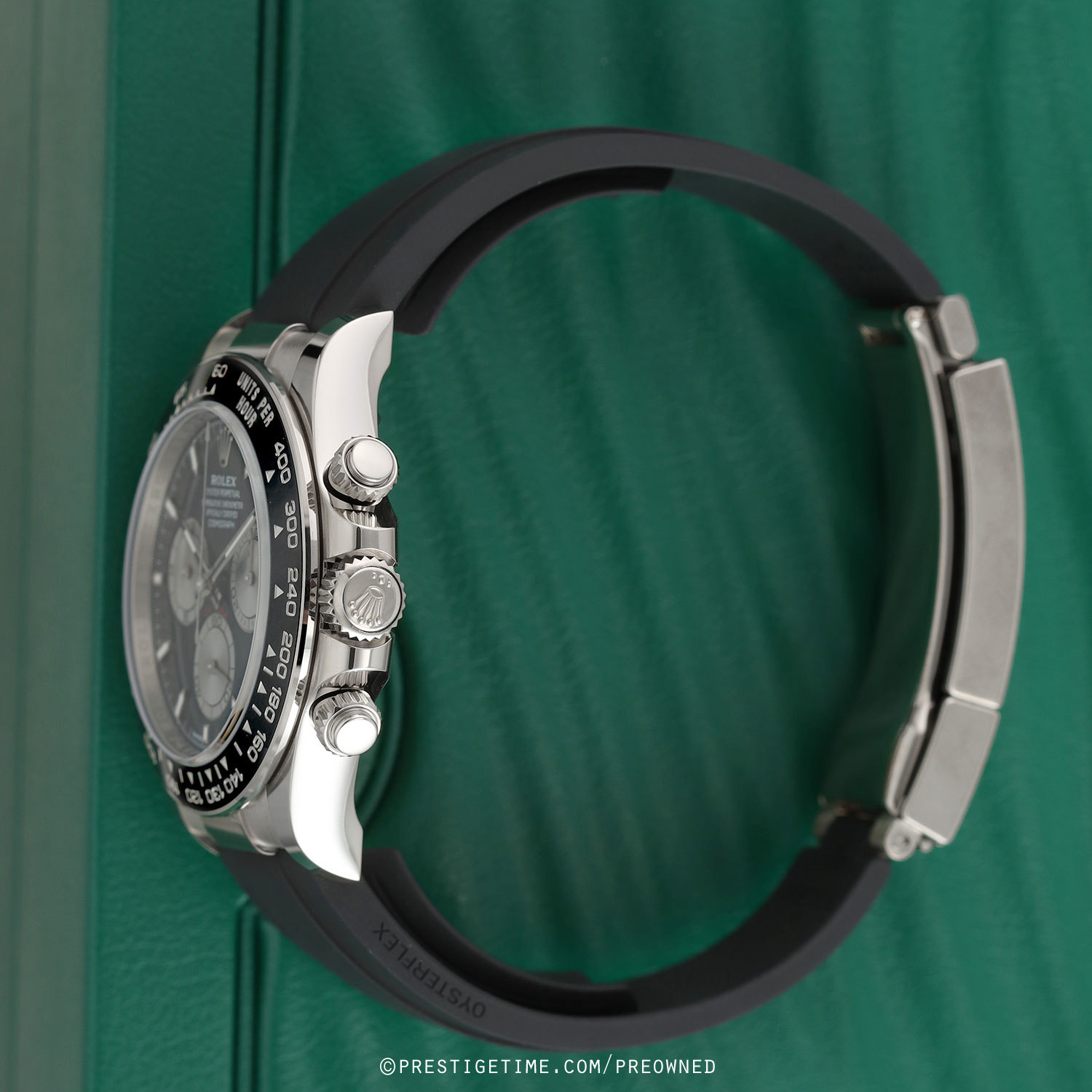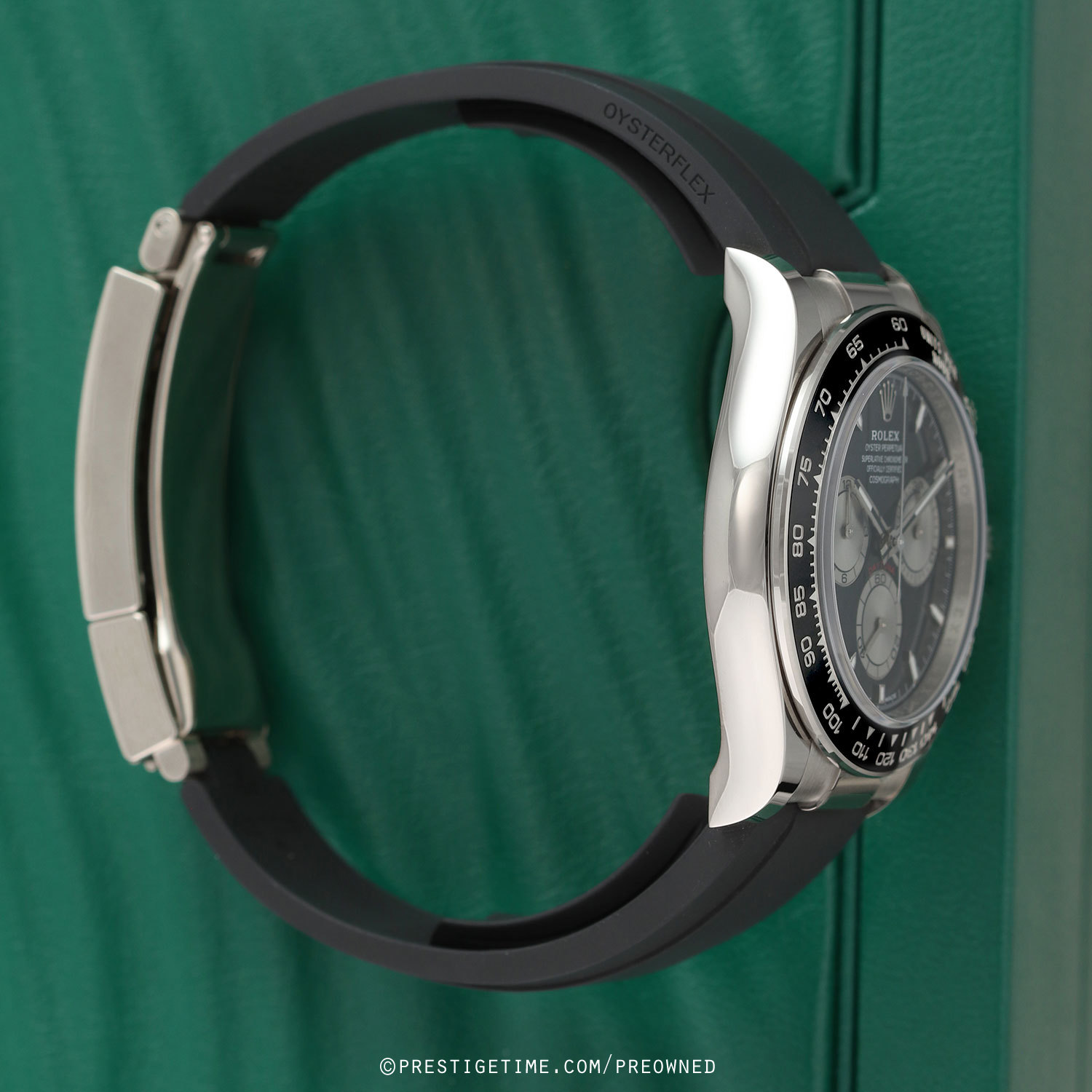Strap: Fitted on its original Rolex Oysterflex strap, constructed of flexible metal blades overmoulded with high-performance elastomer. Features a solid 18kt white gold folding Oysterlock safety clasp with a Glidelock Extension System. The strap length is medium-to-large & will fit between a 7.25" to 7.75" wrist (F & F lengths). Different strap lengths can be exchanged at no cost.