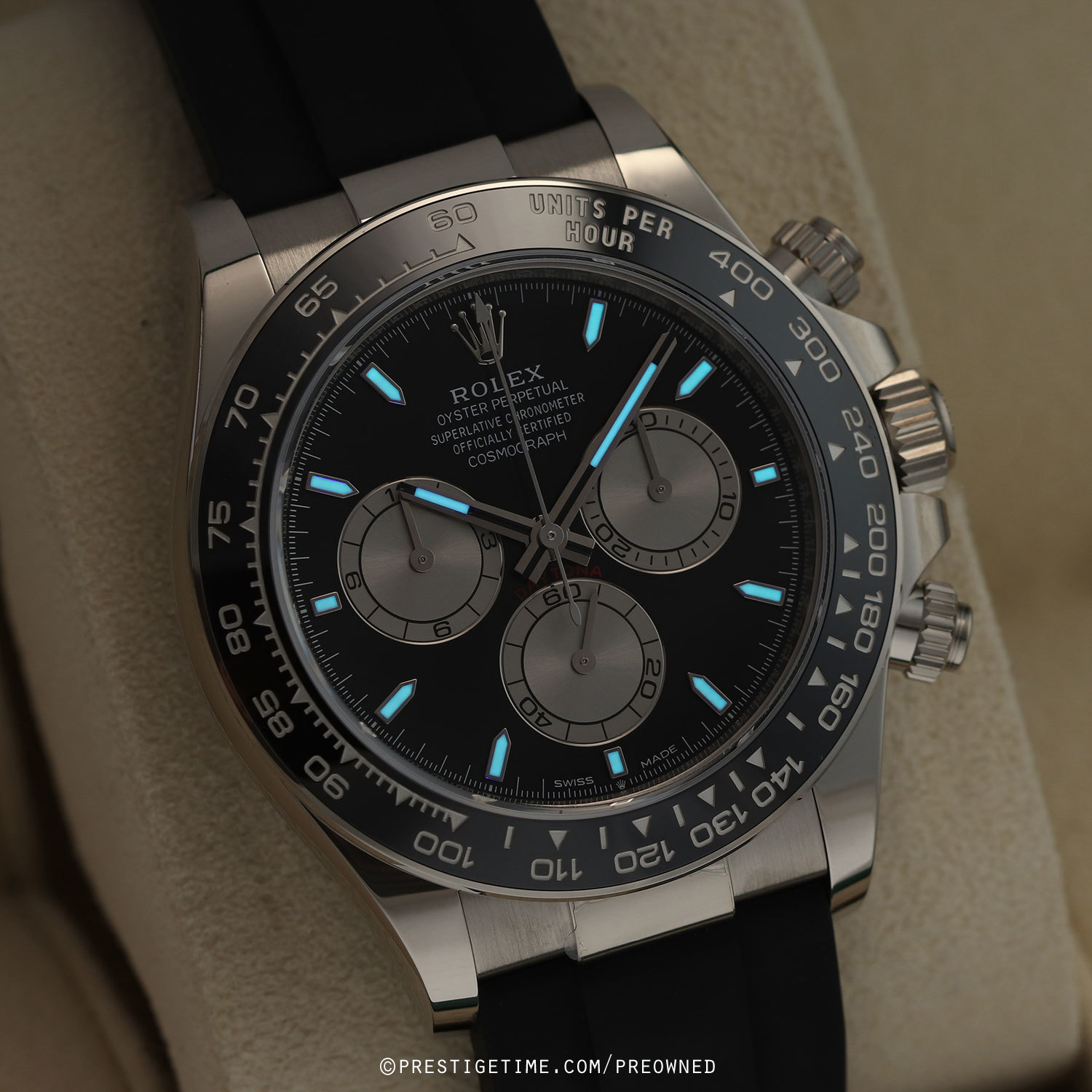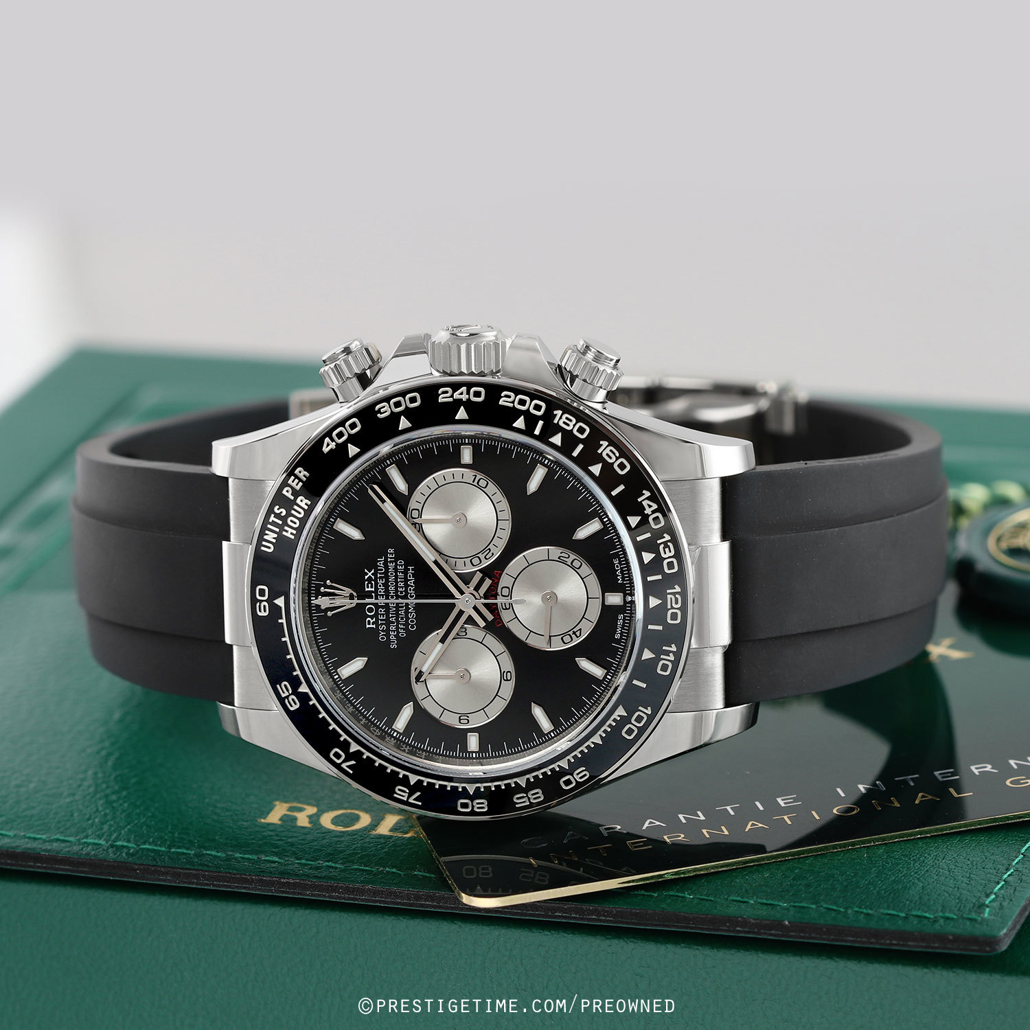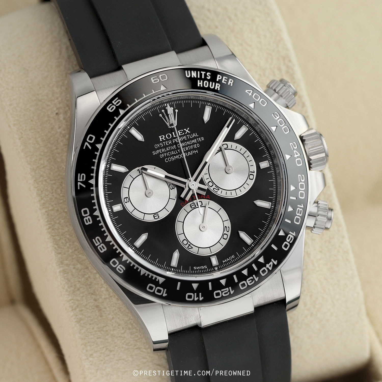 Case: Polished 18kt white gold case. Triplock screw-down crown. Chronograph buttons with screw-down collars. Polished black Cerachrom bezel with engraved Tachymeter scale. Bright black dial with steel-silver sub-dials. Polished white gold hands, the hour & minute hands with partial luminous fill. Applied polished white gold index hour markers with luminous fill. Fine printed minute/seconds & fractions of a second track on the dial perimeter. Small seconds sub-dial at 6 o'clock.