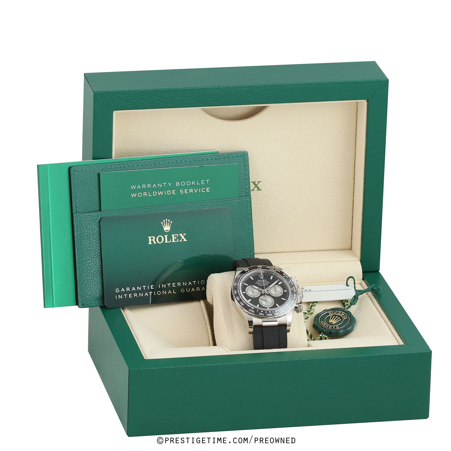 Condition: This watch is in excellent near new condition. Worn carefully by its original owner, we have had this watch lightly spot buffed to remove whatever light signs of wear were present. We would be comfortable rating this watch in an 98% overall condition. Delivered in its original box with all papers (warranty card dated 03/2024), with both the green Rolex hologram and white serialized hang tags.
