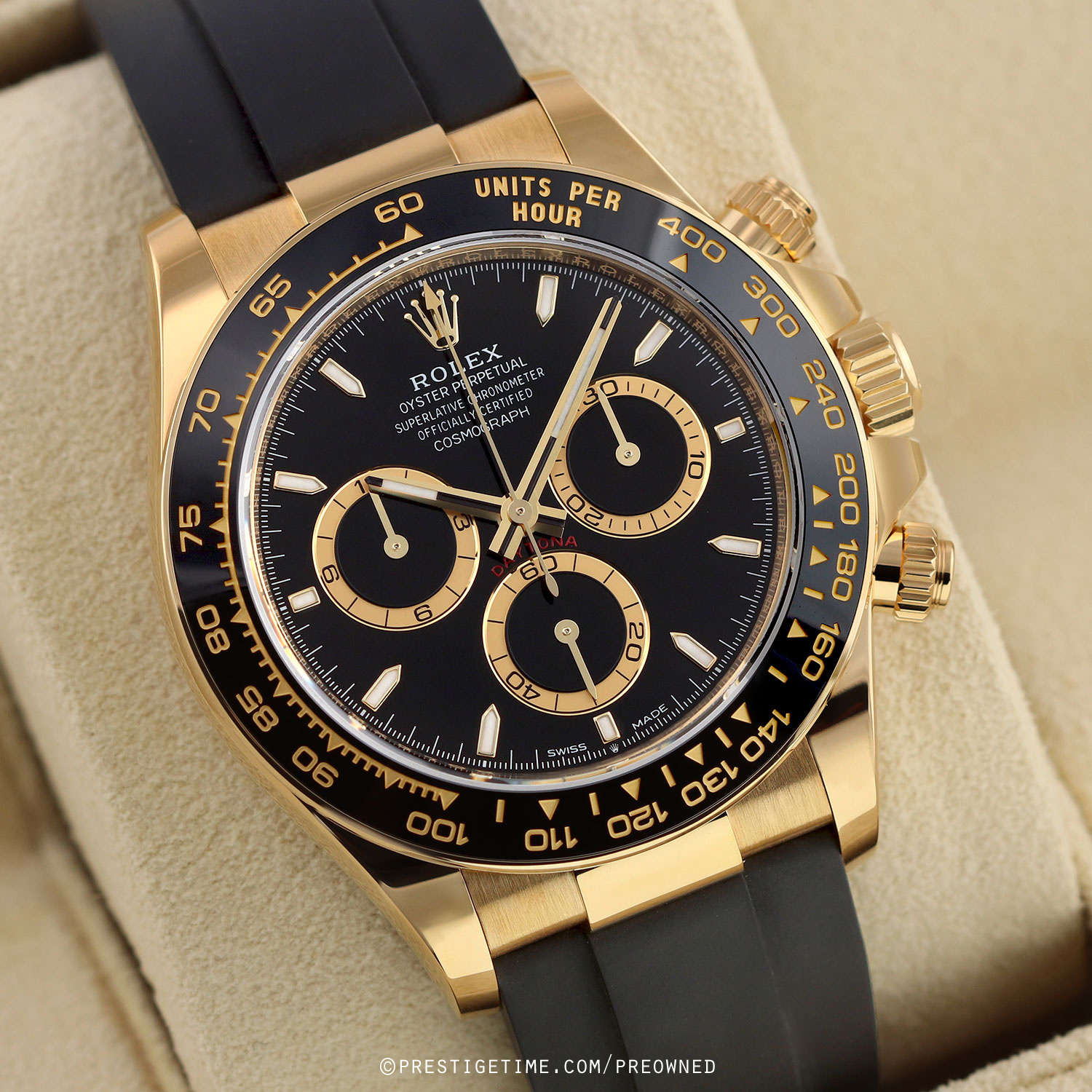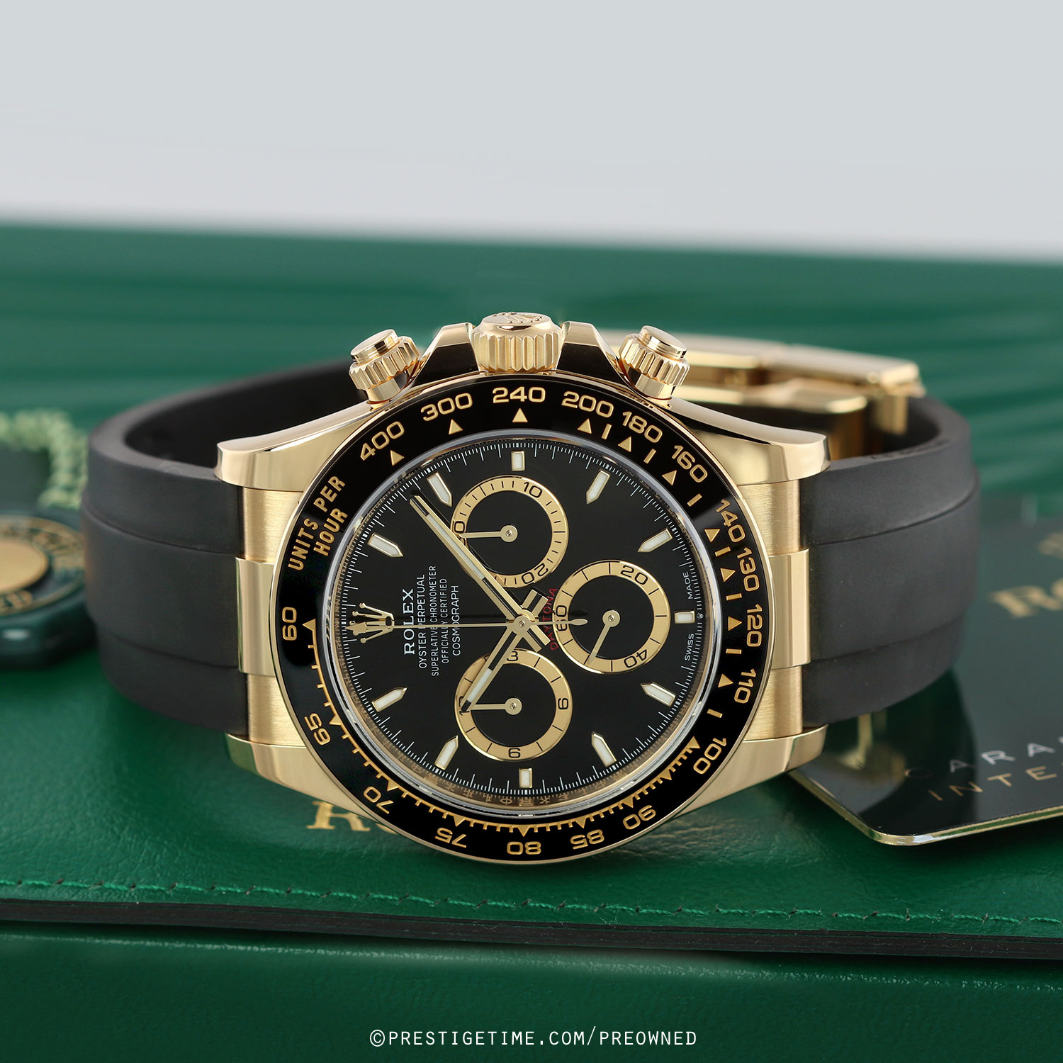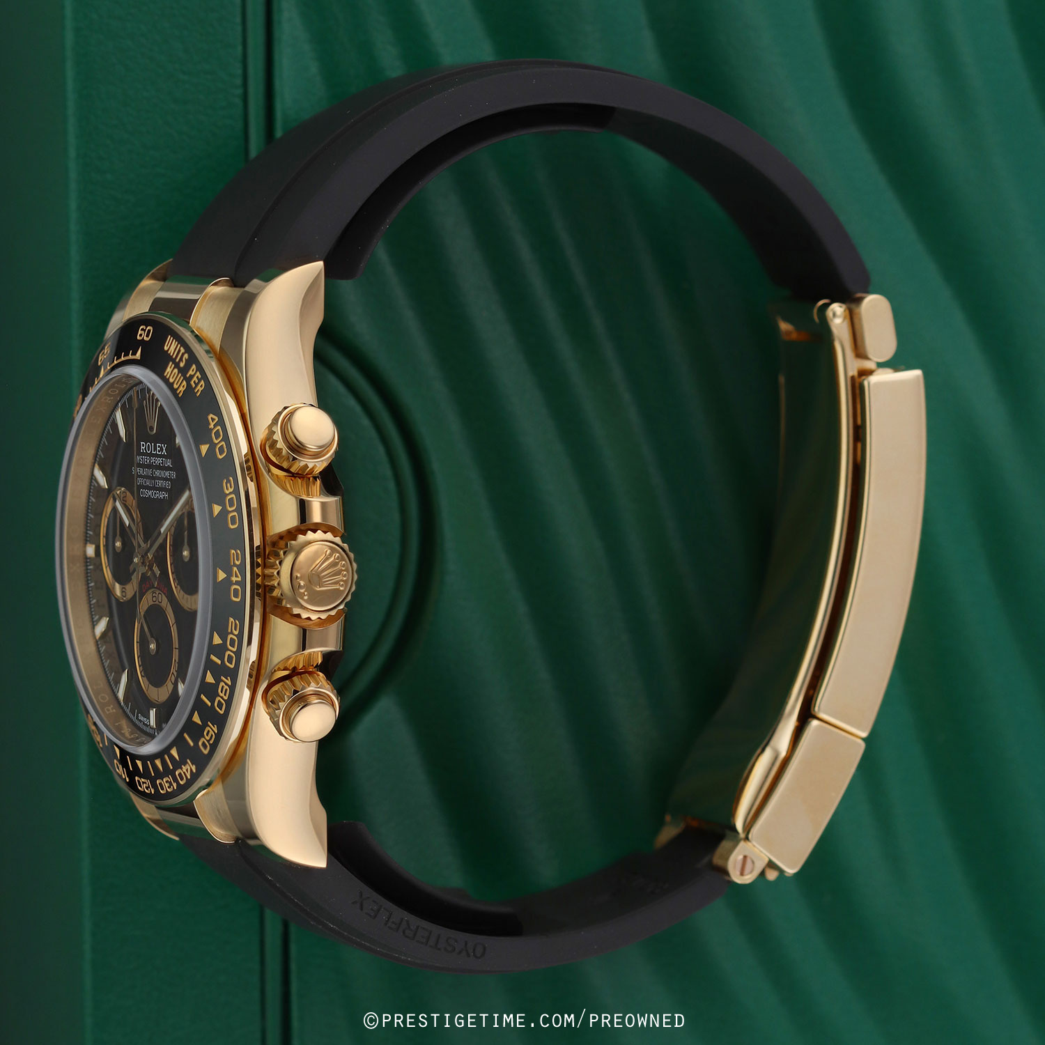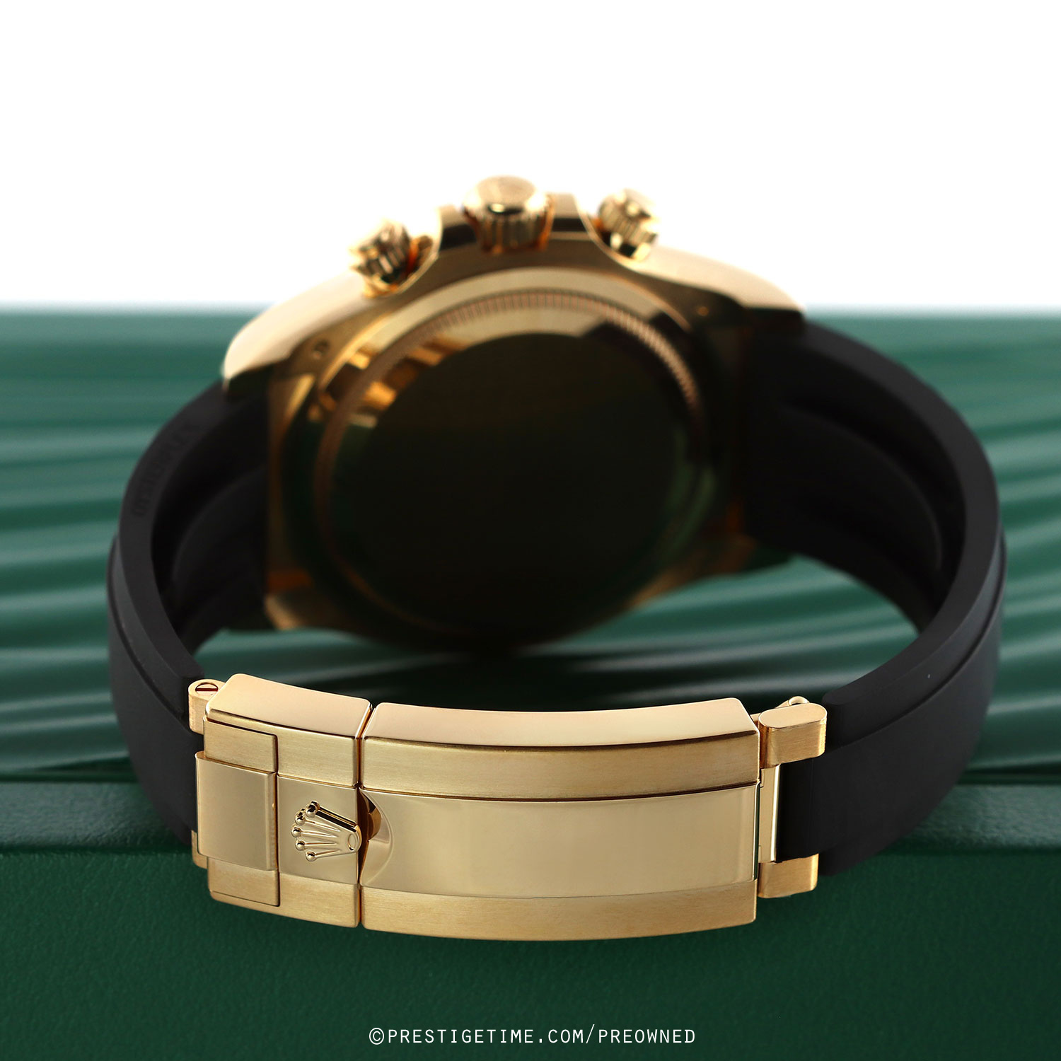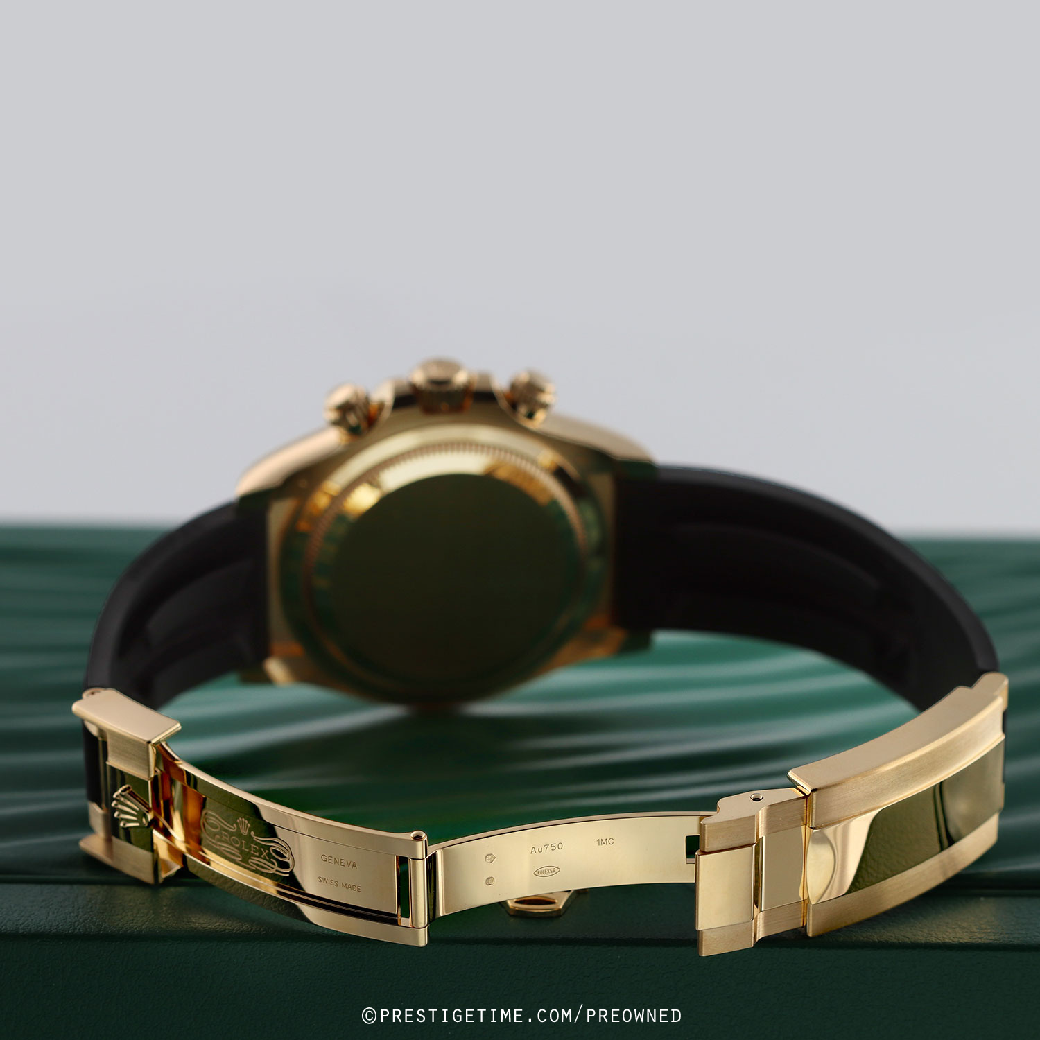 Strap: Fitted on its original Rolex Oysterflex strap, constructed of flexible metal blades overmoulded with high-performance elastomer. Features a solid 18kt yellow gold folding Oysterlock safety clasp with a Glidelock Extension System.