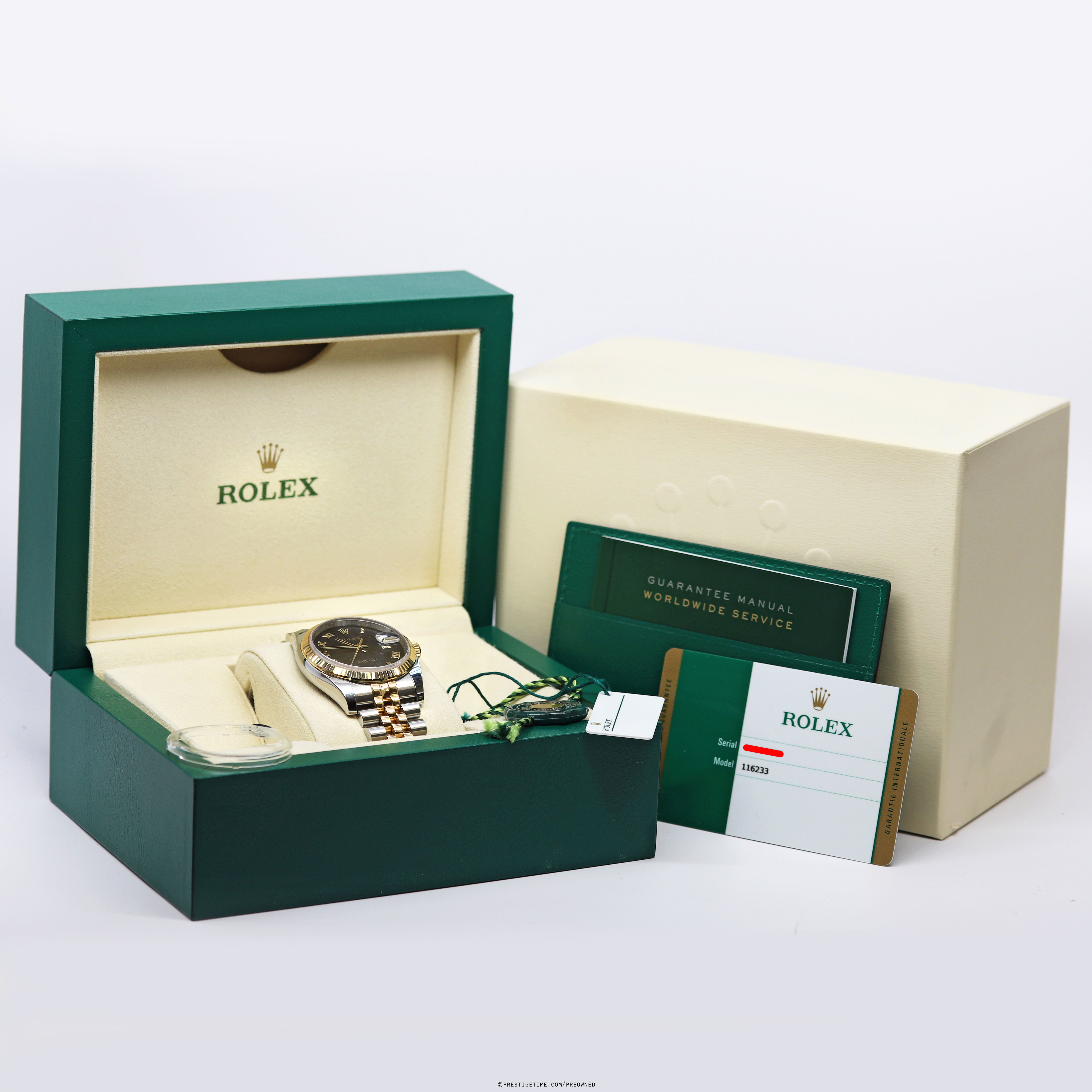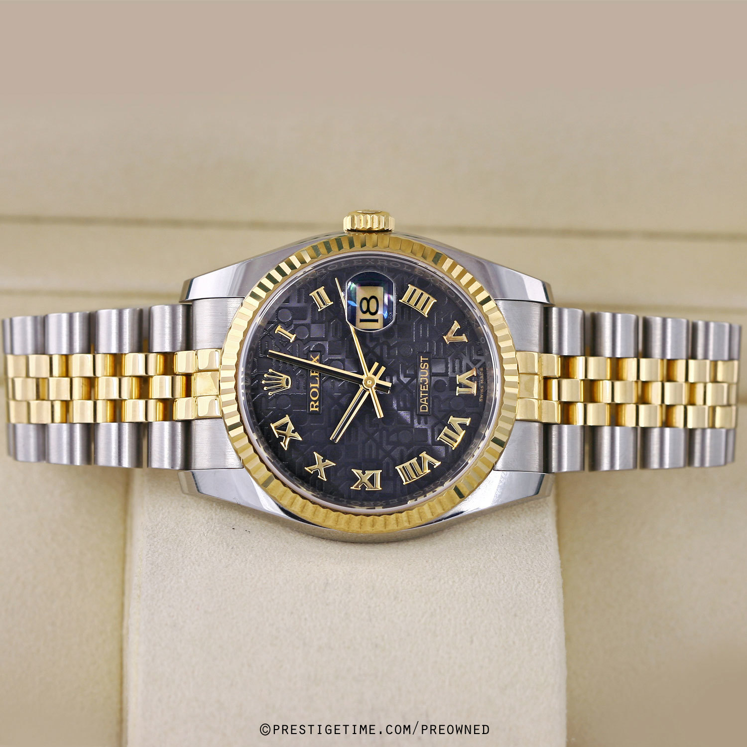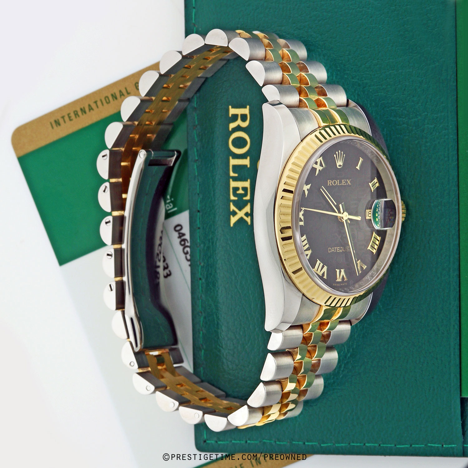 Case: Polished stainless steel case. Polished 18kt yellow gold fluted bezel & crown. Black dial with ROLEX motif, & applied polished yellow gold Roman Numeral hour markers.Polished yellow gold hands. Date window at 3 with cyclops magnifier.