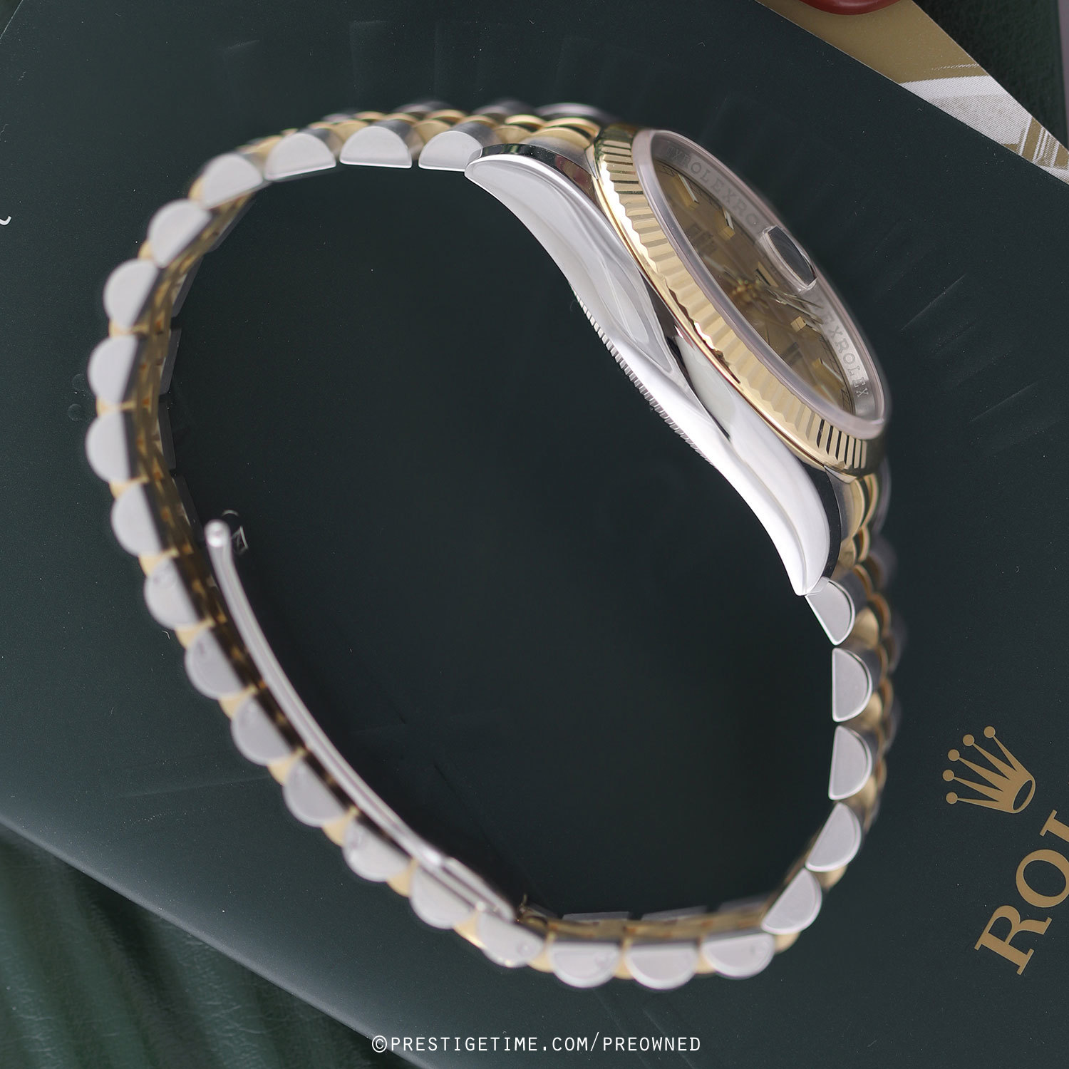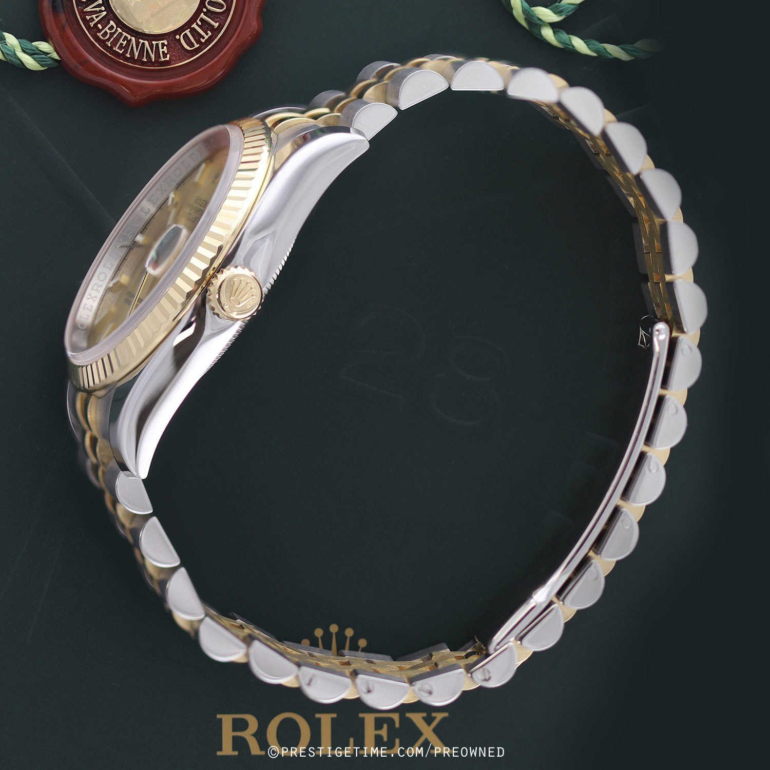 Case: Polished stainless steel case. Polished 18kt yellow gold fluted bezel & crown. Champagne dial. Polished 18kt yellow gold hands, hour & minute hands with luminous fill. Applied polished yellow gold index hour markers with luminous fill. Fine printed minute/seconds track. Date at 3 o'clock with cyclops magnifier on the crystal.