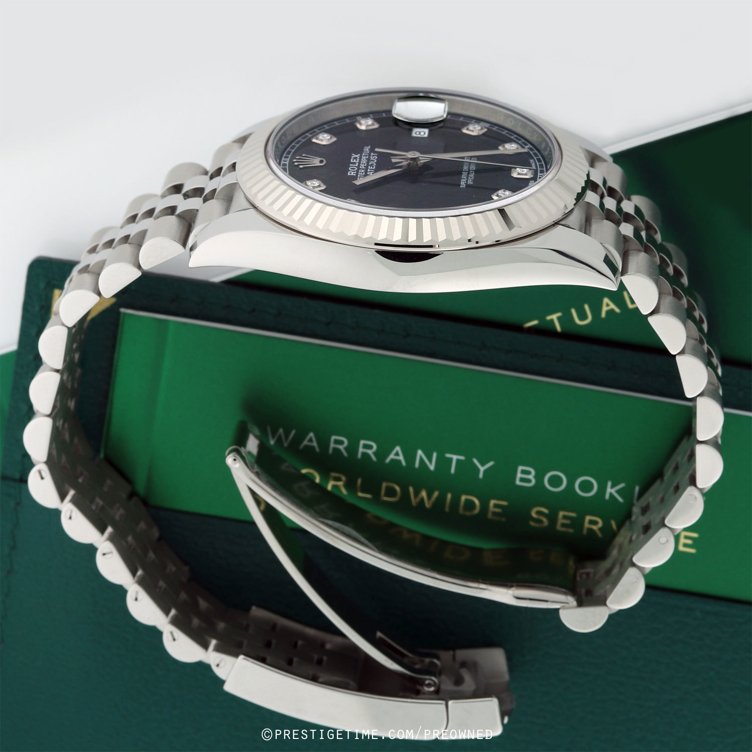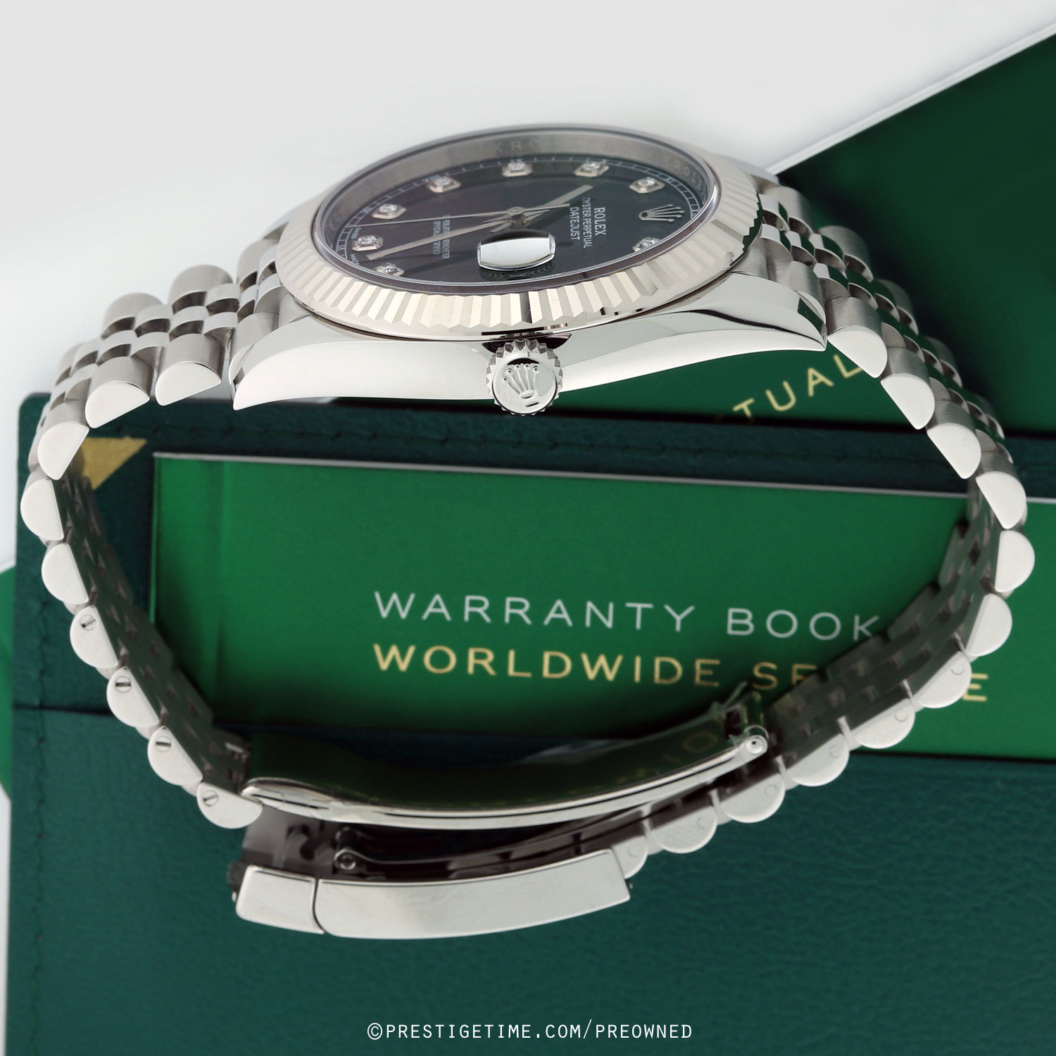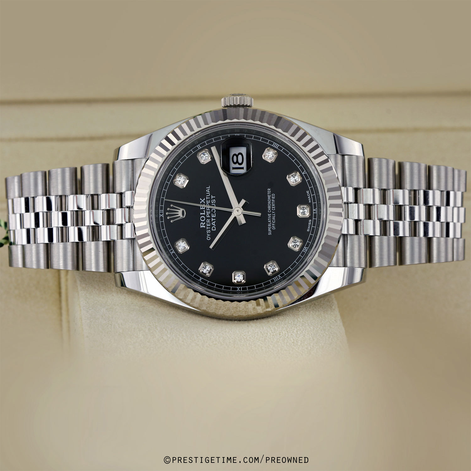 Case: Polished stainless steel case. Polished 18kt white gold fluted bezel. Black dial with 10 Diamond hour markers. Fine printed minute track. Date window at 3 with cyclops magnifier.