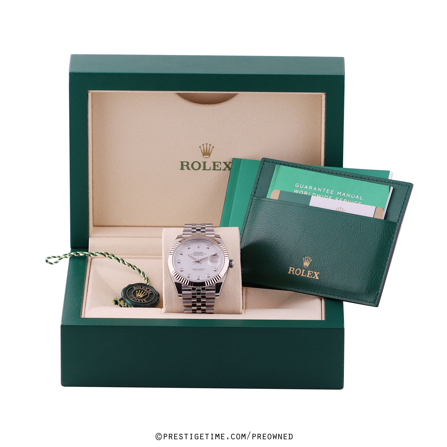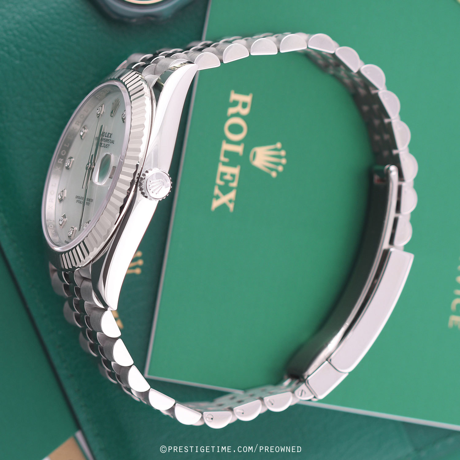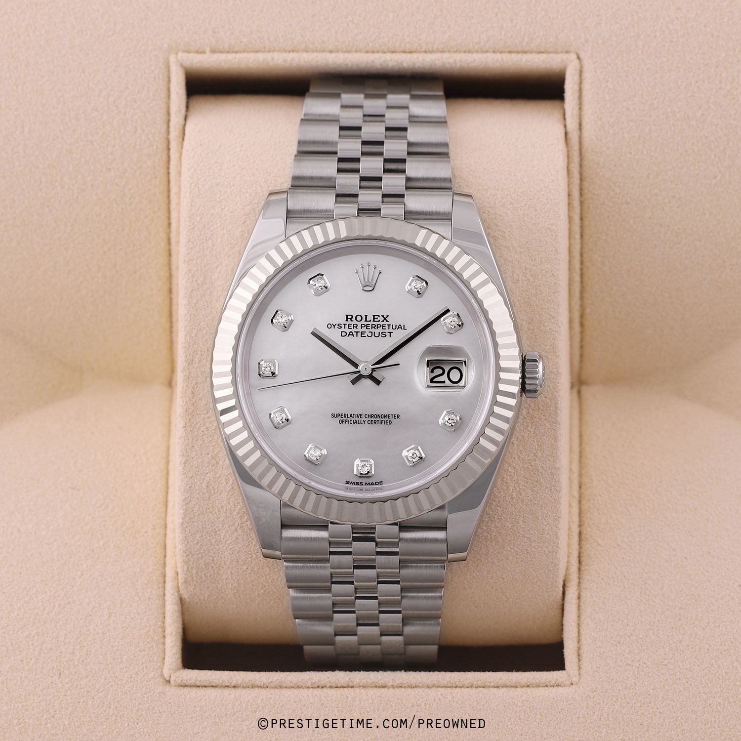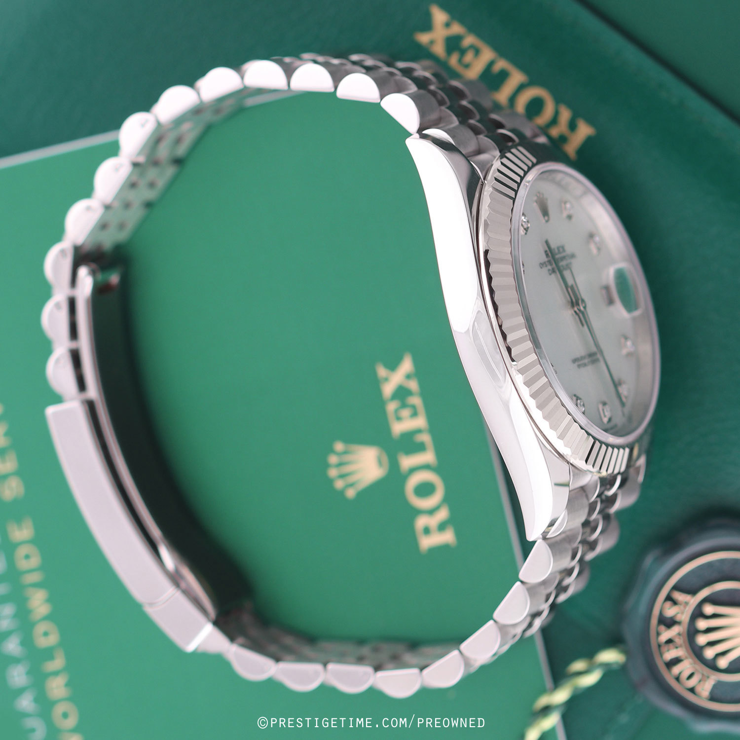 Case: Polished stainless steel case. Polished 18kt white gold fluted bezel. Very subtle natural white mother of pearl dial with 10 diamond hour markers. Date window at 3 with cyclops magnifier.
