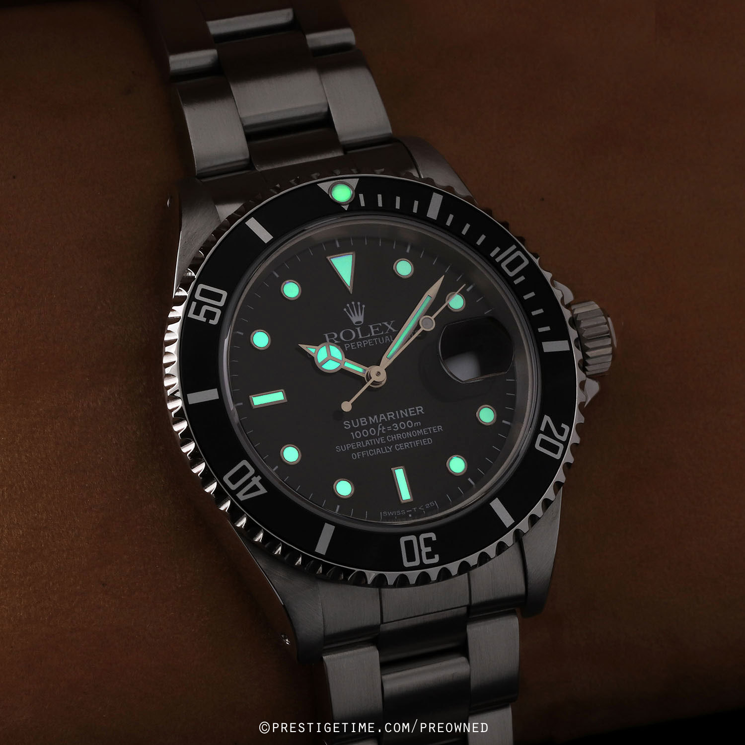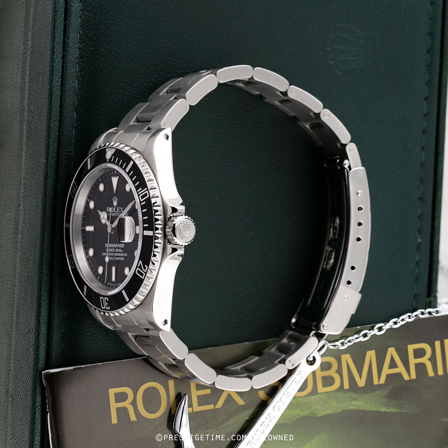 Case: Brushed & polished stainless steel case. Uni-directional rotating bezel with black aluminum bezel insert ring. Black dial. Applied polished hour markers with luminous fill. Polished hands with luminous fill. Date window at 3 with Cyclops magnifying glass on the crystal.