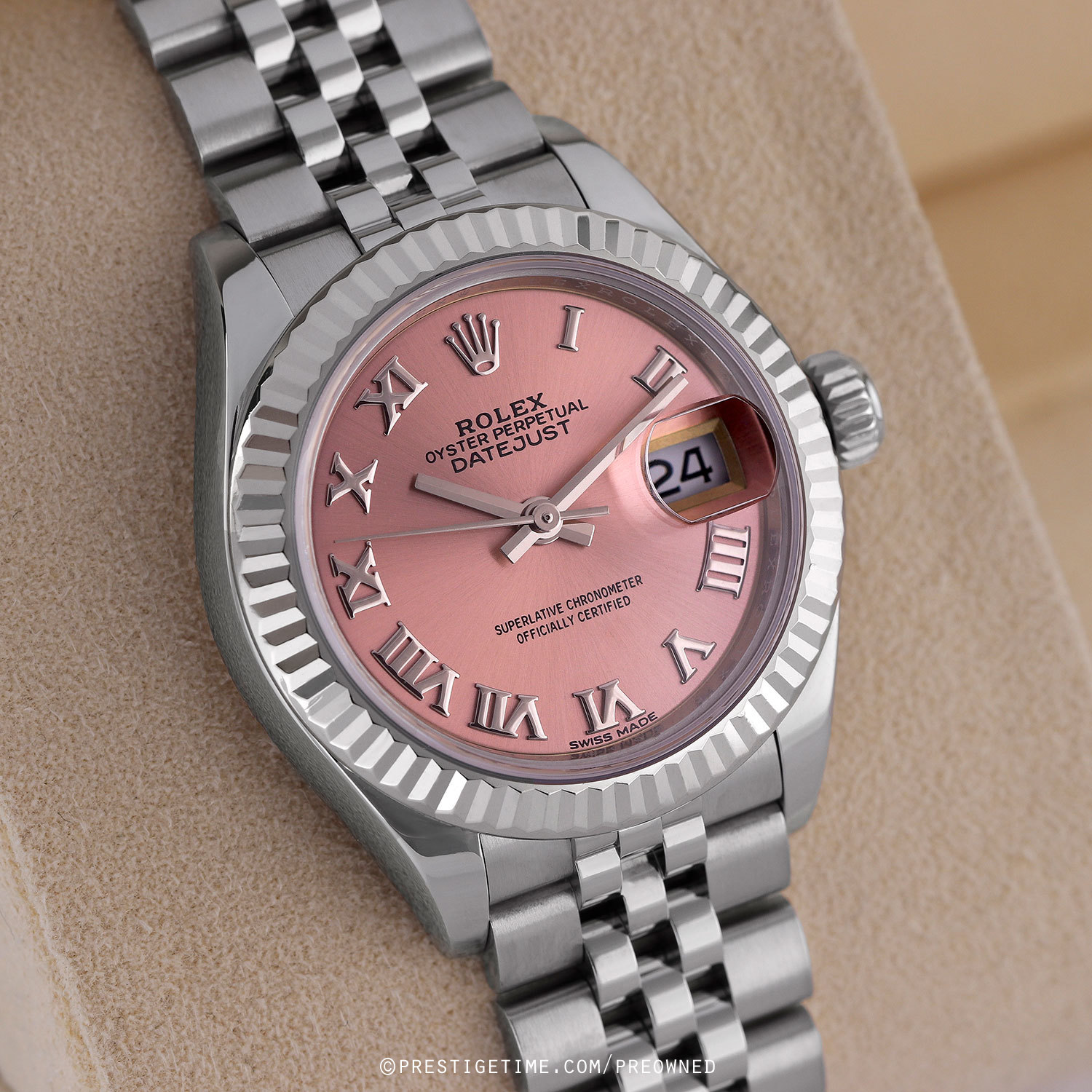 Case: Polished stainless steel case. Polished 18kt white gold fluted bezel. Stainless steel Twinlock screw-down crown. Pink dial with a fine sun-ray finish. Polished hands. Applied polished Roman numeral hour markers. Date window at 3 with cyclops magnifier.