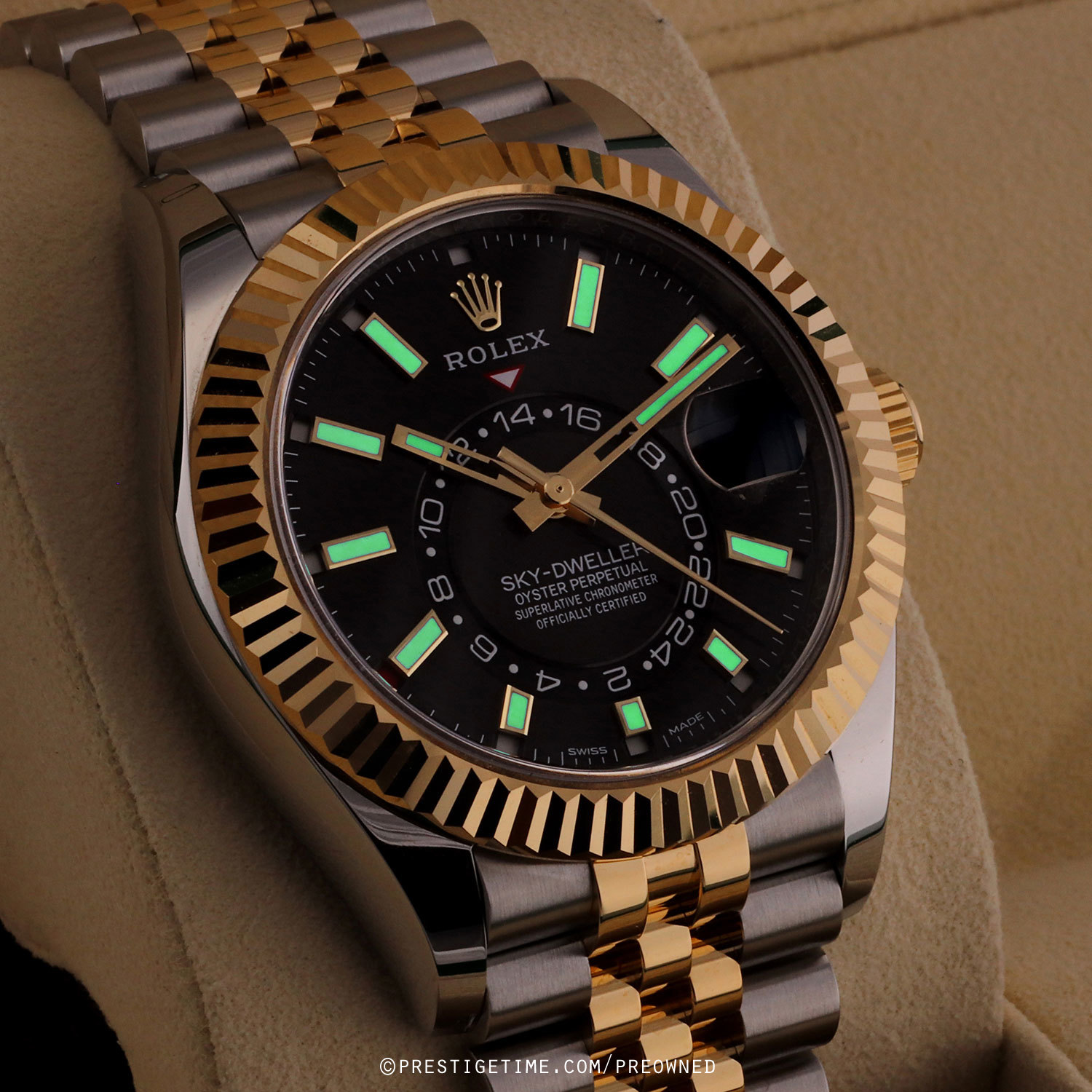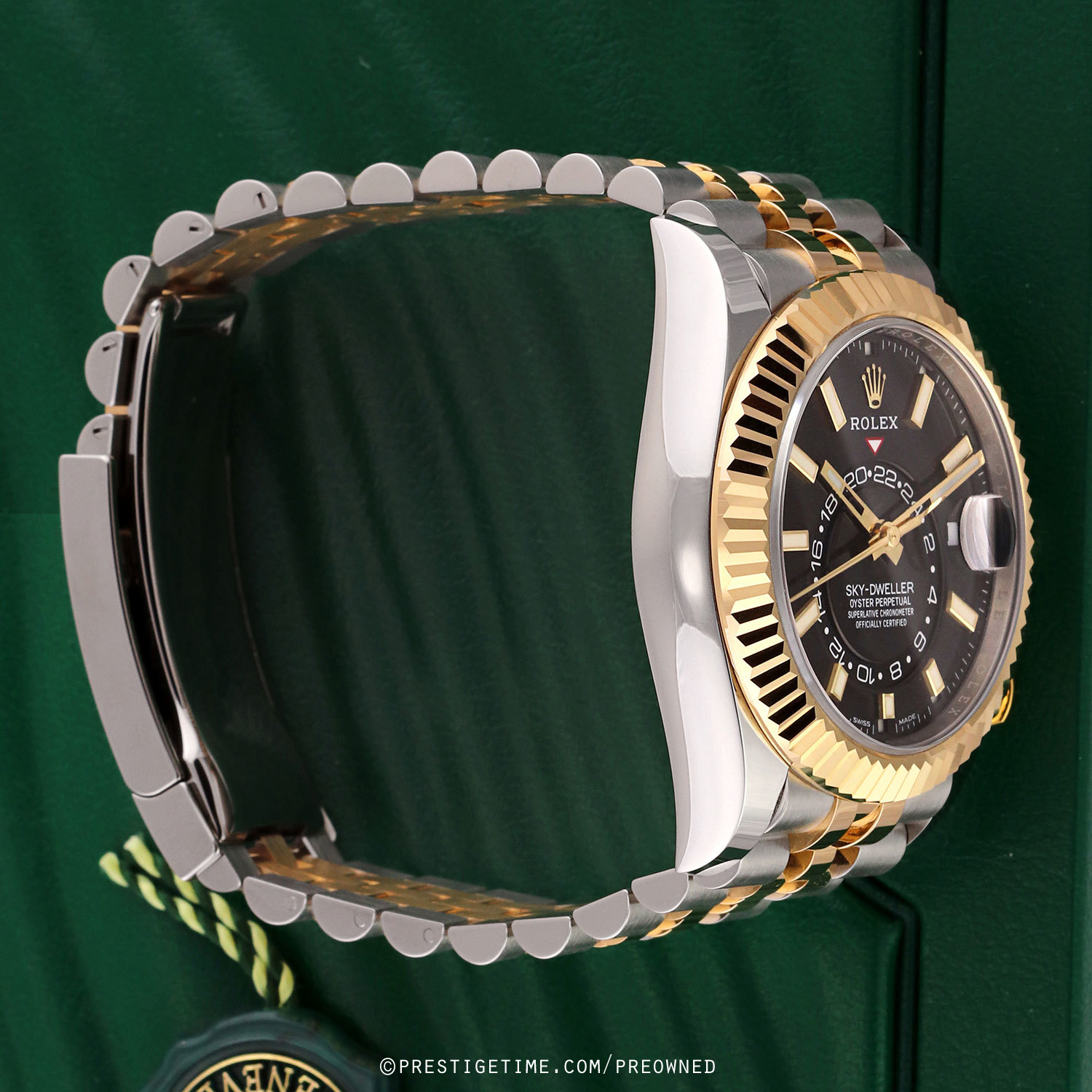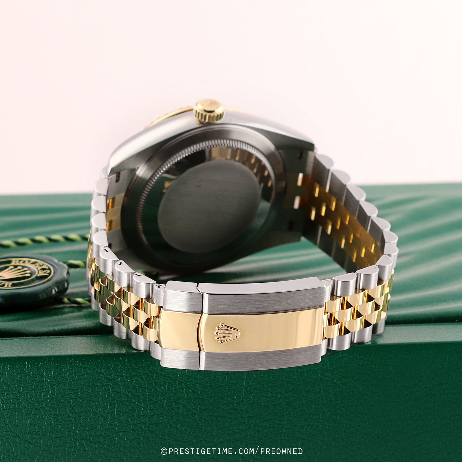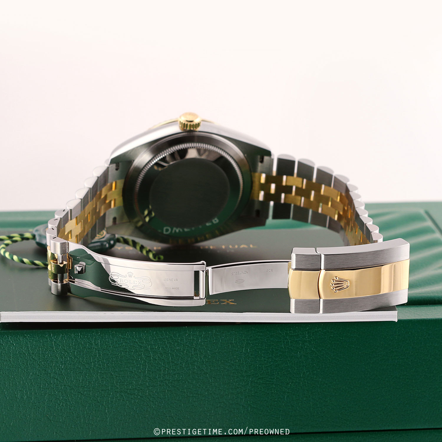 Bracelet: Fitted on a stainless steel & 18kt yellow gold Jubilee style bracelet with a folding Oysterclasp. The buckle features a Easylink 5mm comfort extension link. The bracelet has all links