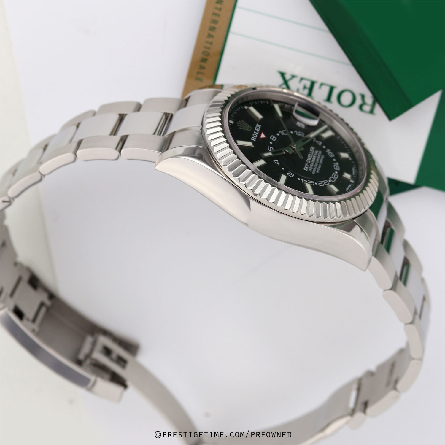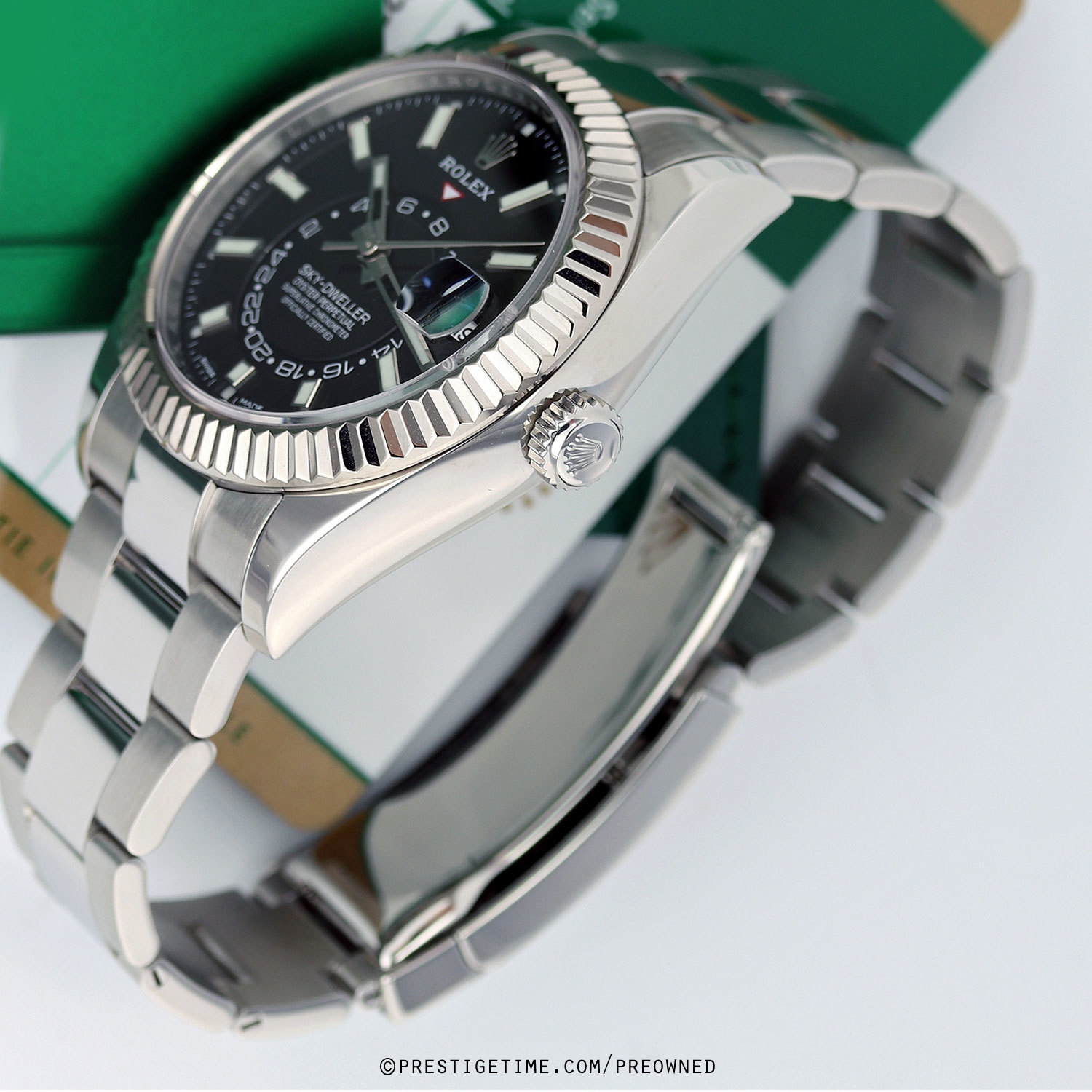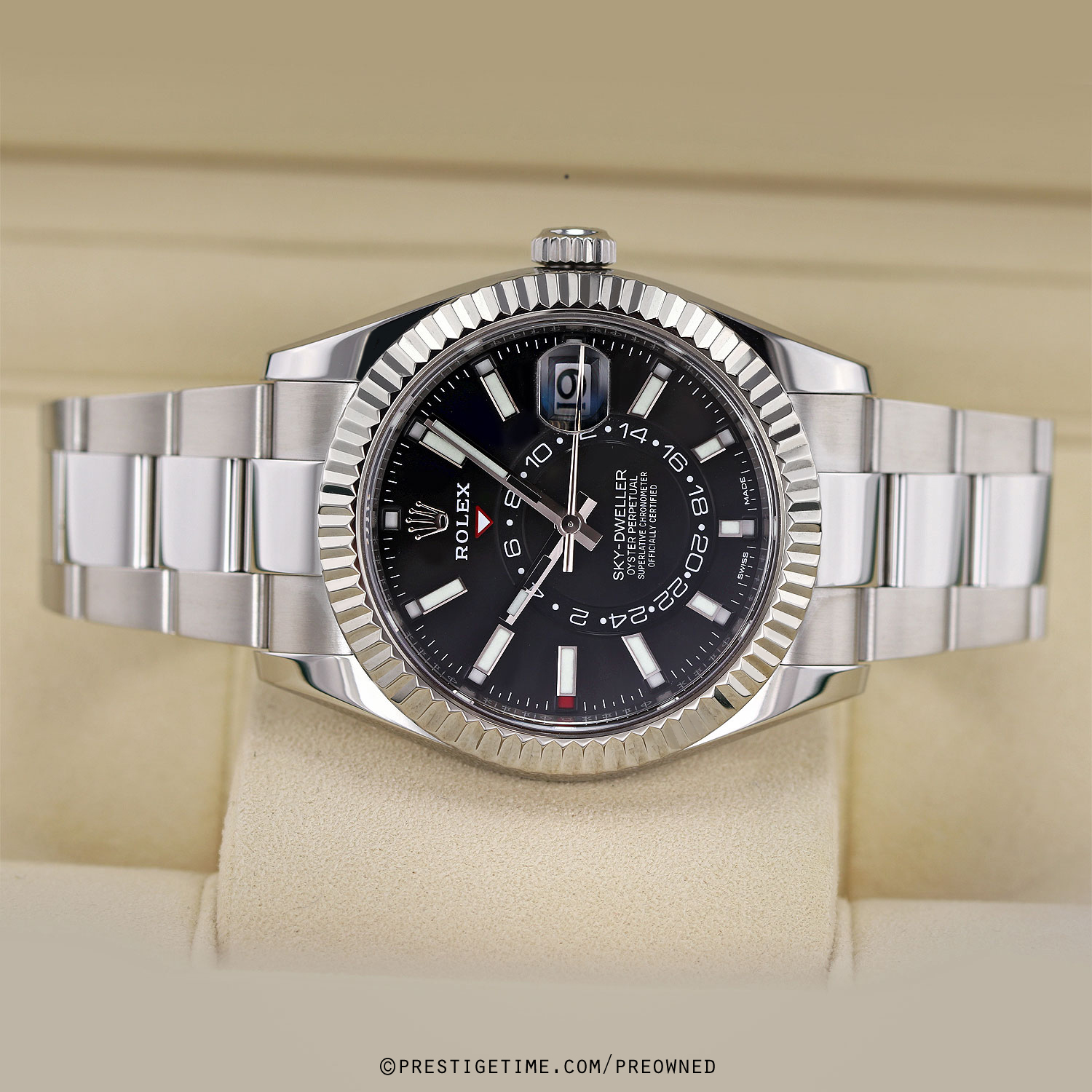 Case: Polished stainless steel case. Polished 18kt white gold fluted bezel. Black dial. Applied white gold index hour markers with luminous fill. Printed minute/seconds track on the dial perimeter. Polished white gold hands. Partially skeletonized minute & hour hands so not to obscure the dual time. Hour & minute hands with luminous filled tips. Features: