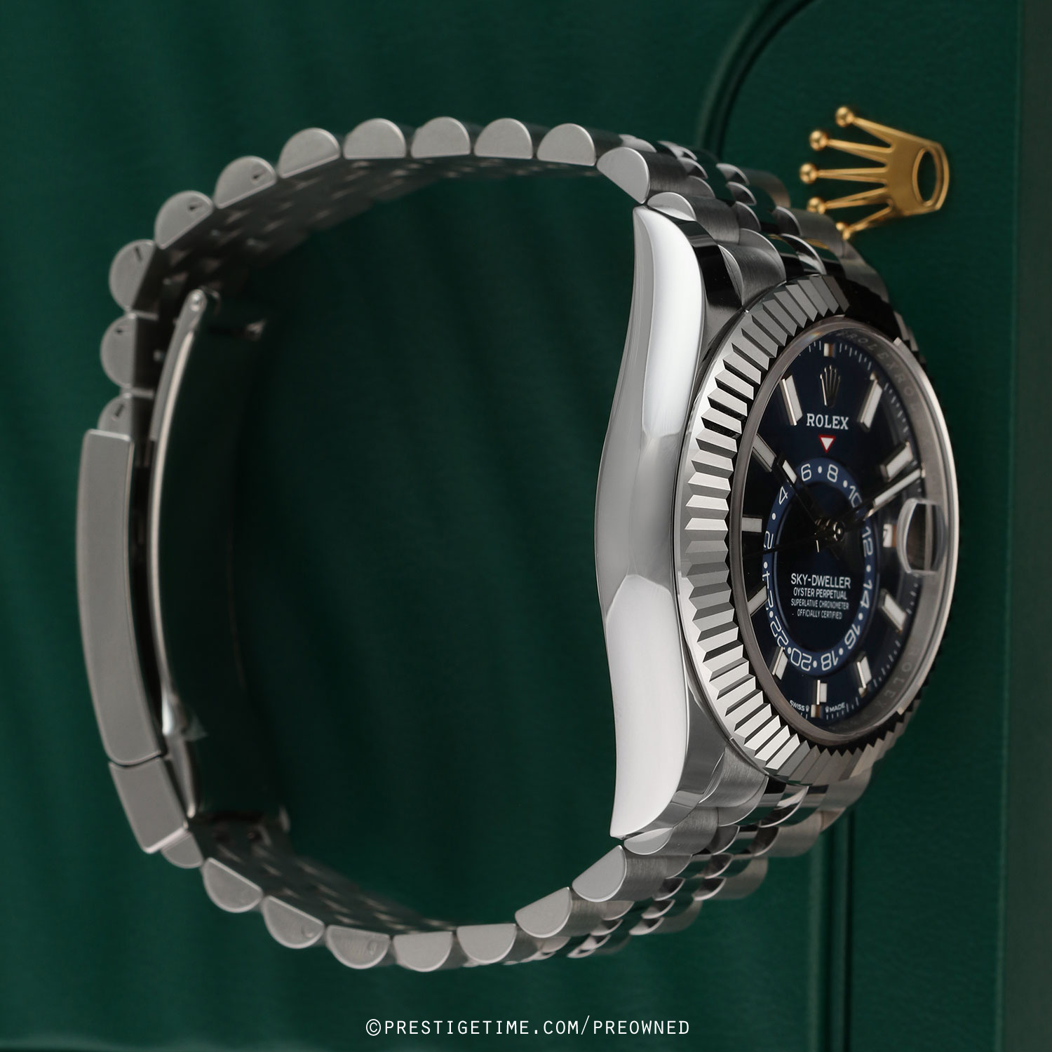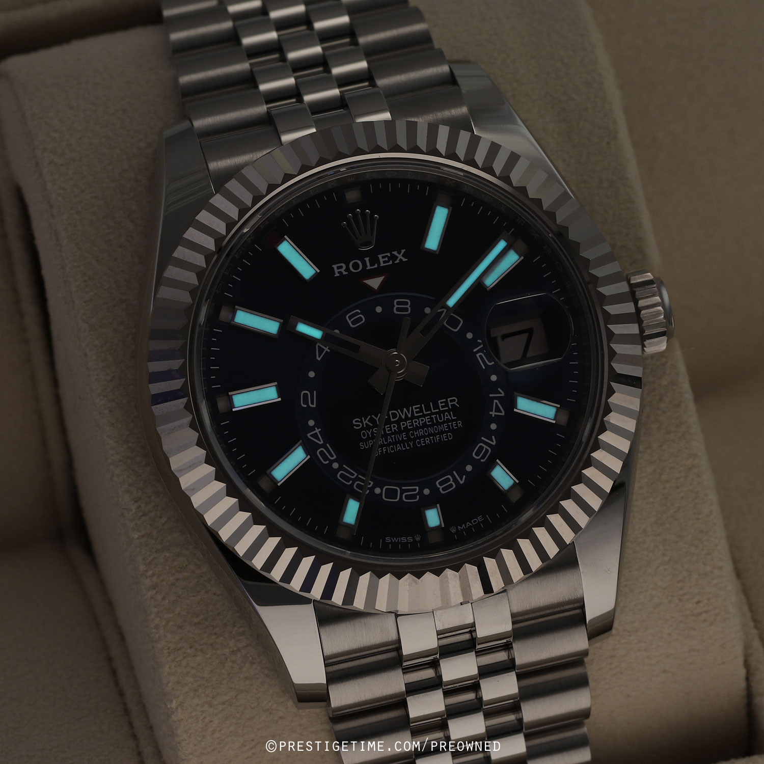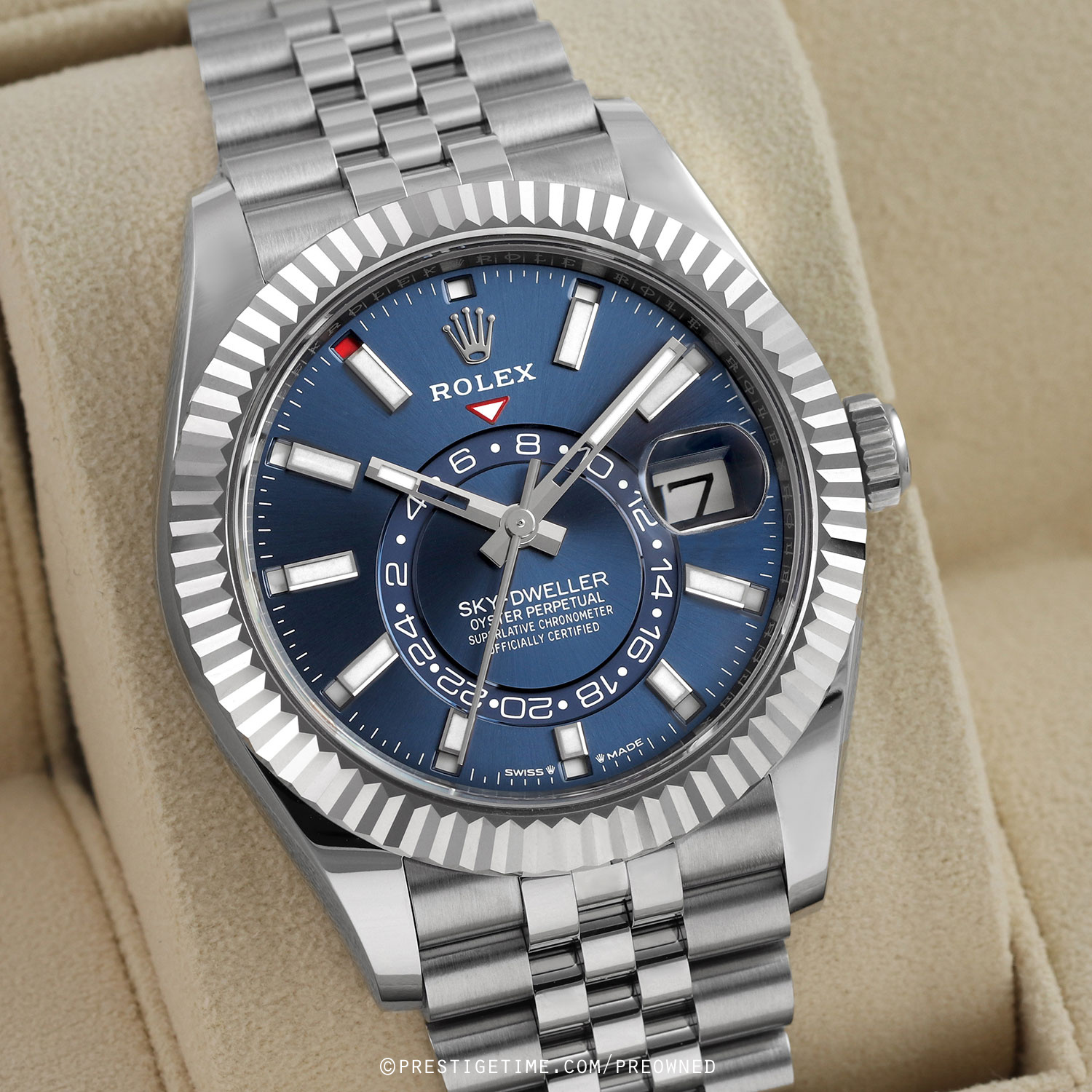 Case: Polished stainless steel case & Twinlock screw-down crown. Polished 18kt white gold fluted bezel. Blue dial. Polished hands. Partially skeletonized minute & hour hands so not to obscure the dual time. Hour & minute hands with luminous filled tips. Applied white gold index hour markers with luminous fill. Printed minute/seconds track on the dial perimeter. Features:
