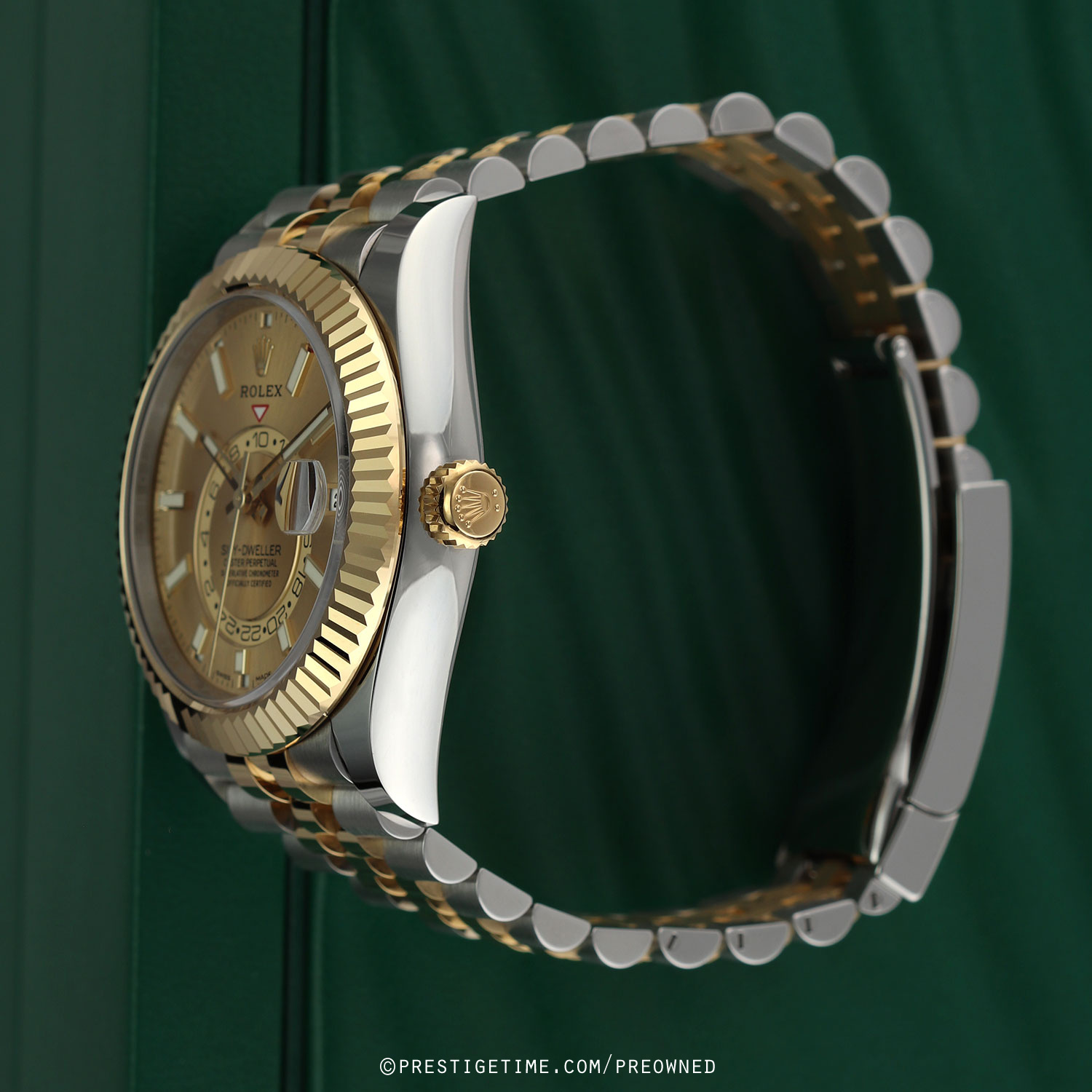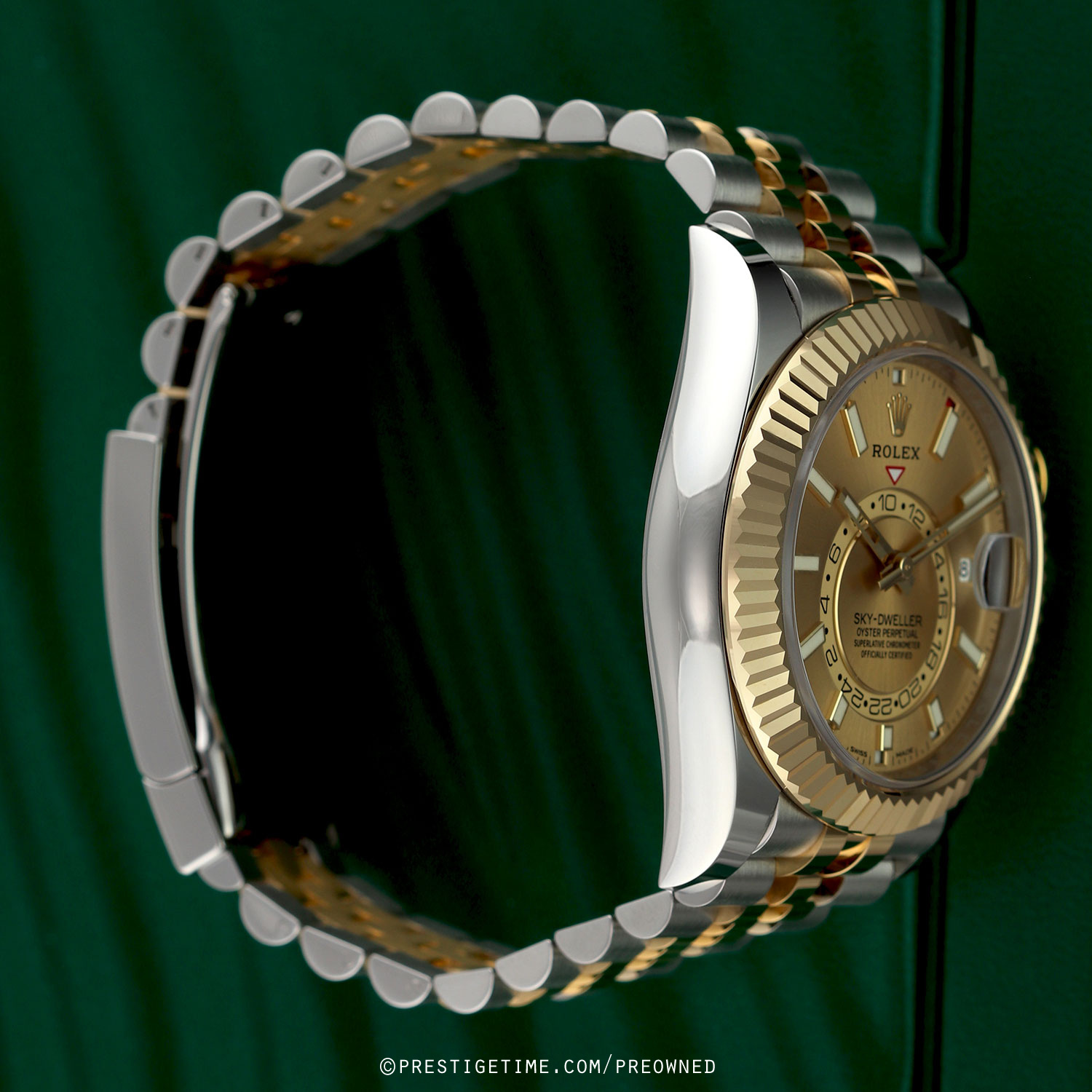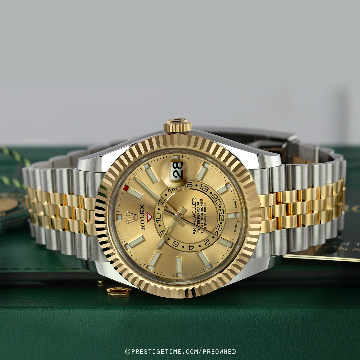 Case: Polished stainless steel case. Polished 18kt yellow gold fluted bezel & Twinlock screw-down crown. Champagne dial. Polished yellow gold hands. Partially skeletonized minute & hour hands so not to obscure the dual time. Hour & minute hands with luminous filled tips. Applied yellow gold index hour markers with luminous fill. Printed minute/seconds track on the dial perimeter. Features: