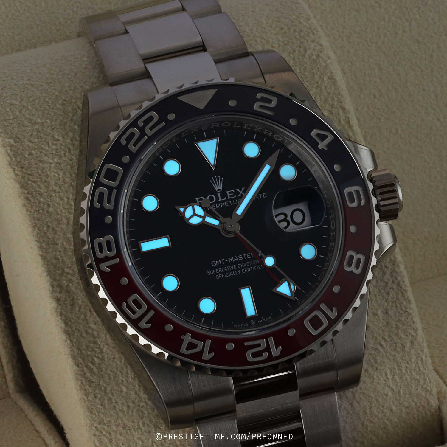 Case: Brushed & polished solid 18kt white gold case. Polished 18kt white gold triplock screw-down crown. 18kt white gold bi-directional rotating bezel with a PEPSI blue & red Cerachrom ceramic bezel insert featuring 24 hour markings. Deep blue dial. Polished white gold hands with luminous fill. Applied white gold polished hour markers with luminous fill. Date window at 3 o'clock with Cyclops magnifier.