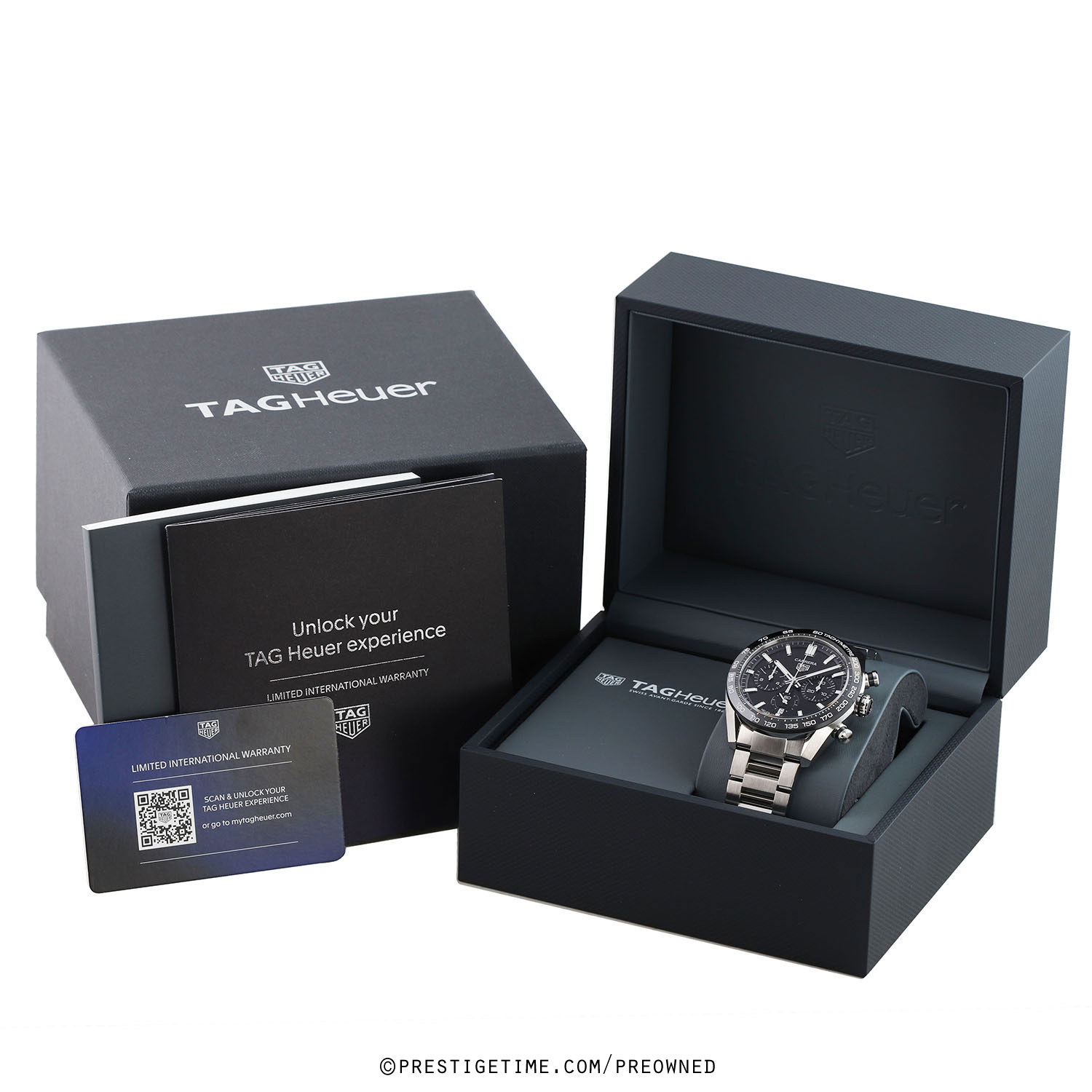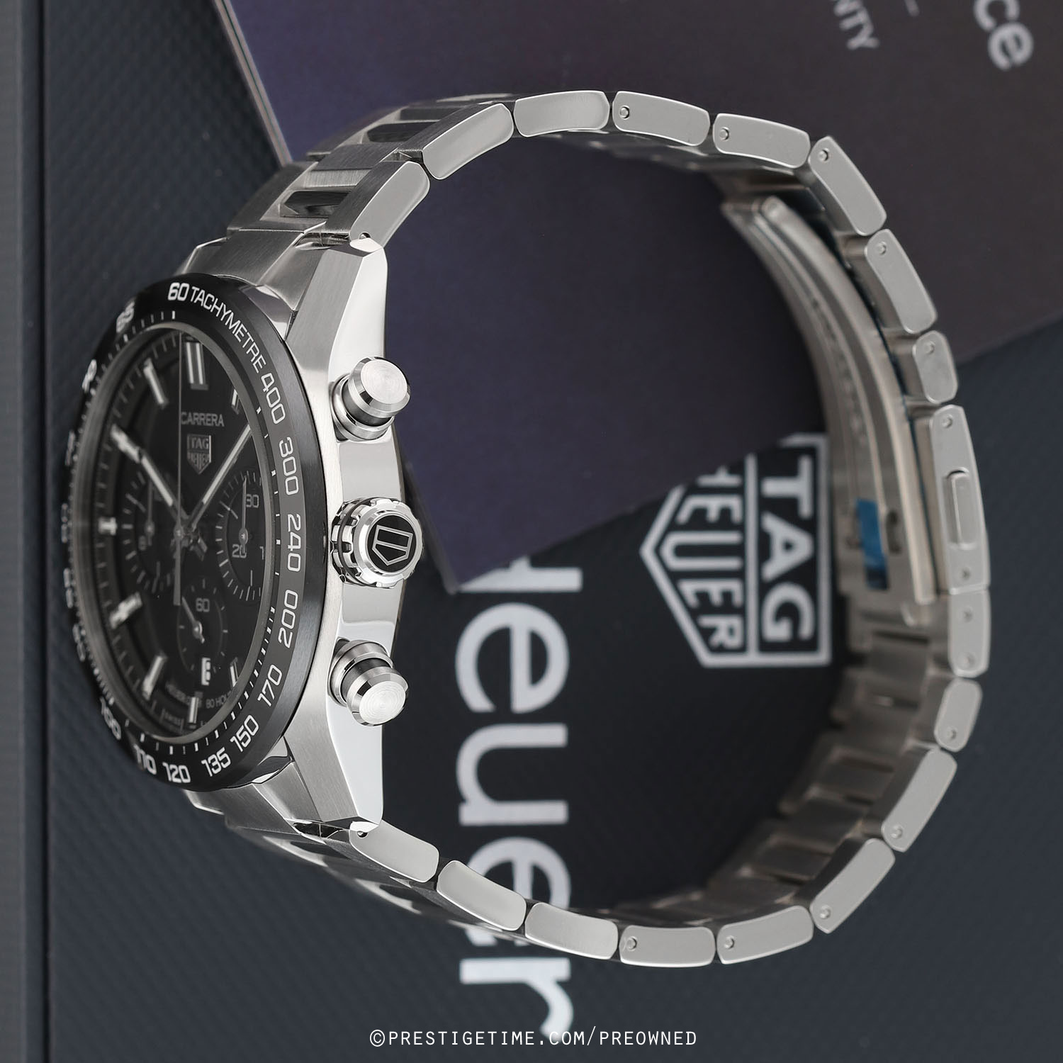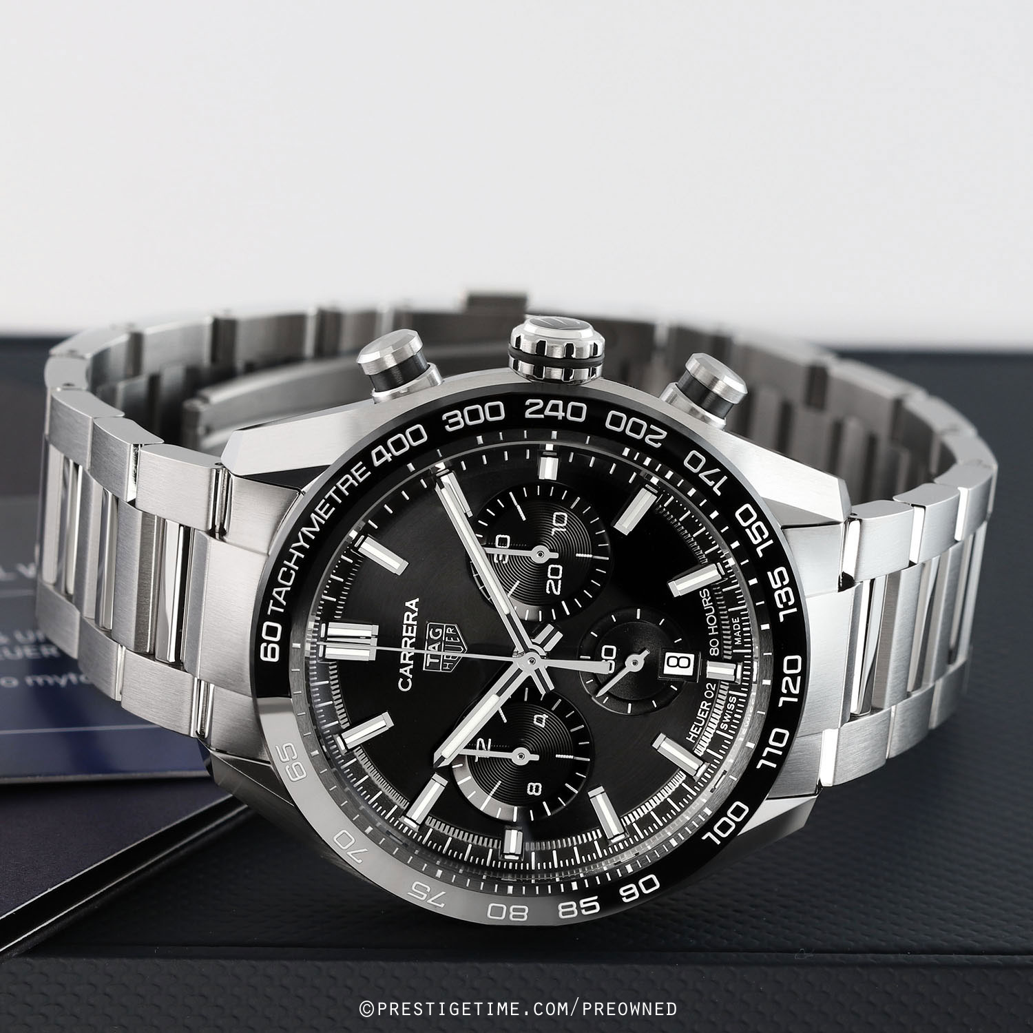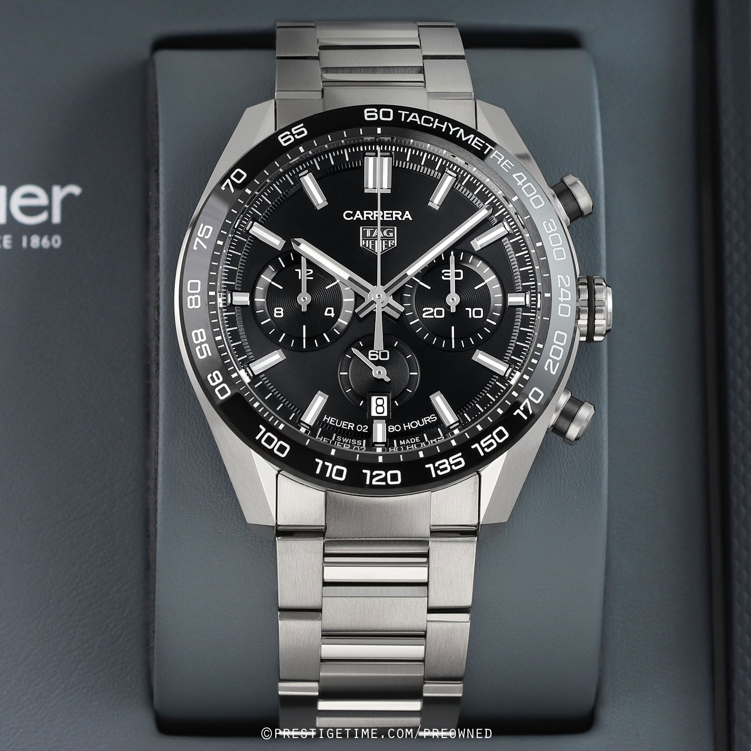 Case: Brushed & polished stainless steel case. Polished black ceramic with bezel with tachymeter scale. Black dial. Polished hands, the hour & minute hands with luminous fill. Applied polished index hour markers with luminous fill. Fine printed minute/seconds & fractions-of-a-seconds track on dial flange. Date window at 6 o'clock. Small seconds sub-dial at 6 o'clock.