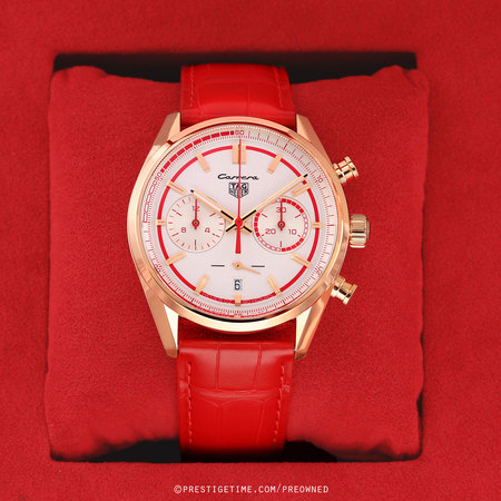 Strap: Fitted on its original TAG Heuer red alligator leather strap with a solid 18kt rose gold tang buckle. The strap is in excellent, near new condition with the majority of its wear lifespan remaining. We would be comfortable rating the strap as in 97% condition.