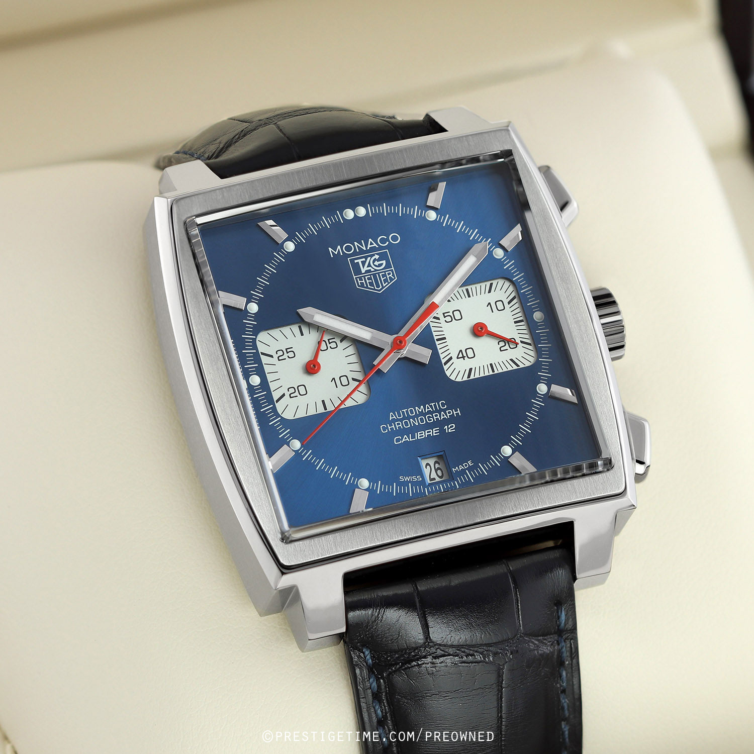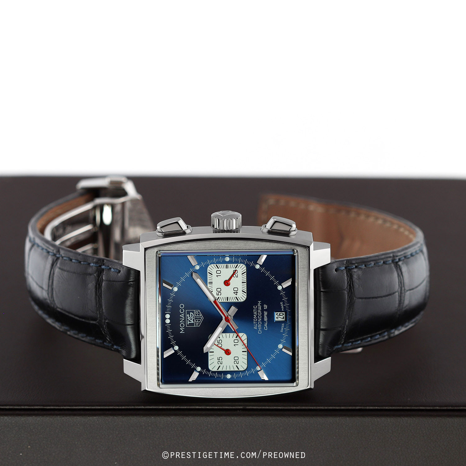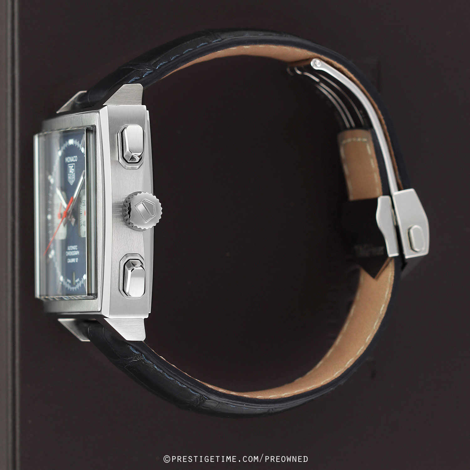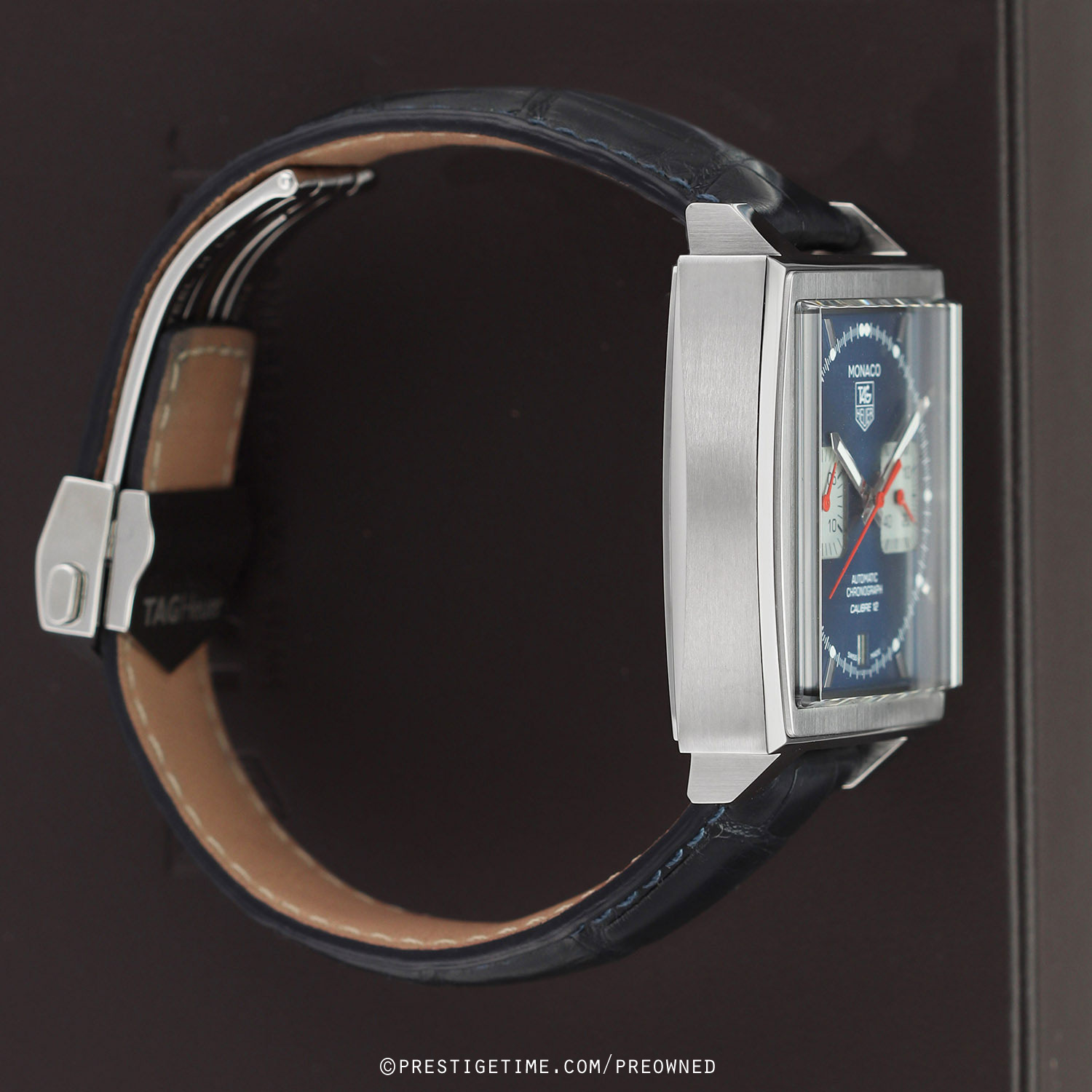 - Fitted on its original TAG Heuer blue alligator leather strap with a stainless steel push-button deployant buckle. The strap is in excellent near-new condition with the majority of its wear life-span remaining. We would be comfortable rating this strap in 95% overall condition.