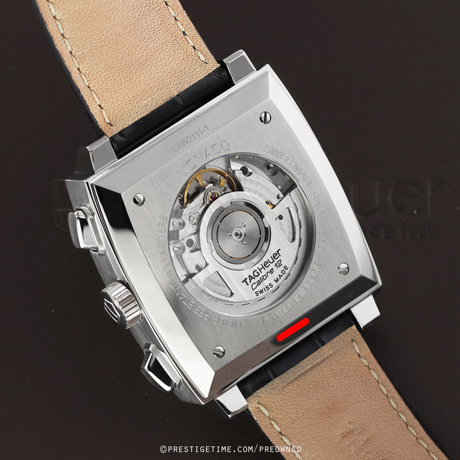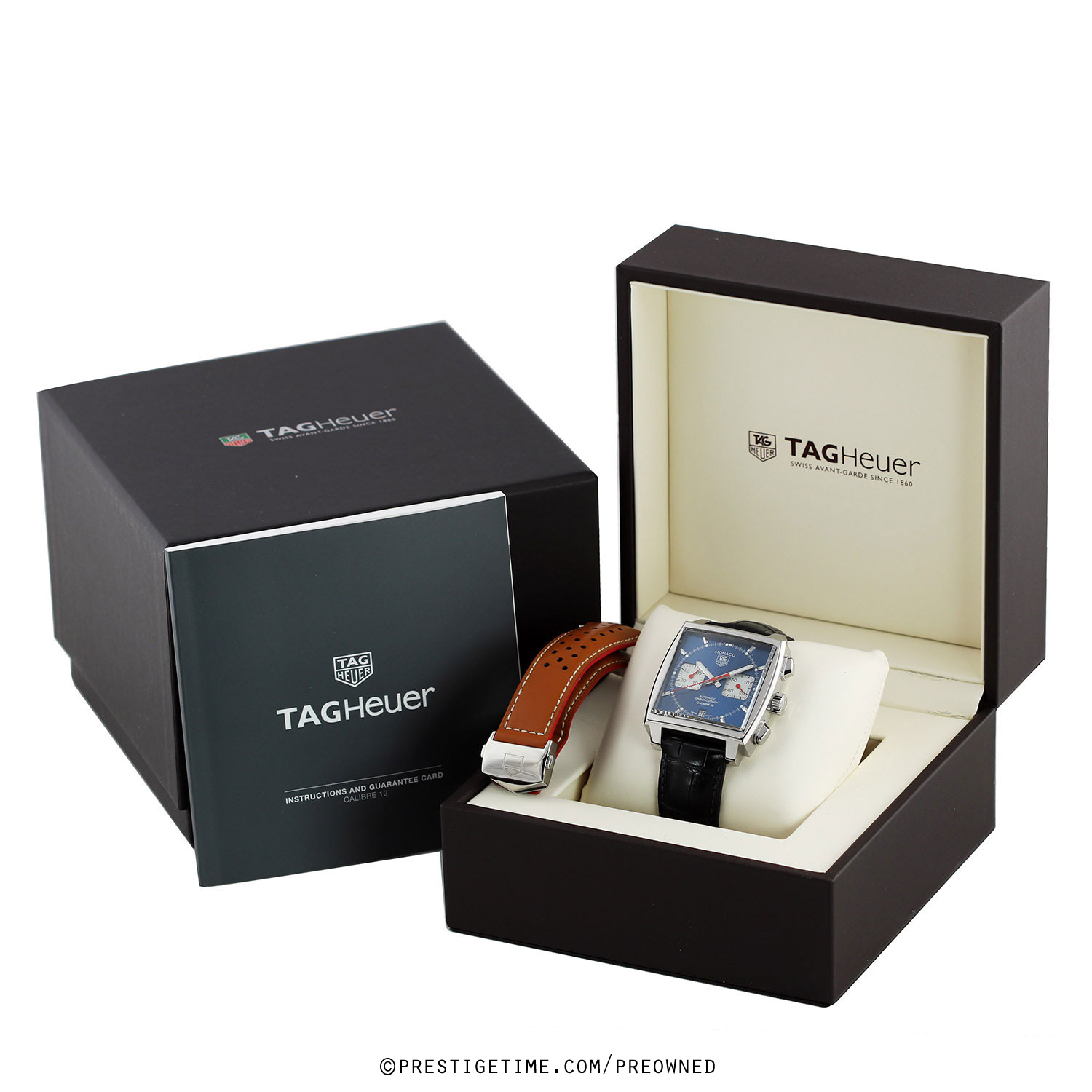 - Delivered with an additional TAG Heuer original light-brown calfskin leather strap with a stainless steel push-button deployant buckle. The strap is in excellent near-new condition with the majority of its wear life-span remaining. We would be comfortable rating this strap in 97% overall condition.