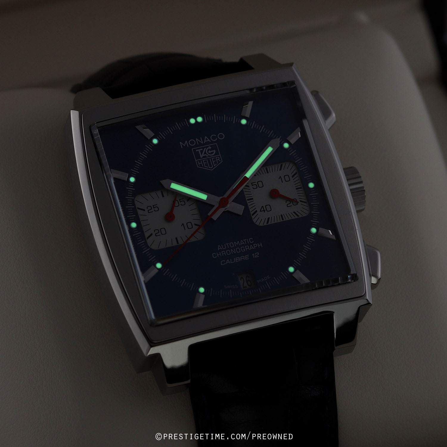 Movement: Powered by a TAG Heuer caliber 12 (base Sellita SW300-1 with a Dubois-Depraz chronograph module), beats at 28,800 vph, contains 59 jewels & has a power reserve of +/- 40 hours.
