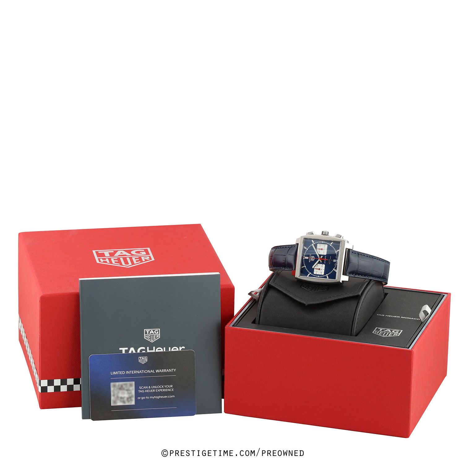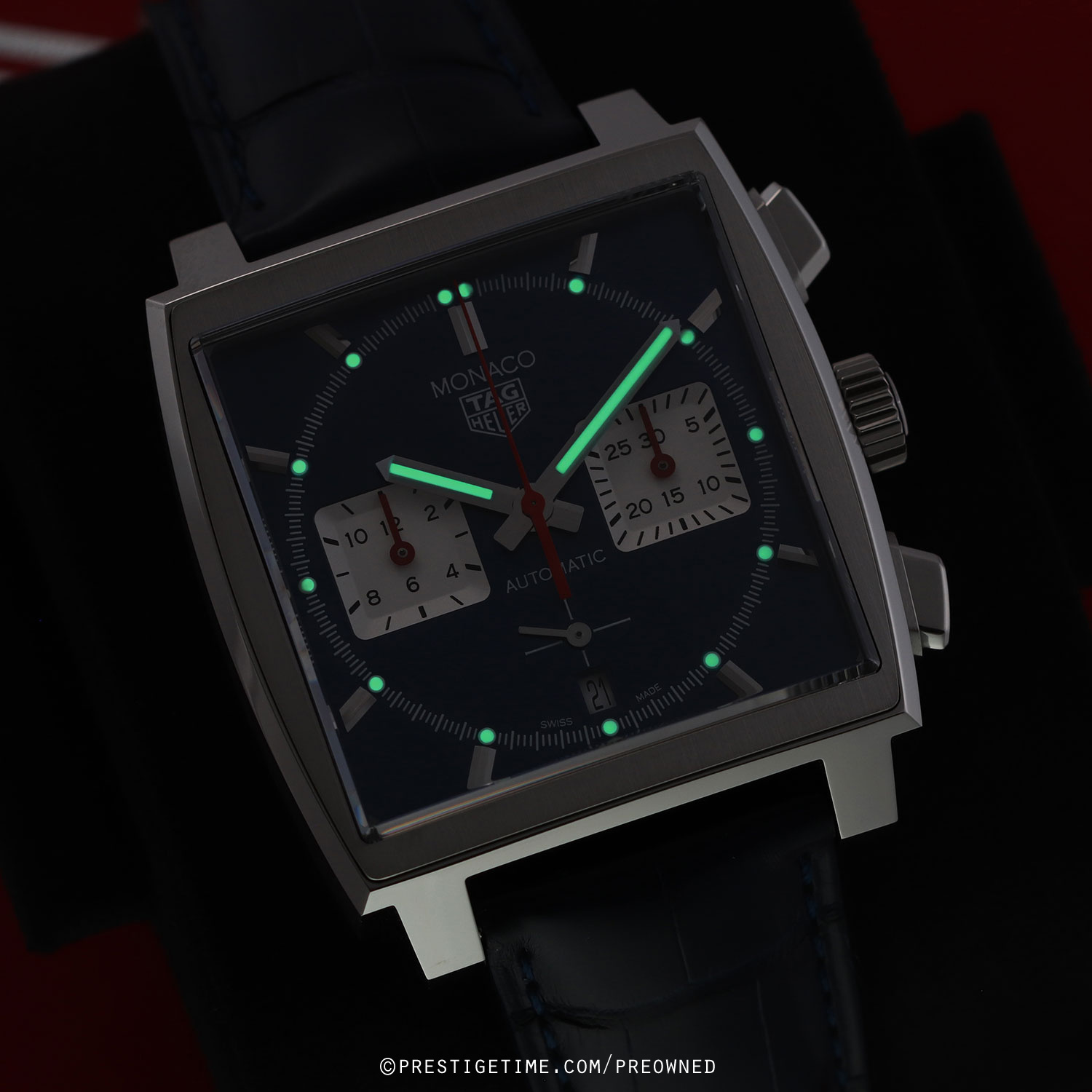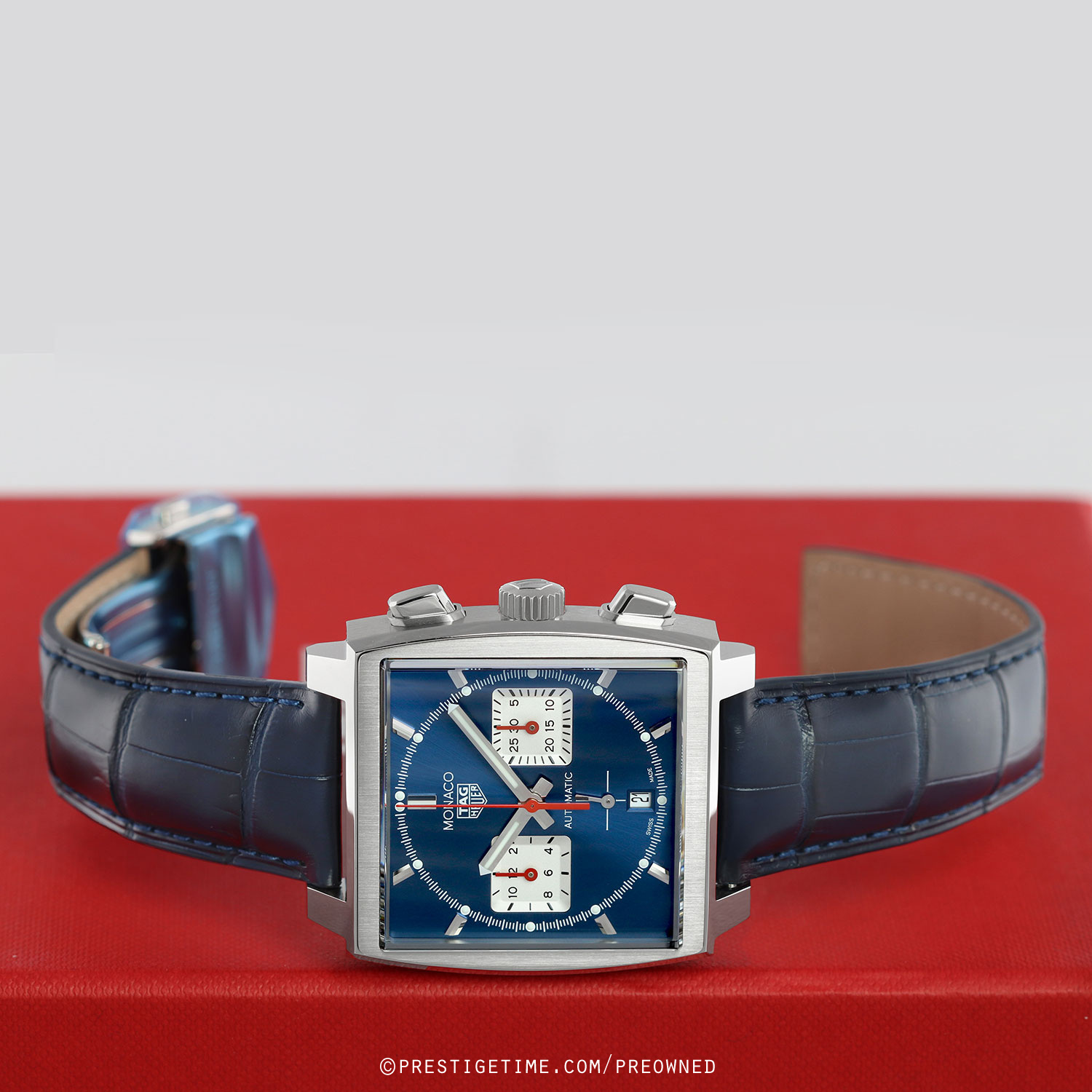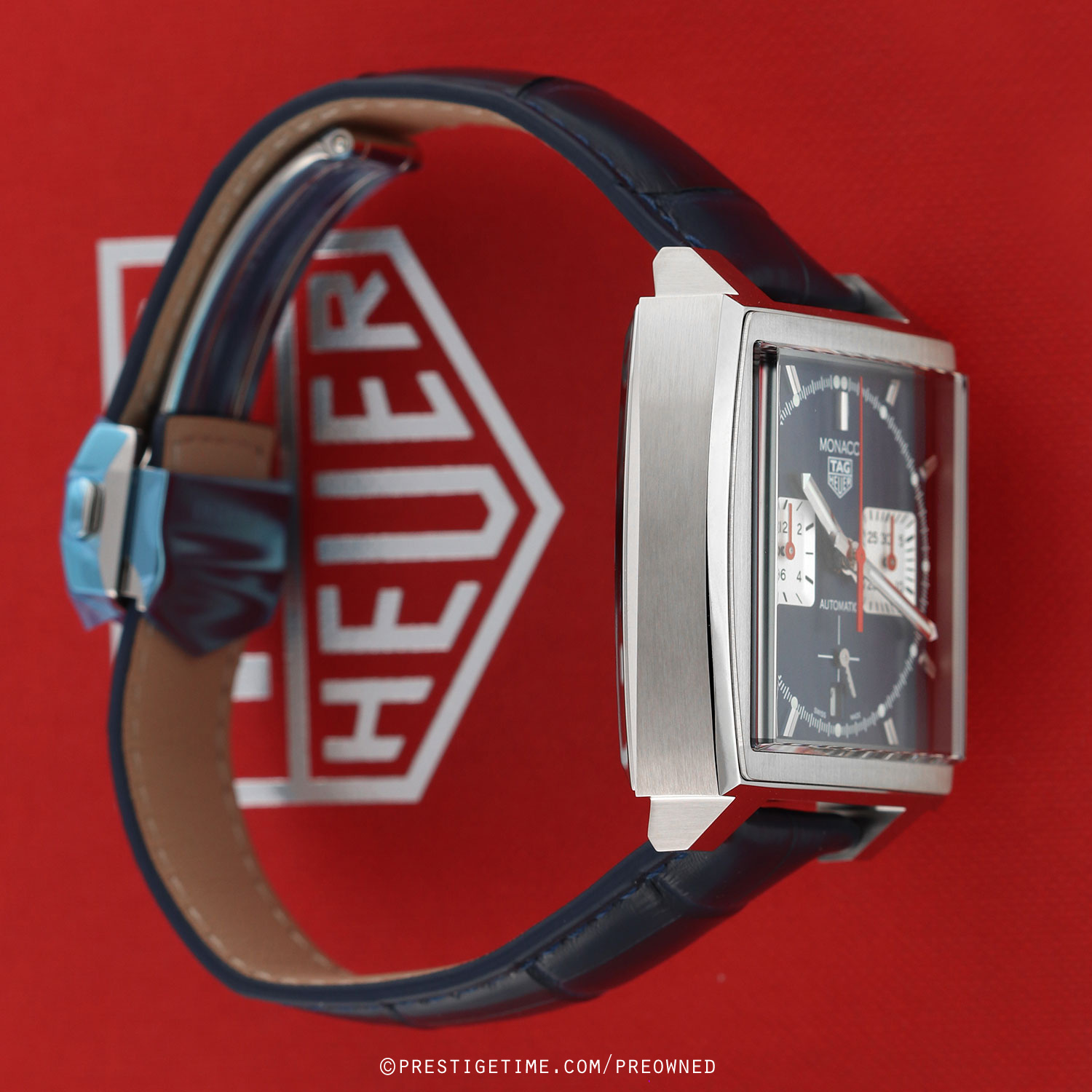 Strap: Fitted on its original TAG Heuer blue alligator leather strap with a push-button stainless steel deployant buckle. The strap is unworn in new condition with its full wear life-span remaining.