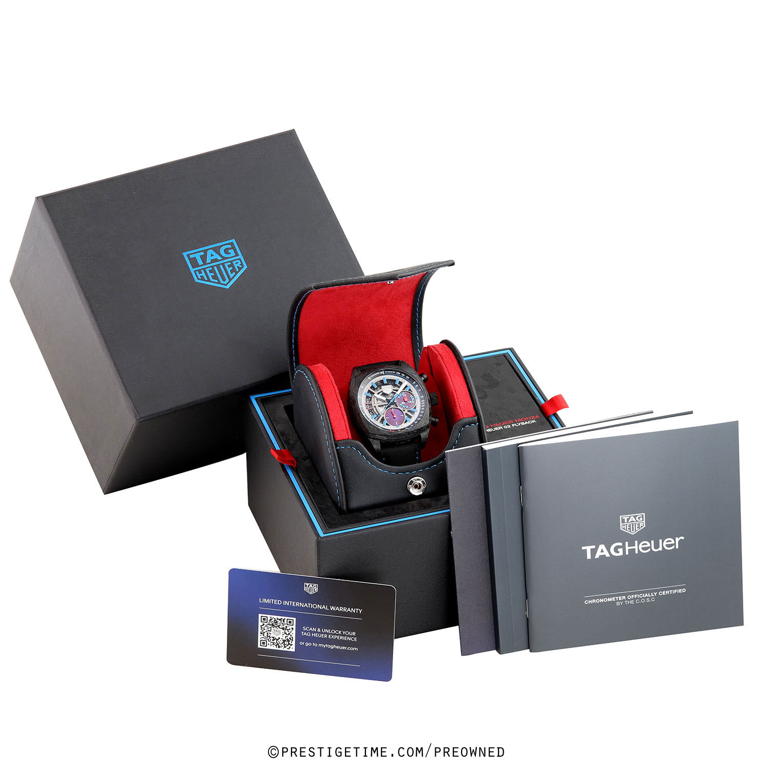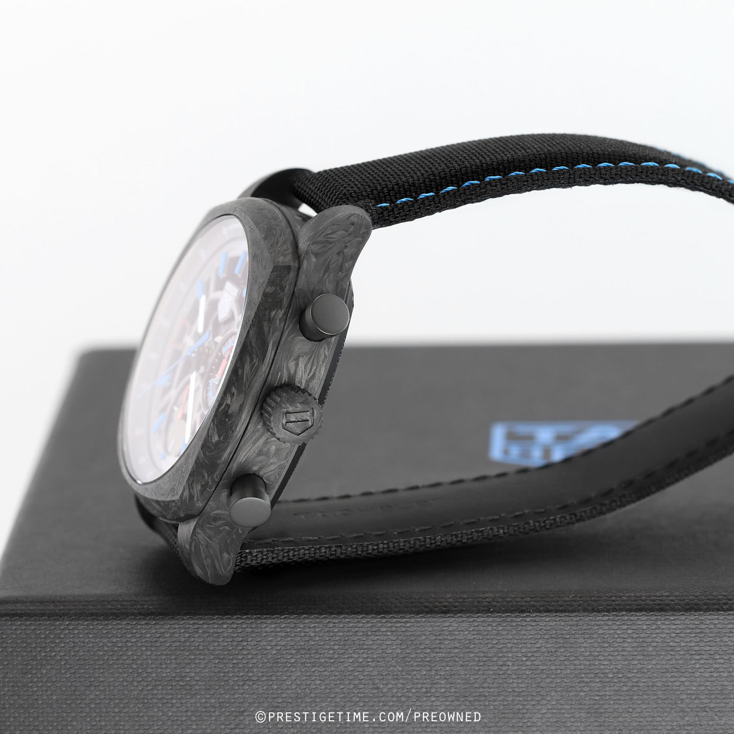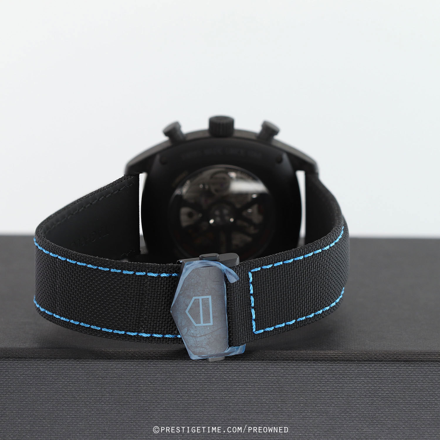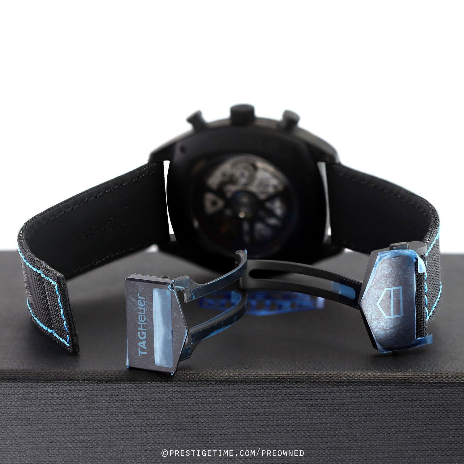 Strap: Fitted on its original Tag Heuer black fabric strap with matching blue stitching & a black DLC coated push-button deployant buckle. The strap is unworn, in new condition with its full wear lifespan remaining.