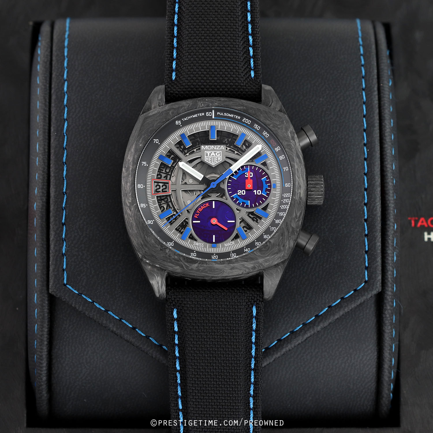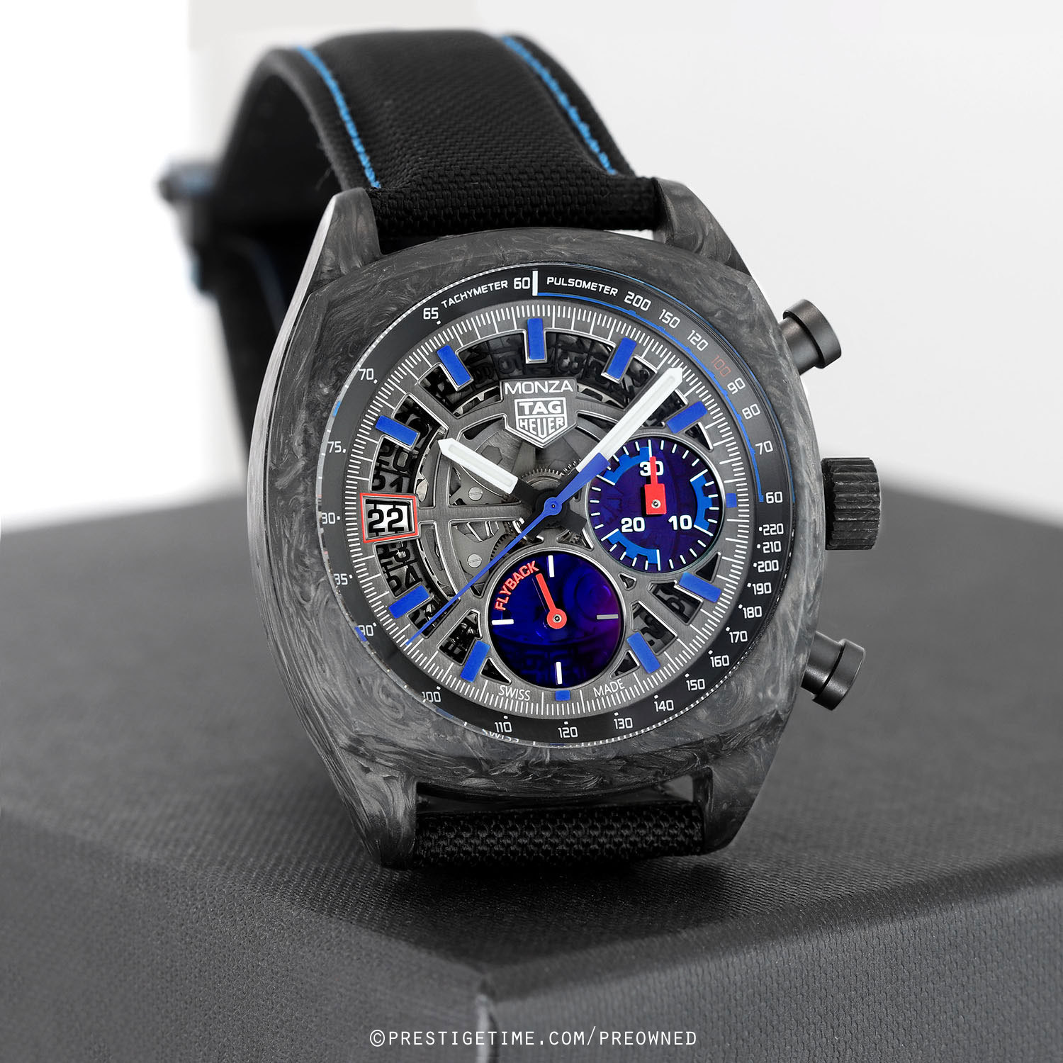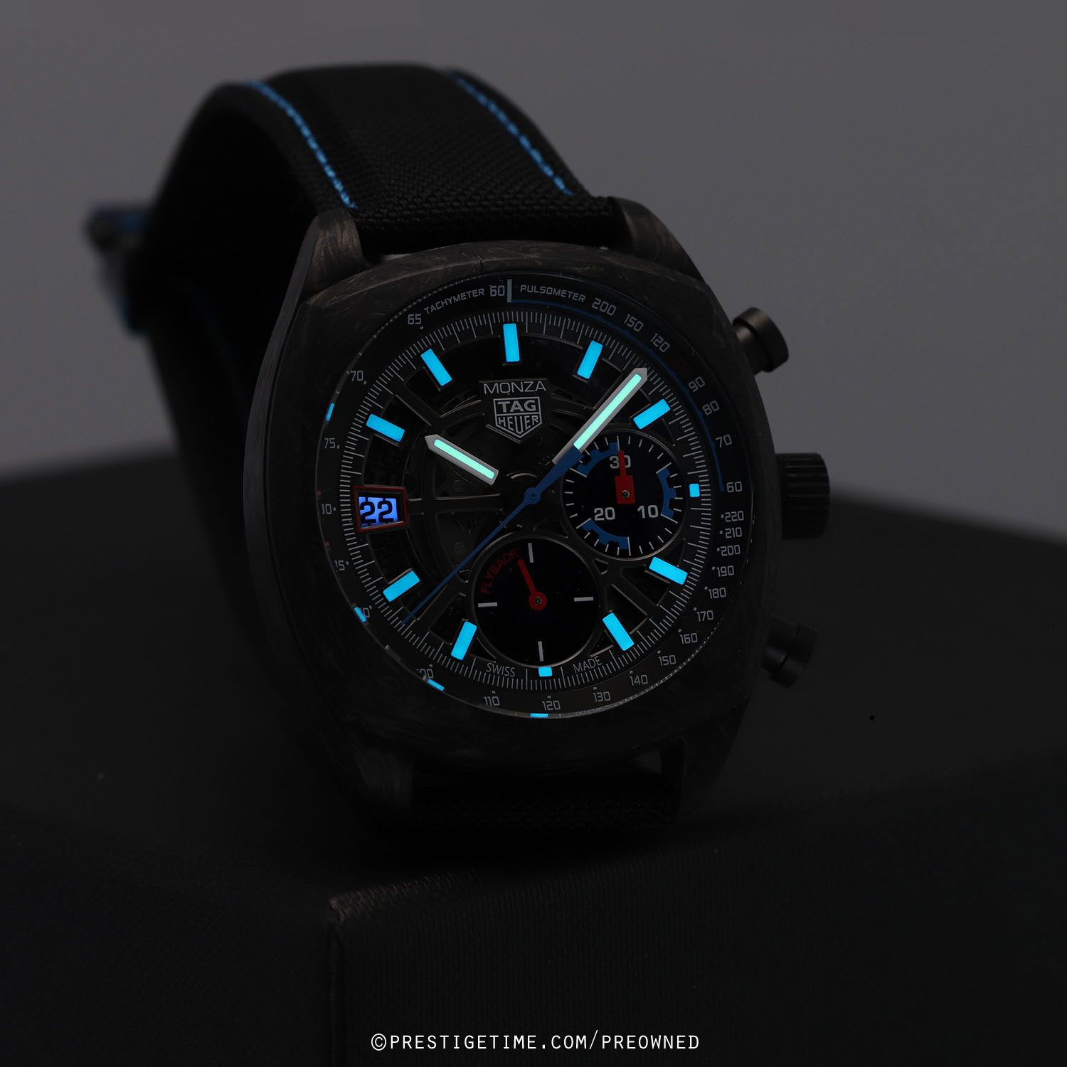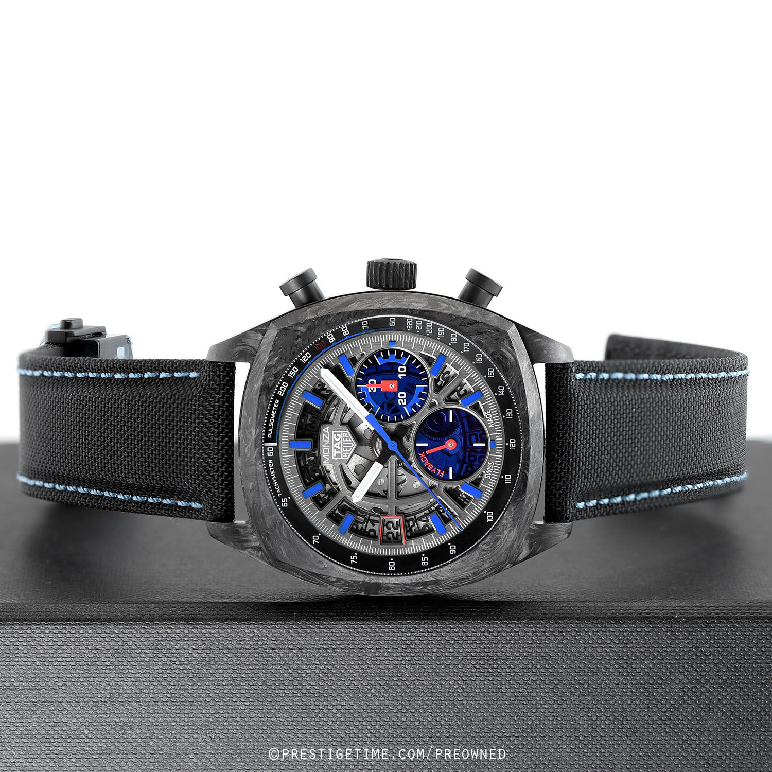 Strap: Fitted on its original Tag Heuer black fabric strap with matching blue stitching & a black DLC coated push-button deployant buckle. The strap is unworn, in new condition with its full wear lifespan remaining.