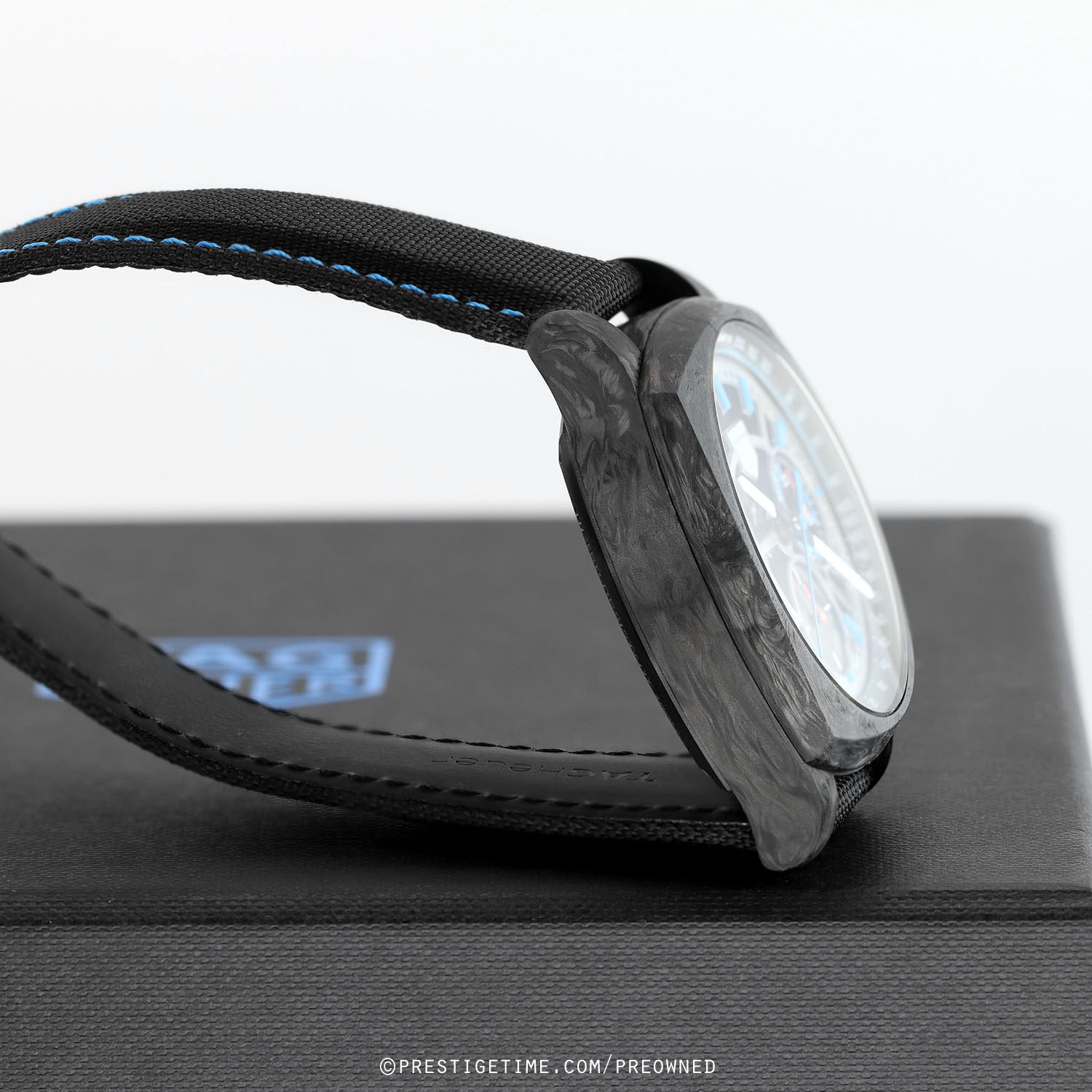 Case: Black carbon fiber case. Skeletonized dial with grey treated bridges. Blue sapphire crystal sub-dials. Black & white minutes & hour hands with luminous fill. Blue & red auxiliary hands. Applied blue luminous index hour markers. Grey dial flange with fine printed minutes/seconds & fractions of a sections track. Black outer flange with Tachymeter & Pulsometer scales. Small seconds sub-dial at 6 o'clock. Date window at 9 o'clock with skeletonized date wheel & a luminous background.