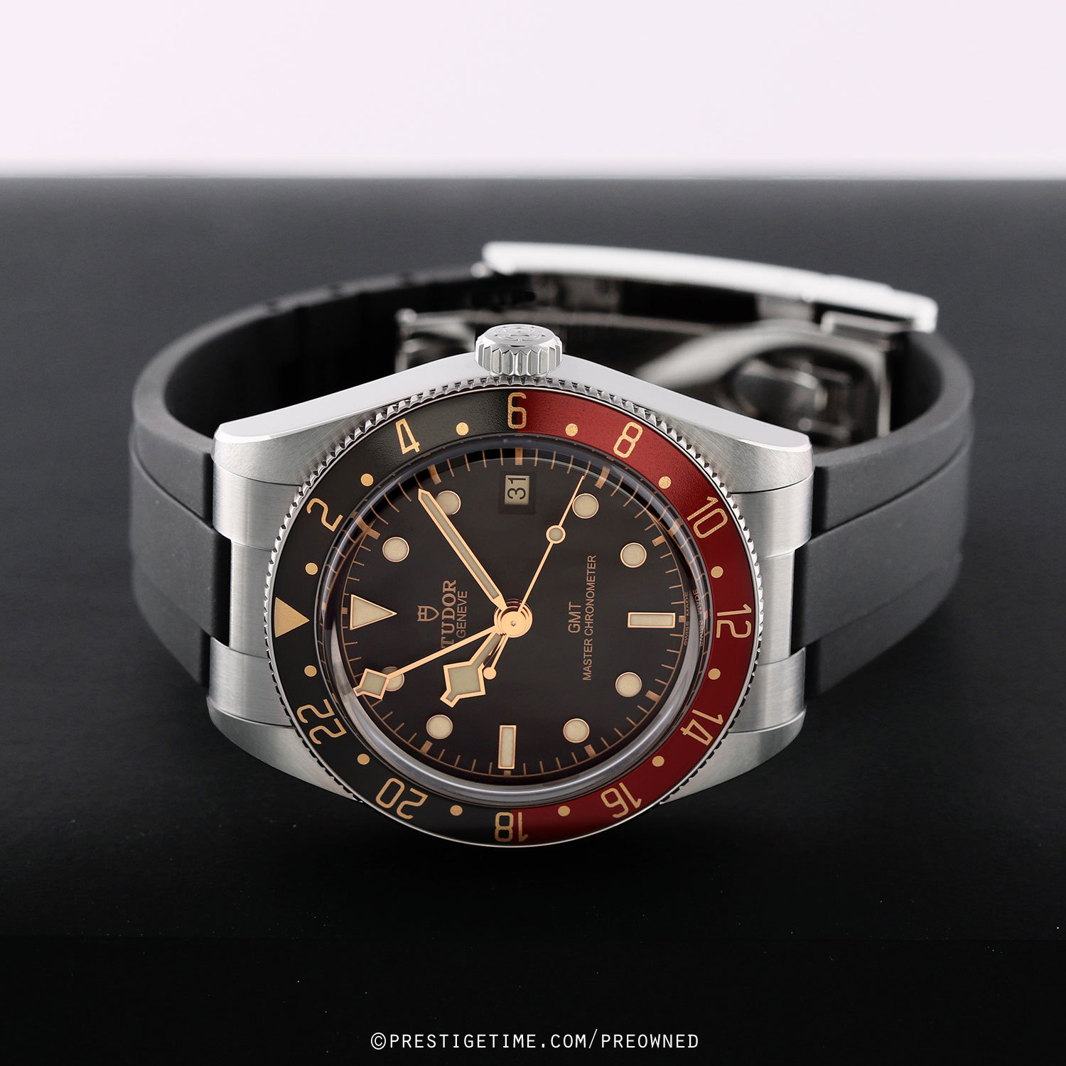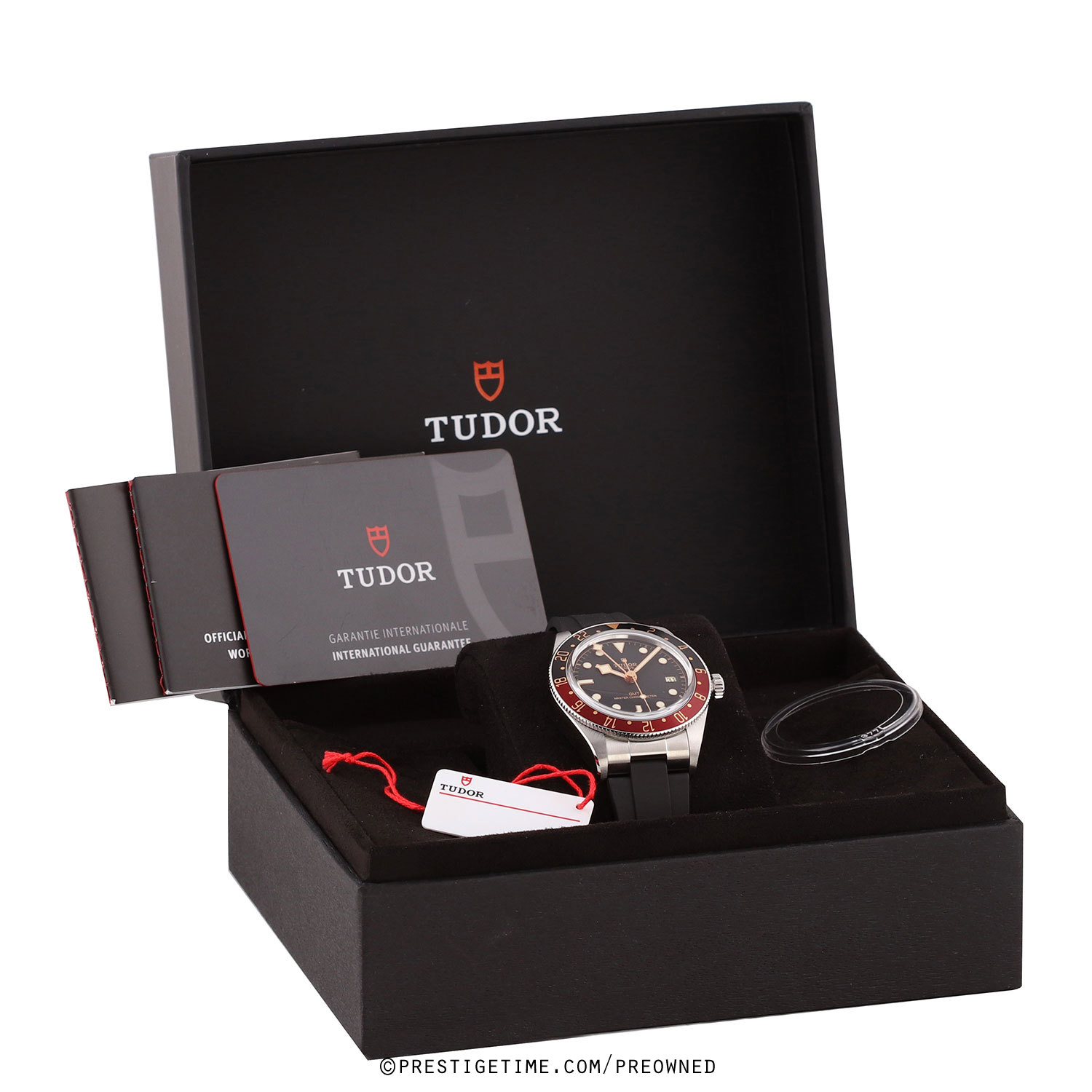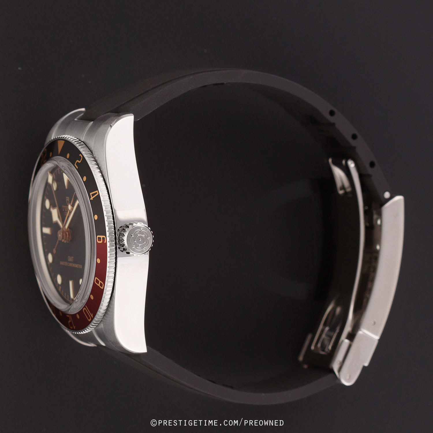 Case: Brushed & polished stainless steel case. Black & burgundy aluminum bezel ring with 24 hour indications. Crown with the TUDOR rose engraved. Domed matte black dial. Polished gilt (rose gold toned) angular 'snowflake' hands with luminous fill. Applied polished gilt hour markers with luminous fill. Fine printed minute/seconds track.