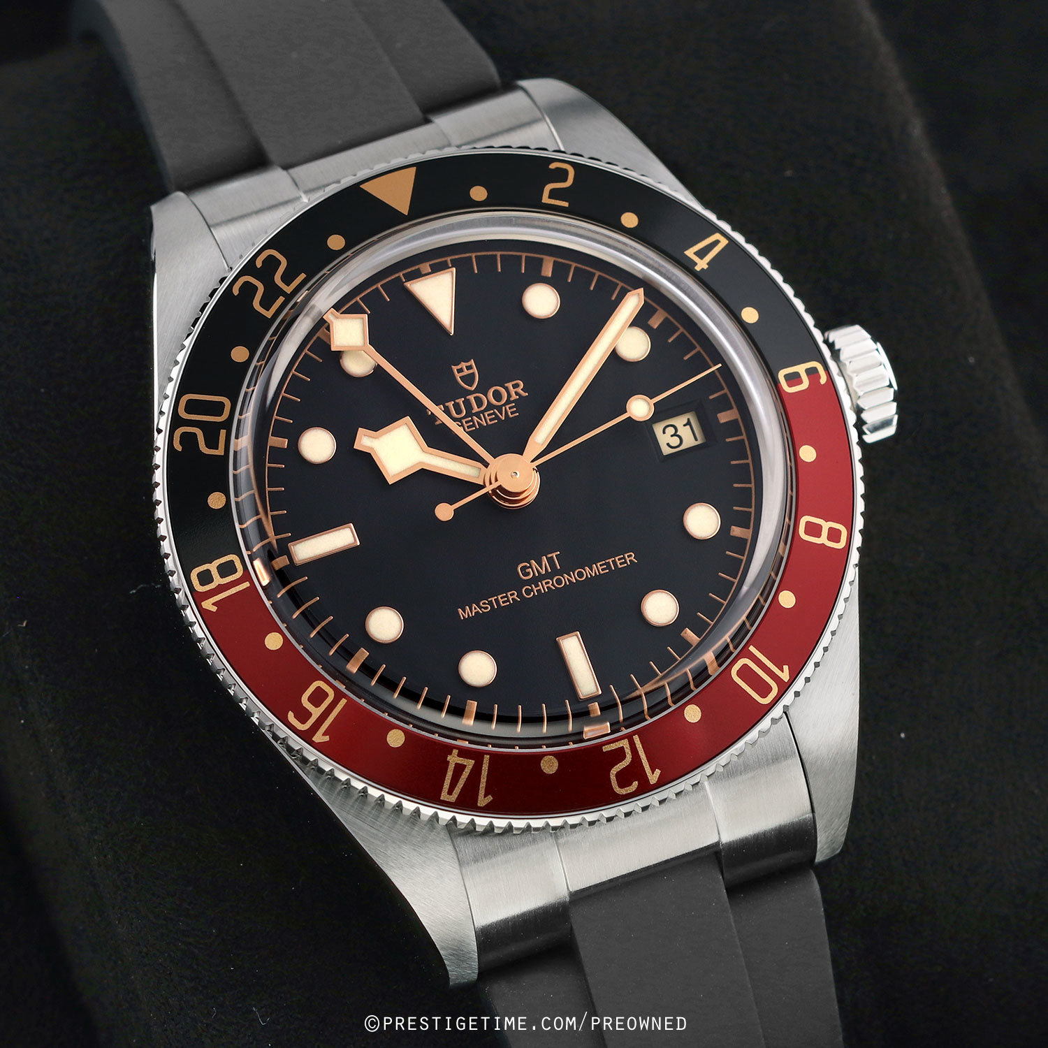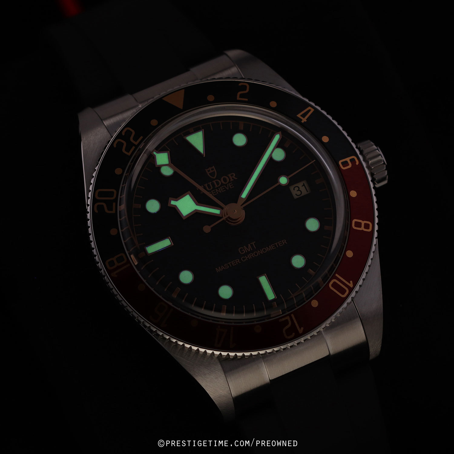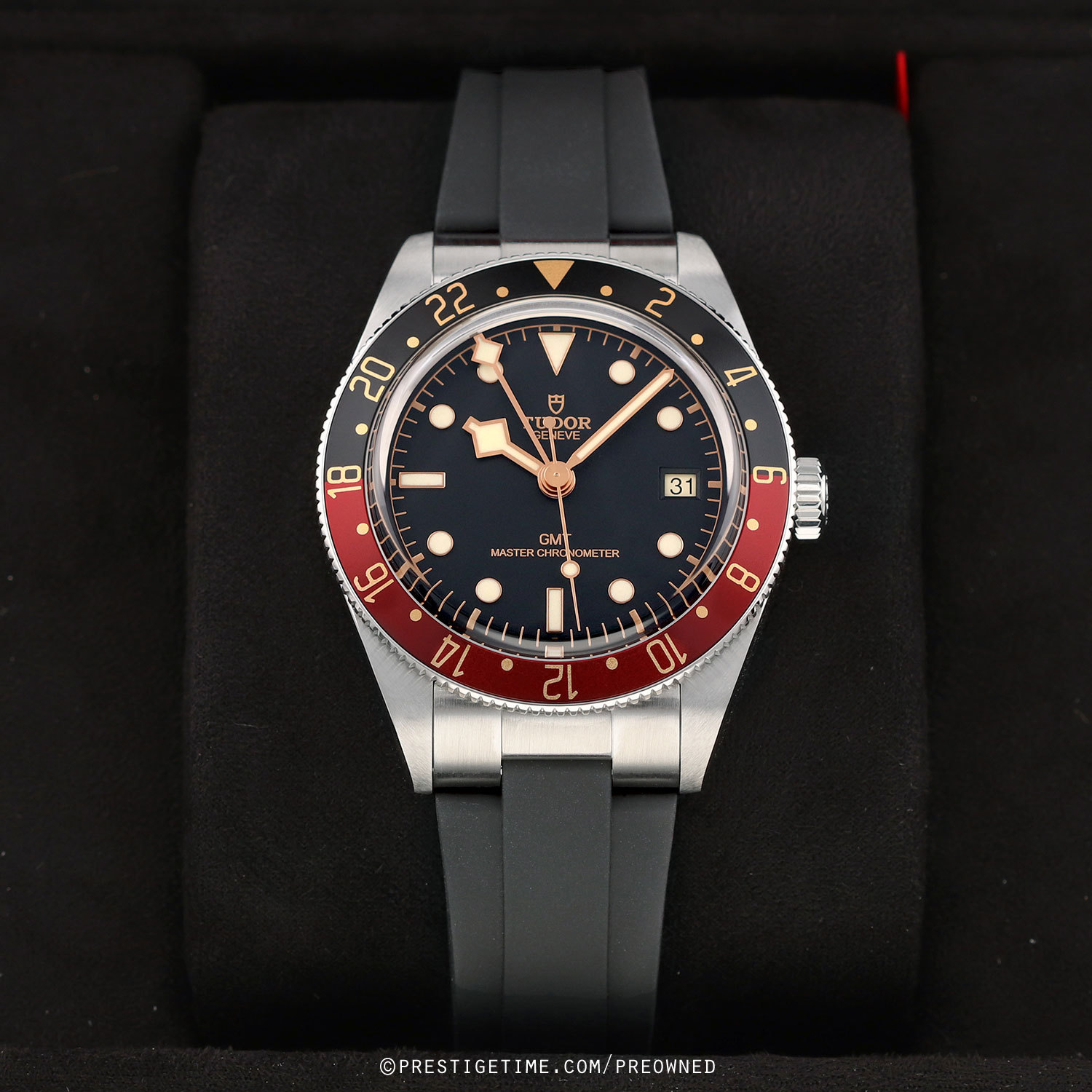 Case: Brushed & polished stainless steel case. Black & burgundy aluminum bezel ring with 24 hour indications. Crown with the TUDOR rose engraved. Domed matte black dial. Polished gilt (rose gold toned) angular 'snowflake' hands with luminous fill. Applied polished gilt hour markers with luminous fill. Fine printed minute/seconds track.