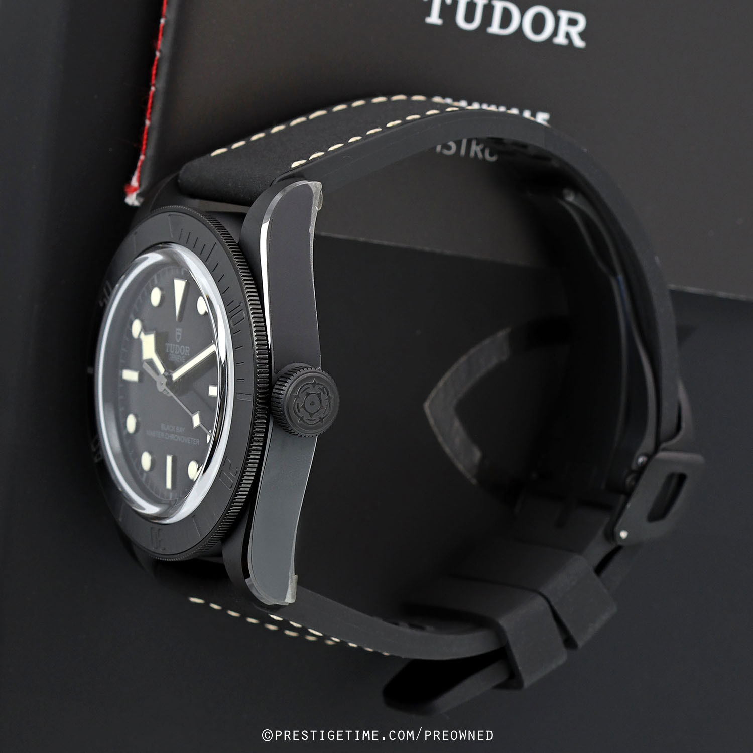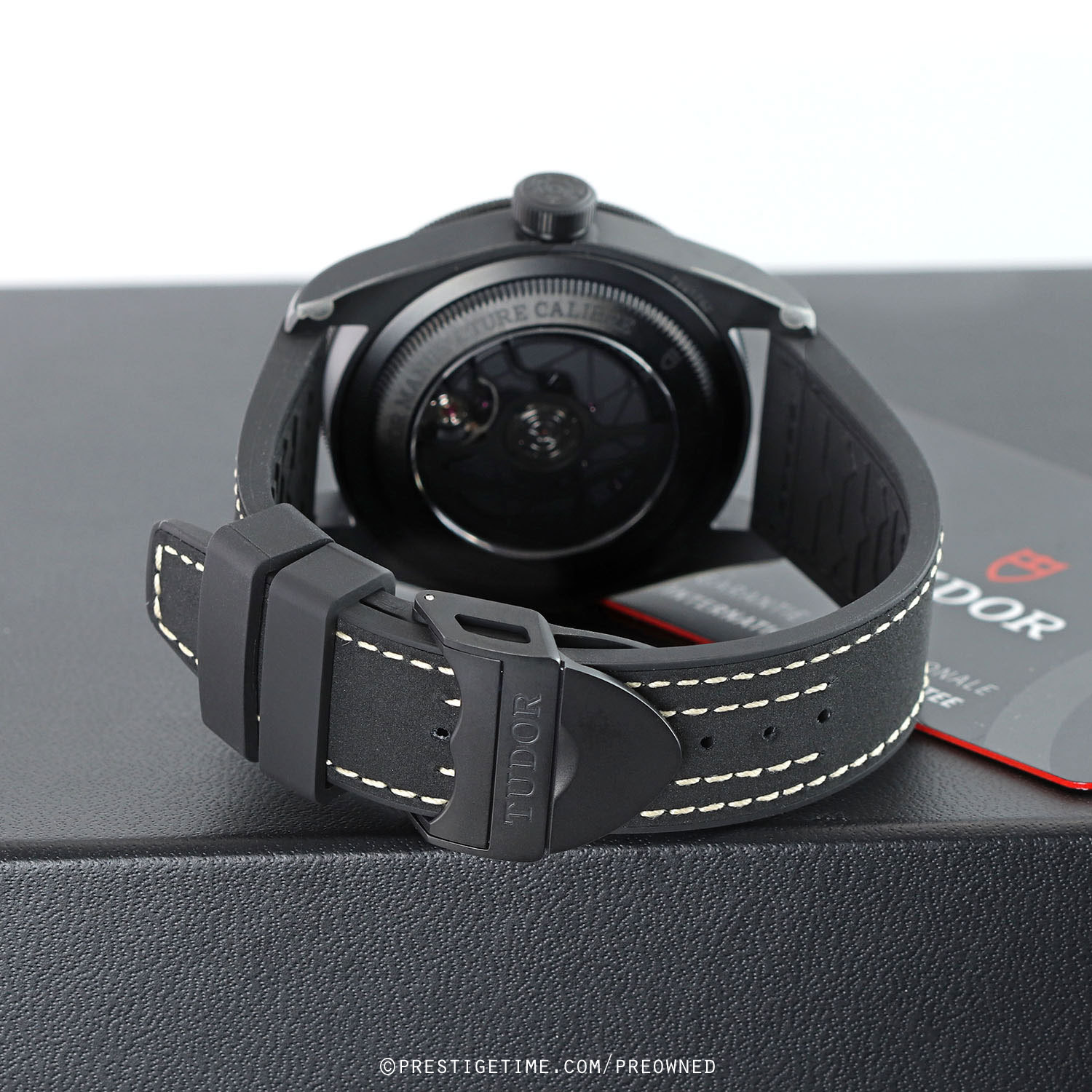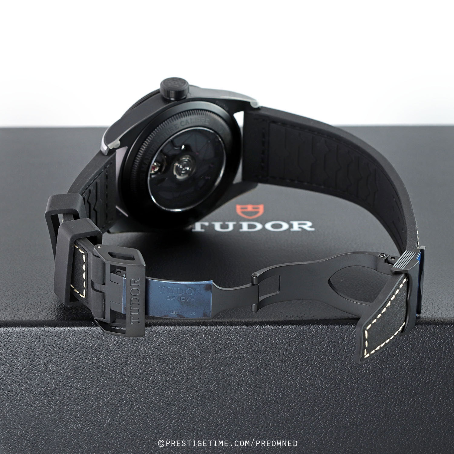 - Fitted with its original Tudor black calfskin leather with black rubber lining strap and with a matte black PVD coated stainless steel deployant buckle. The strap is unworn and in new condition with its full wear lifespan remaining.