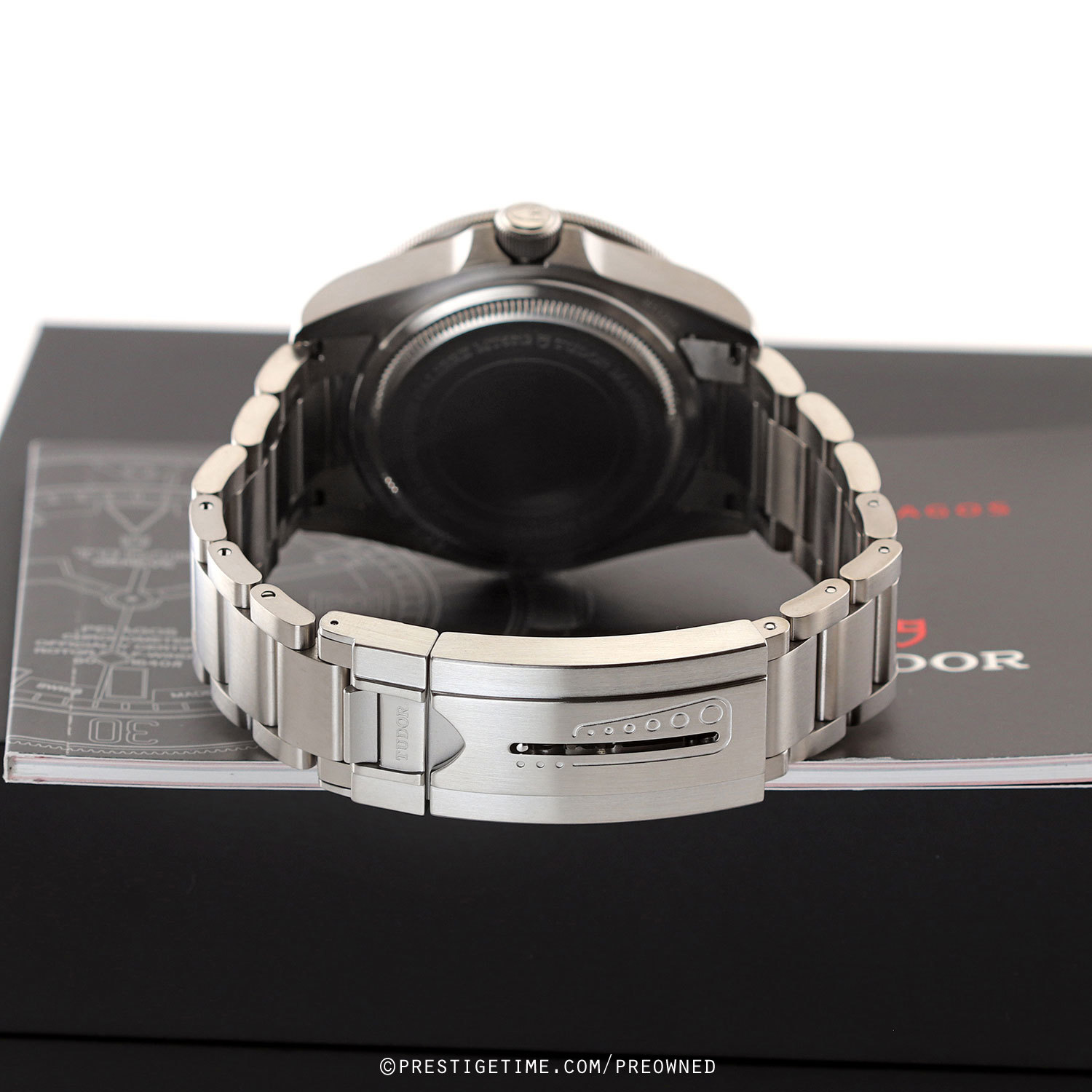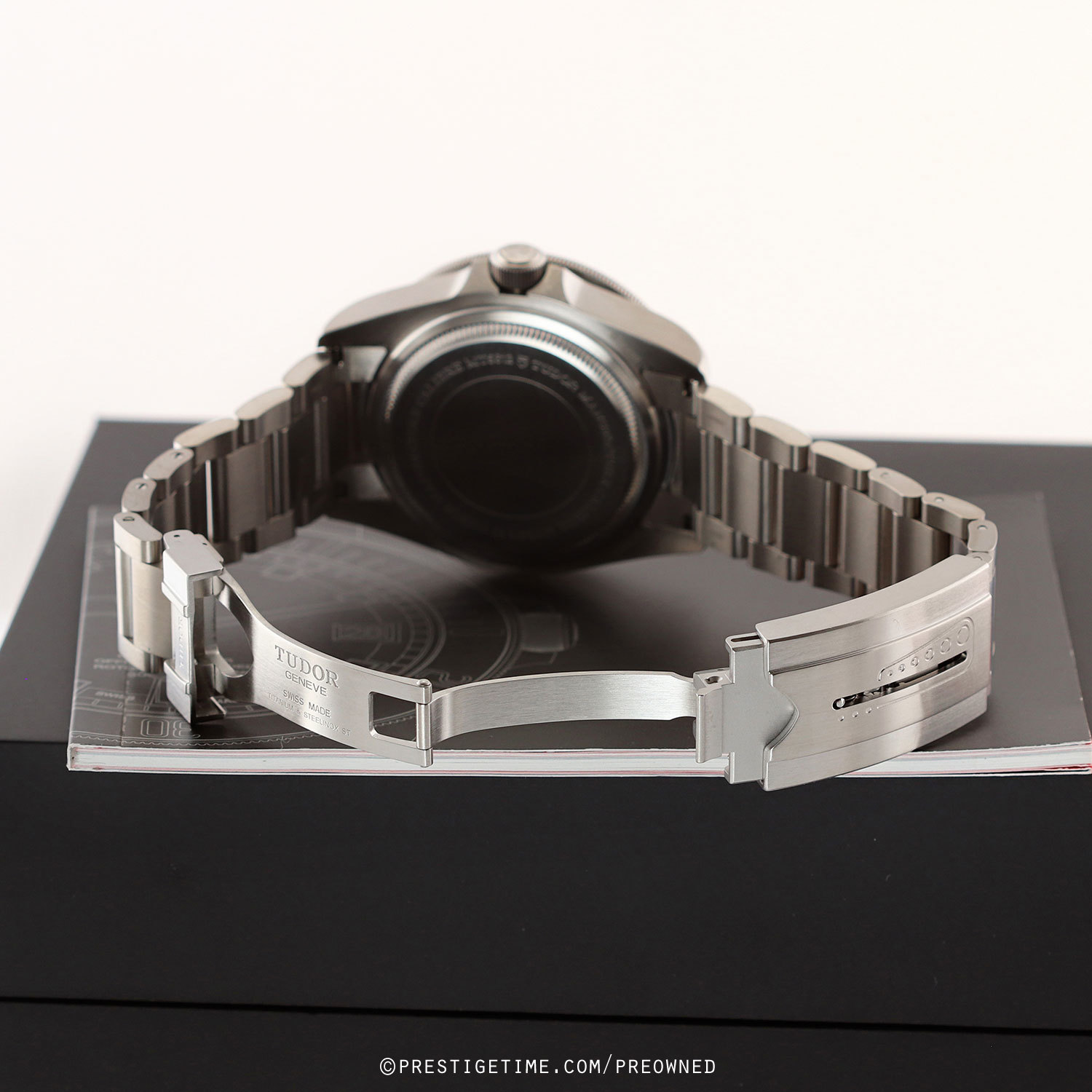 - Fitted on its original brushed titanium bracelet with a folding clasp & safety latch. The bracelet is fully linked & will fit up to a 8" wrist. The buckle features a Tudor patented divers extension system.
