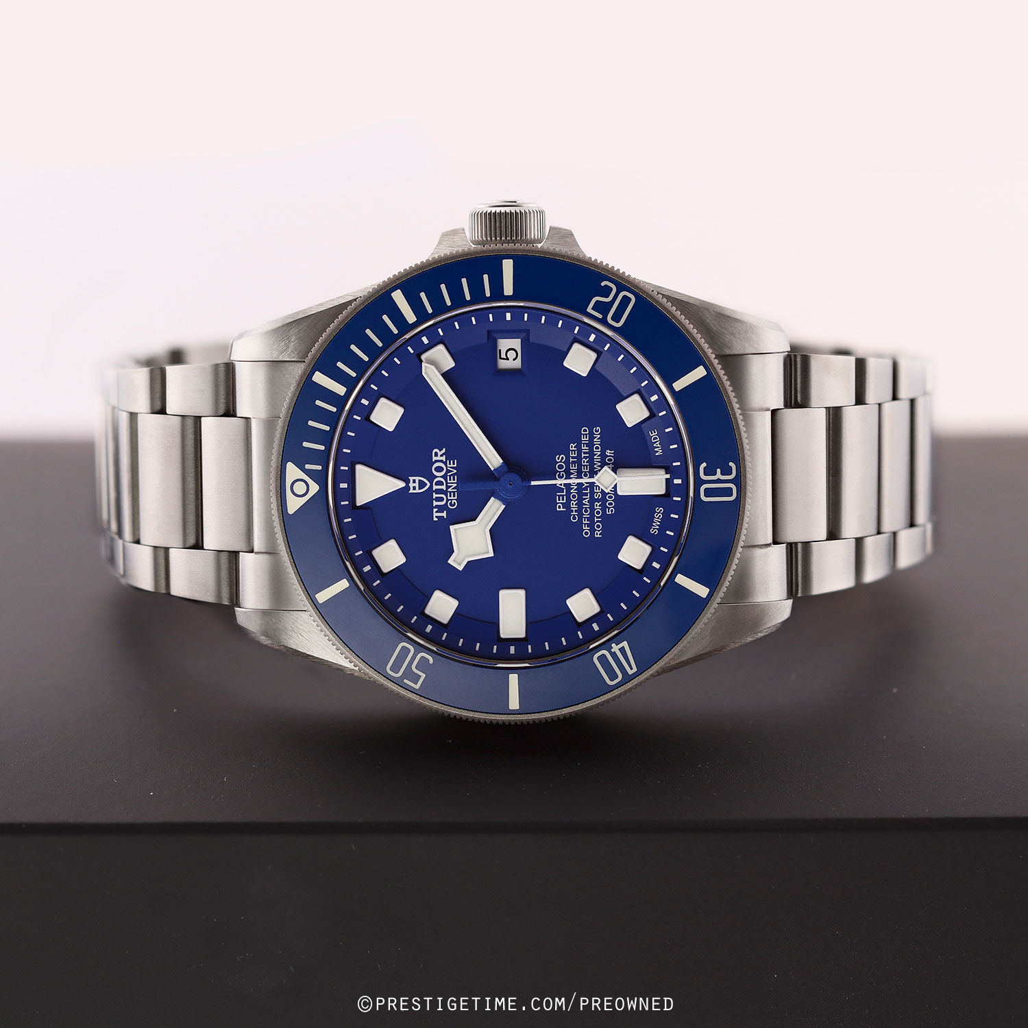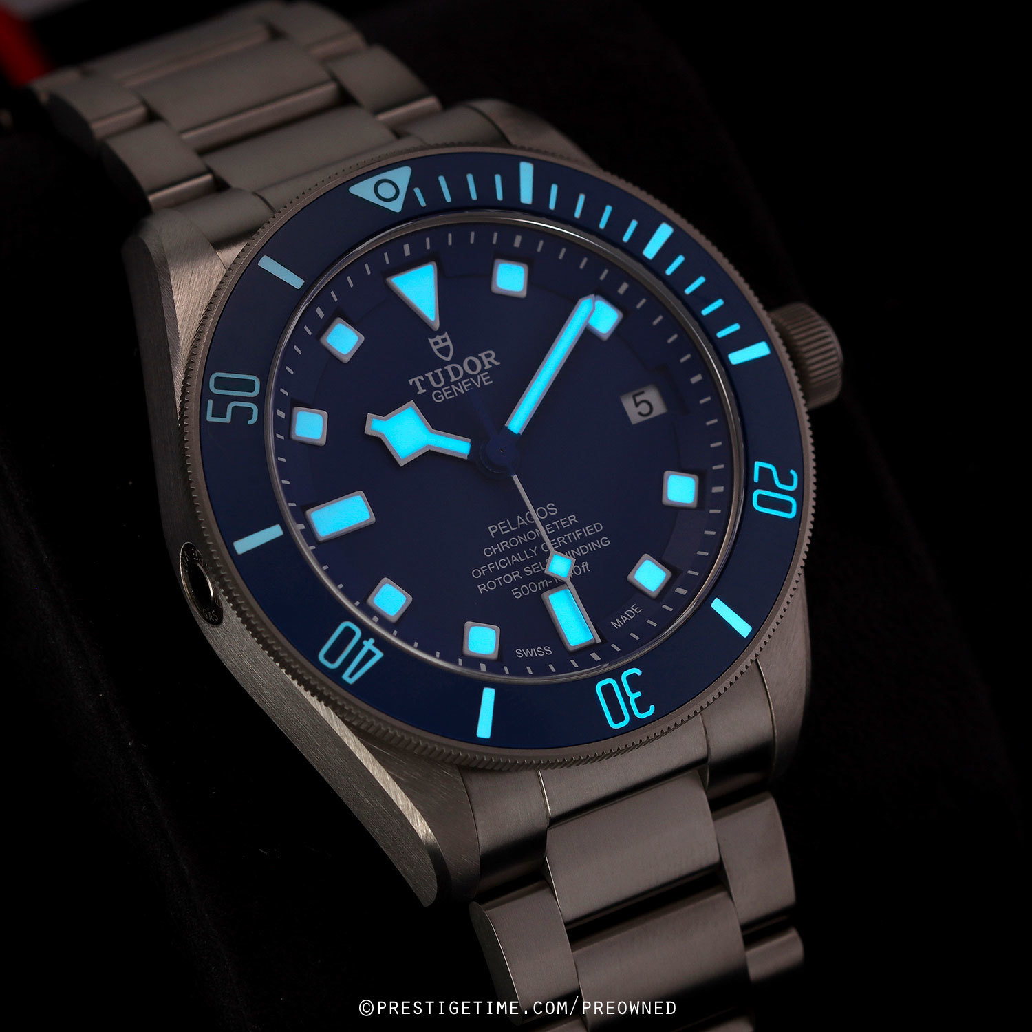 Case: Brushed titanium case. Uni-directional rotating bezel featuring a matte blue ceramic insert with luminous diving scale. Matte blue dial. Blue & white 'snowflake' hands with luminous fill. Applied hour markers with luminous fill. Black dial flange with minute/seconds track. Date window at 3 o'clock.