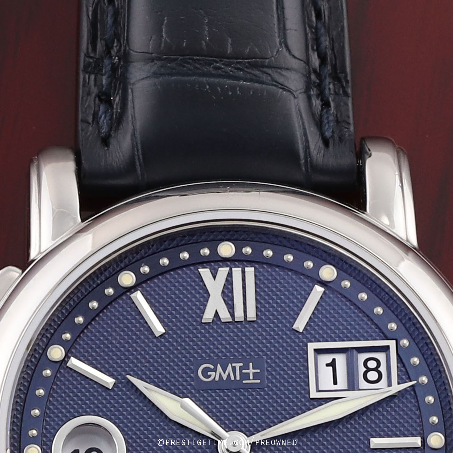 - GMT/Dual Time-zone via window at 9 o'clock with +/- buttons to advance or reverse the time on the left case side.