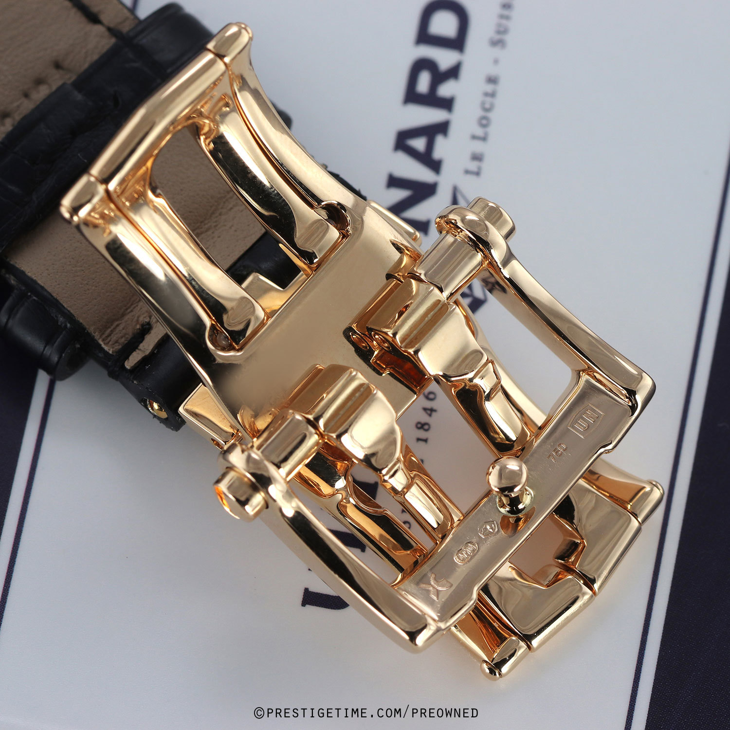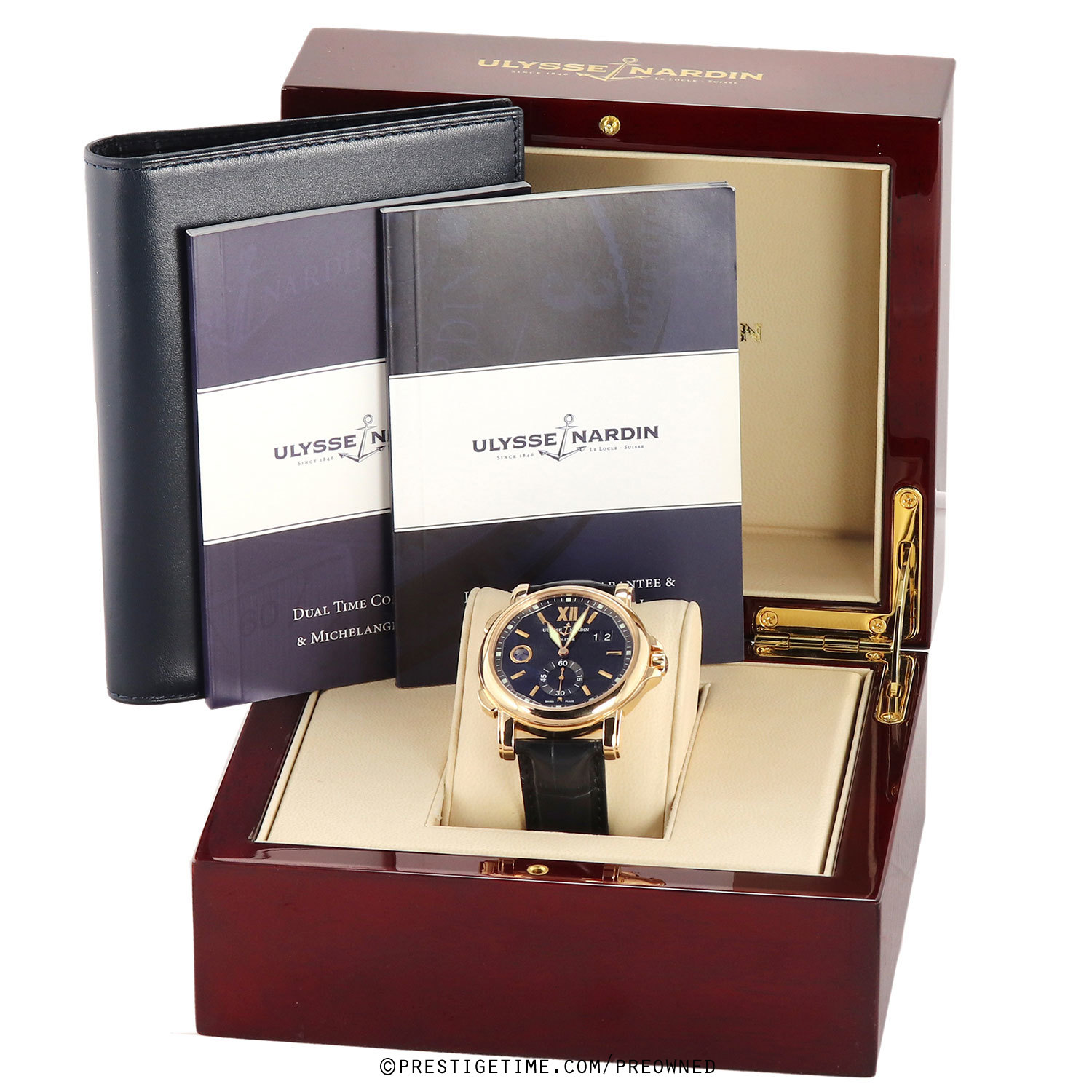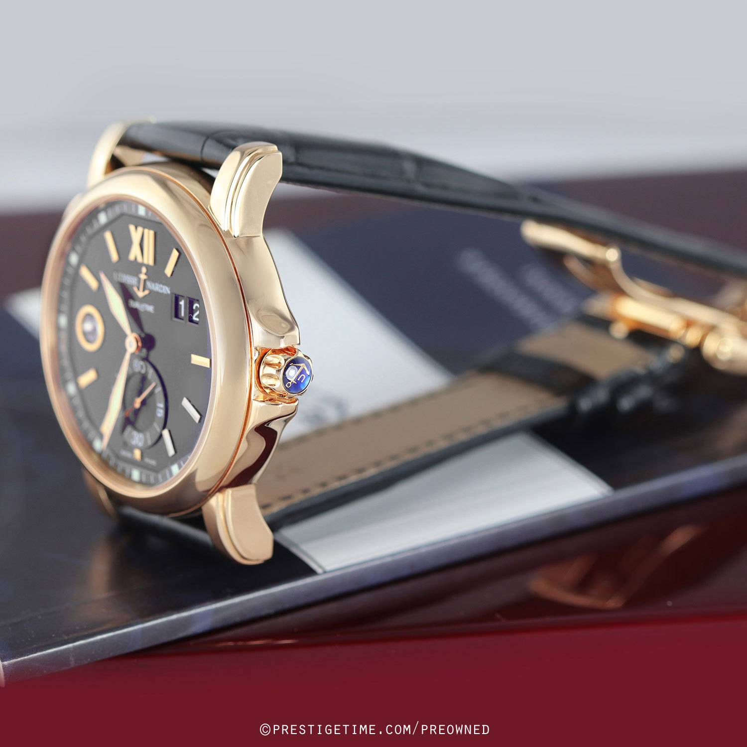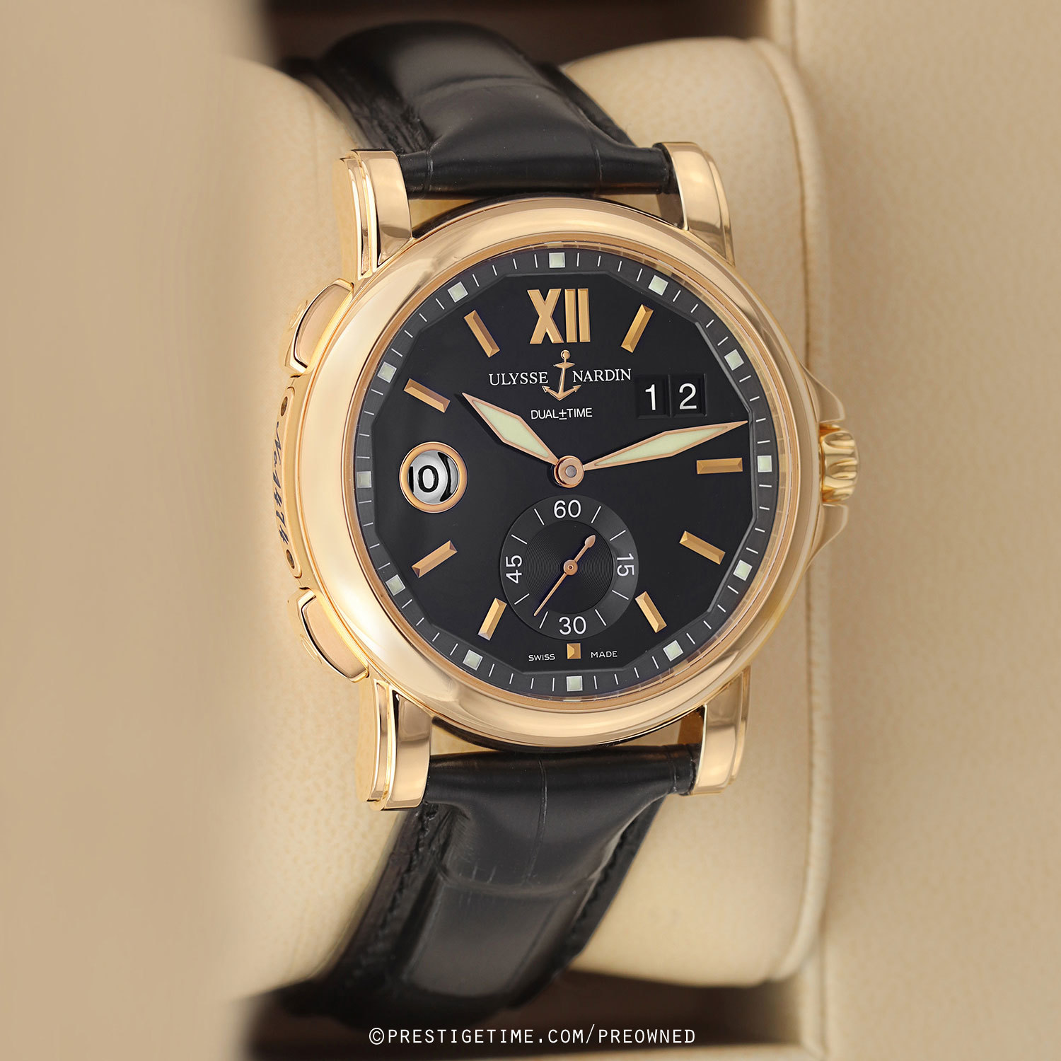 Case: Polished 18kt rose gold case. Black dial with a very fine sun-ray finish. Applied polished rose gold hour markers. Minute track & luminous square dot hour markers on the dial perimeter. Polished rose hold hands, the hour & minute hands with luminous fill. Small seconds sub-dial at 6 o'clock. Large double-window date at 2 o'clock.