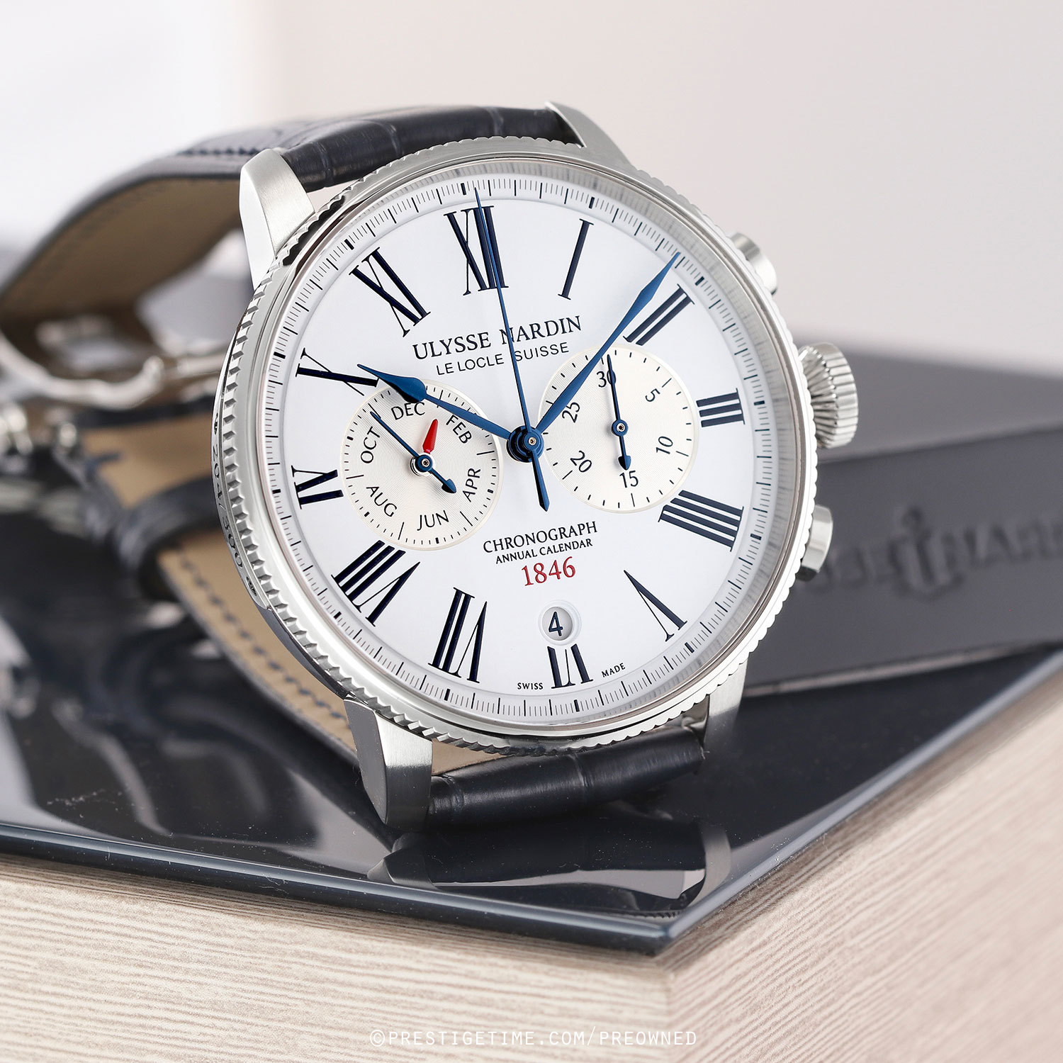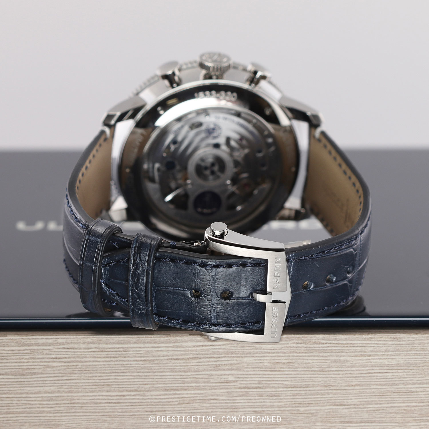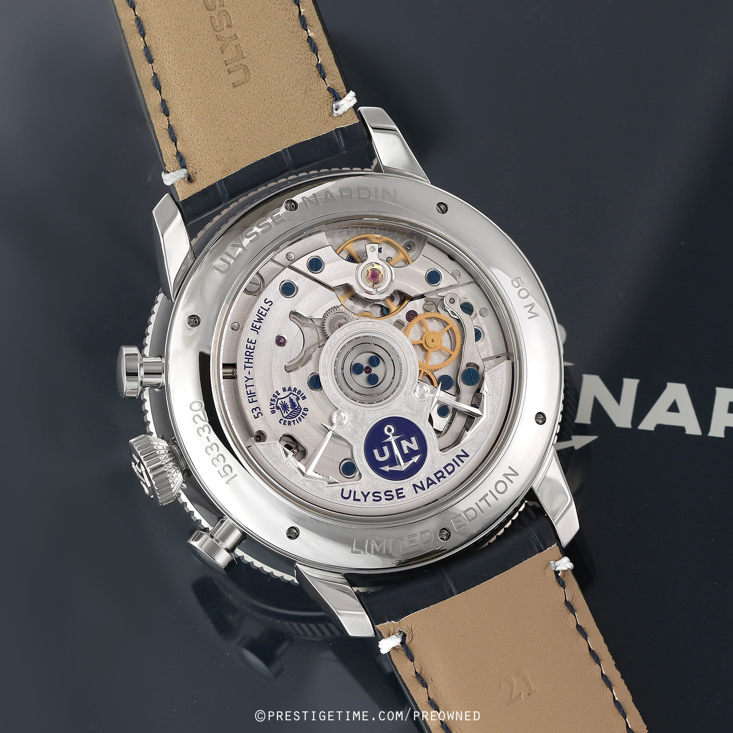 Strap: Fitted on its original Ulysse Nardin dark blue alligator leather strap with a stainless steel push-button deployant buckle. The strap is unworn, in new condition with its full wear lifespan remaining.