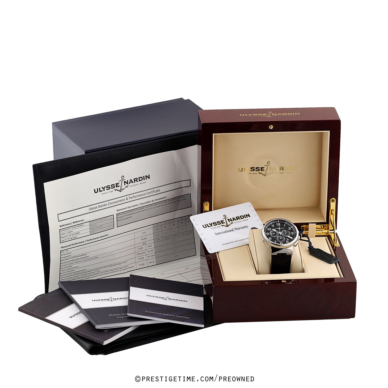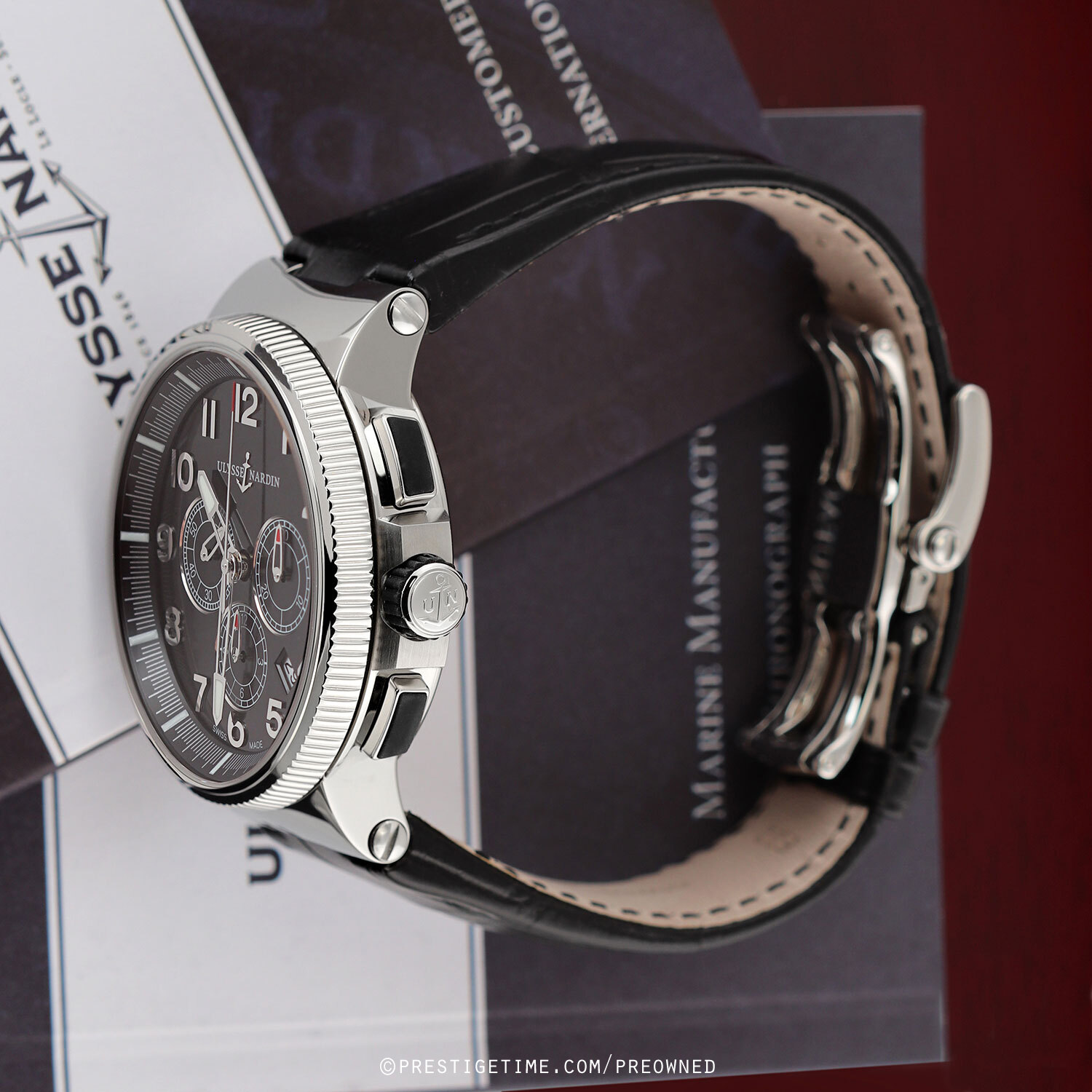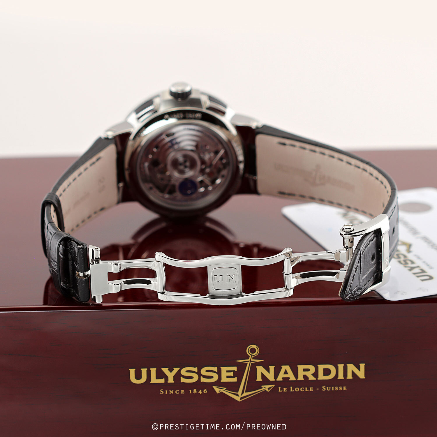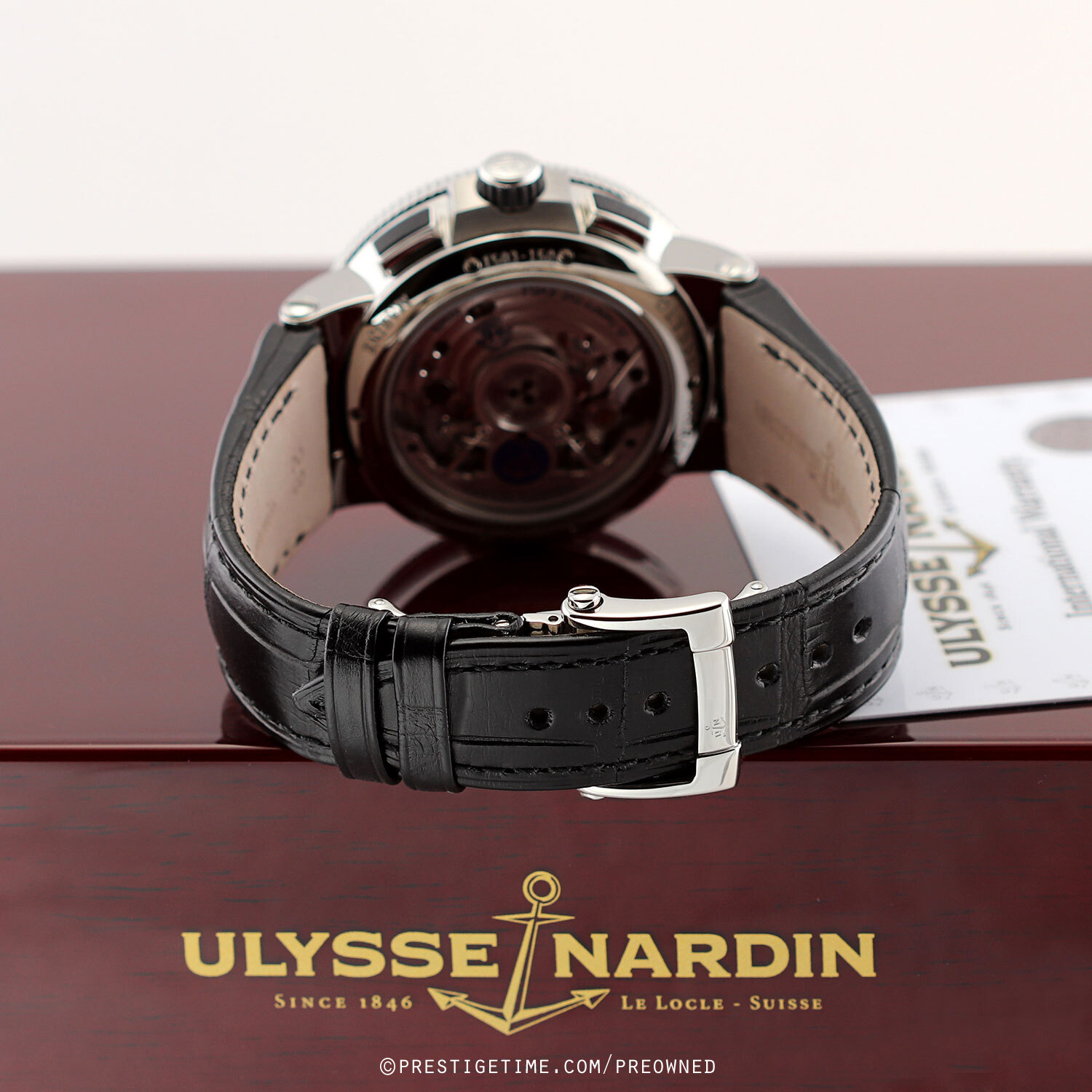 Strap: Fitted on its OEM Ulysse Nardin black Alligator leather strap with a push-button deployant buckle. The strap is unworn & in crisp new condition.
