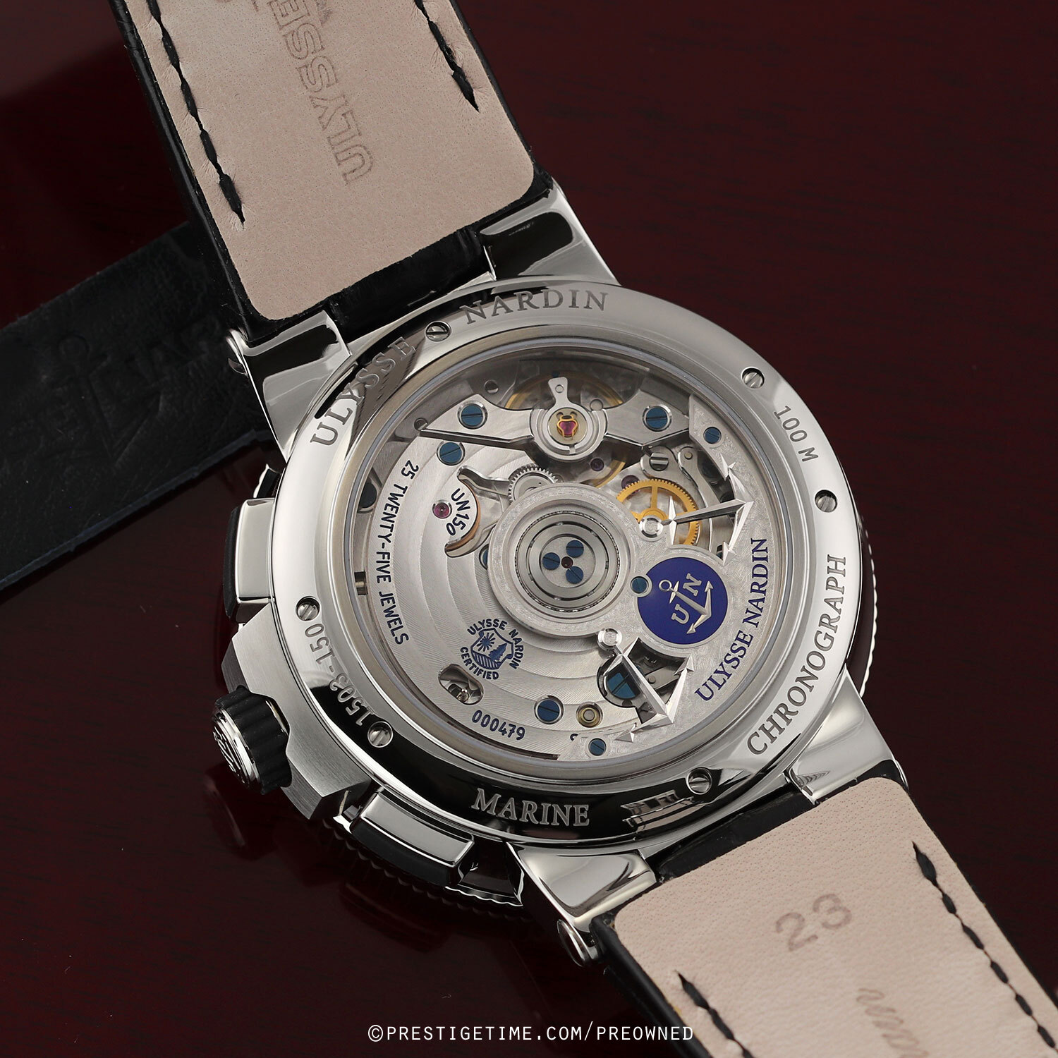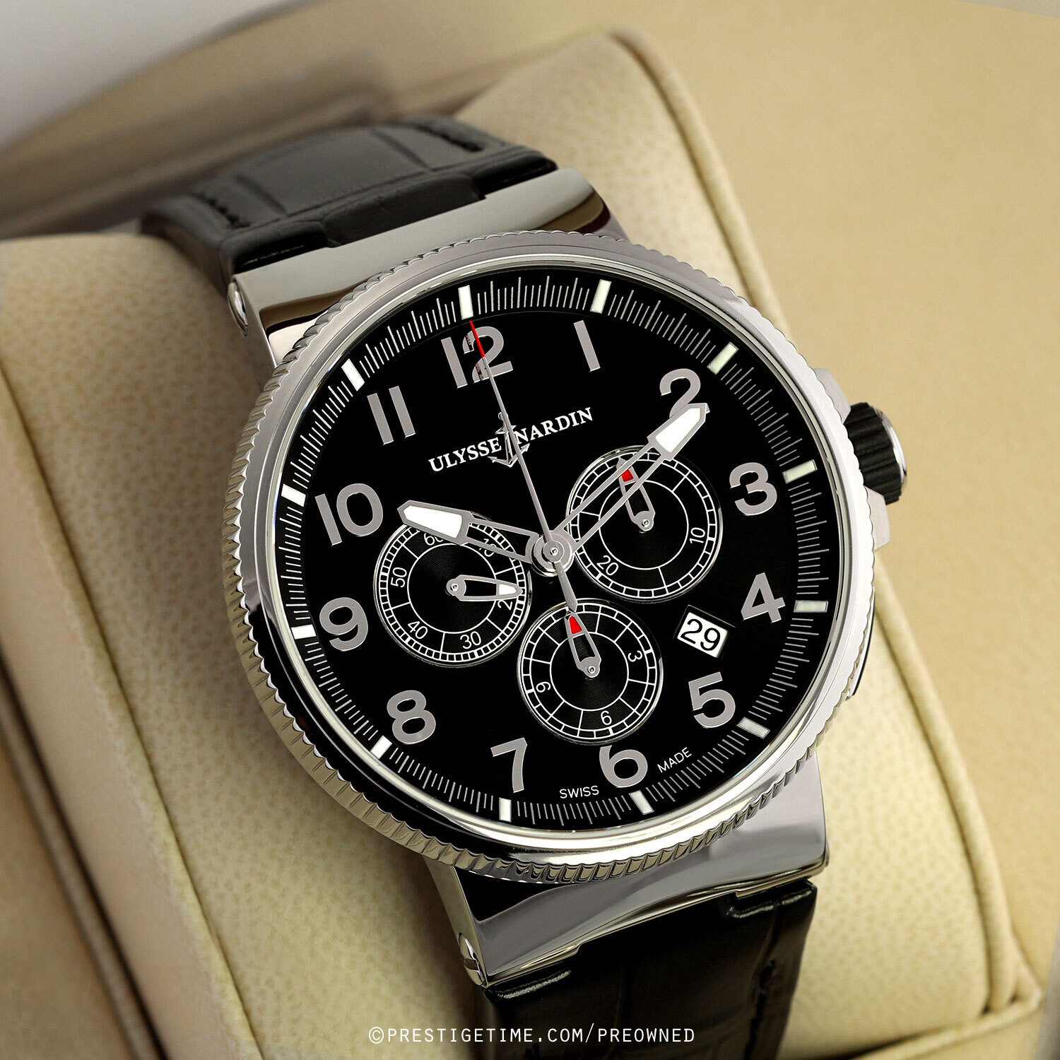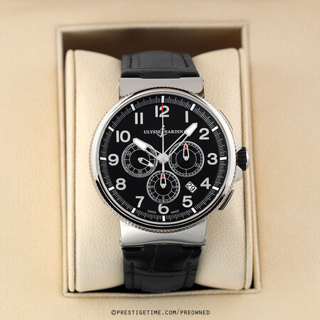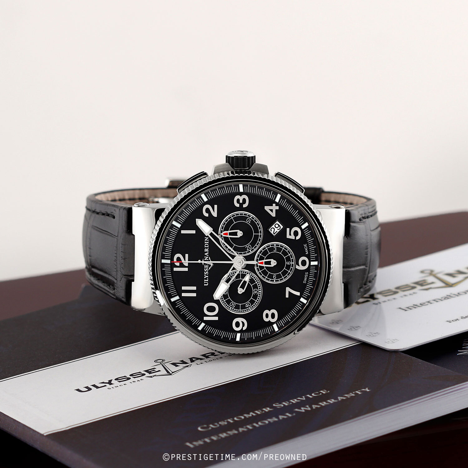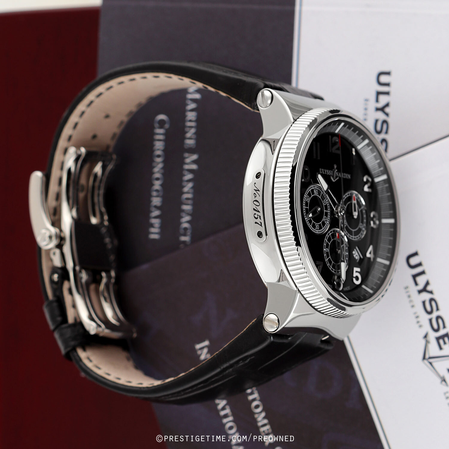 Strap: Fitted on its OEM Ulysse Nardin black Alligator leather strap with a push-button deployant buckle. The strap is unworn & in crisp new condition.