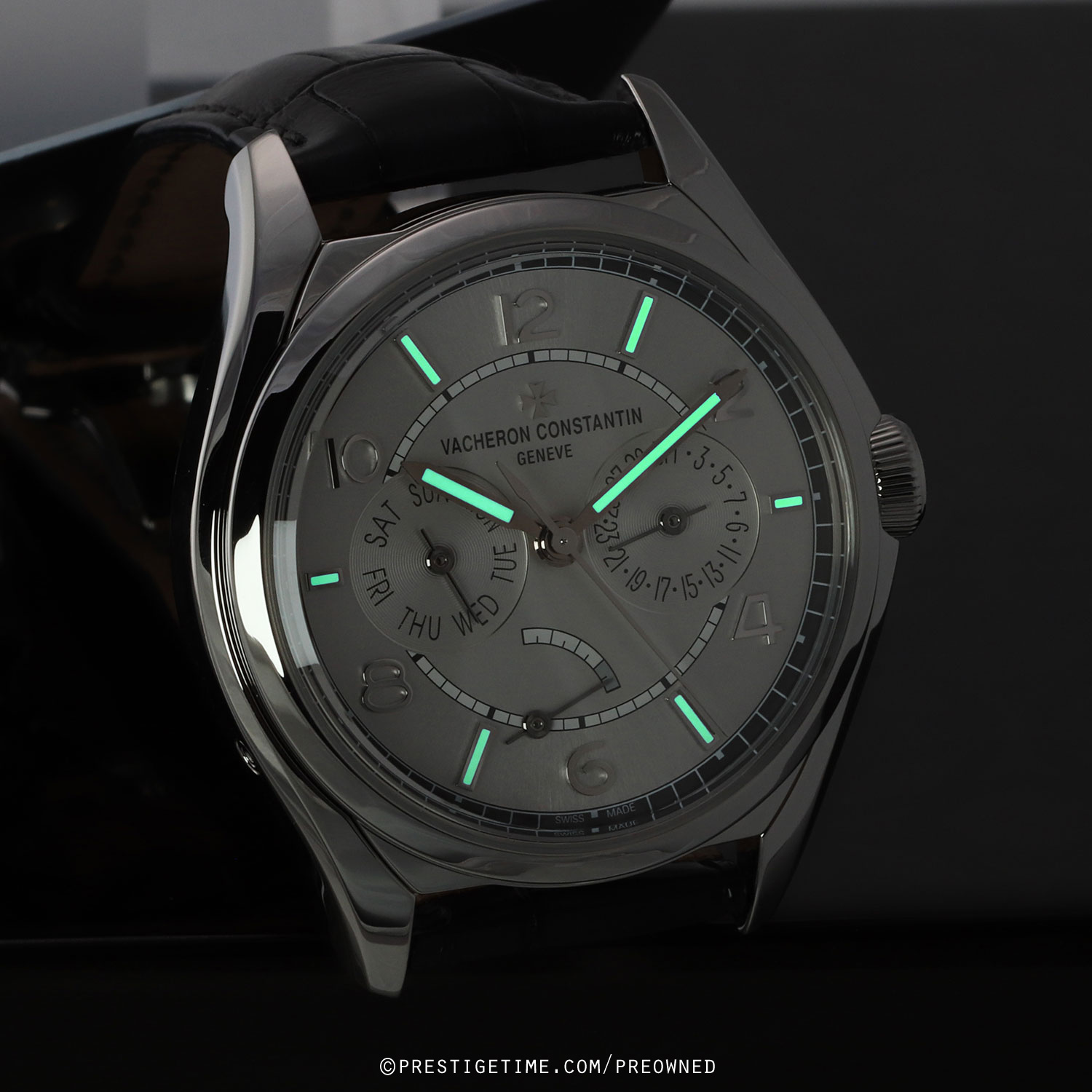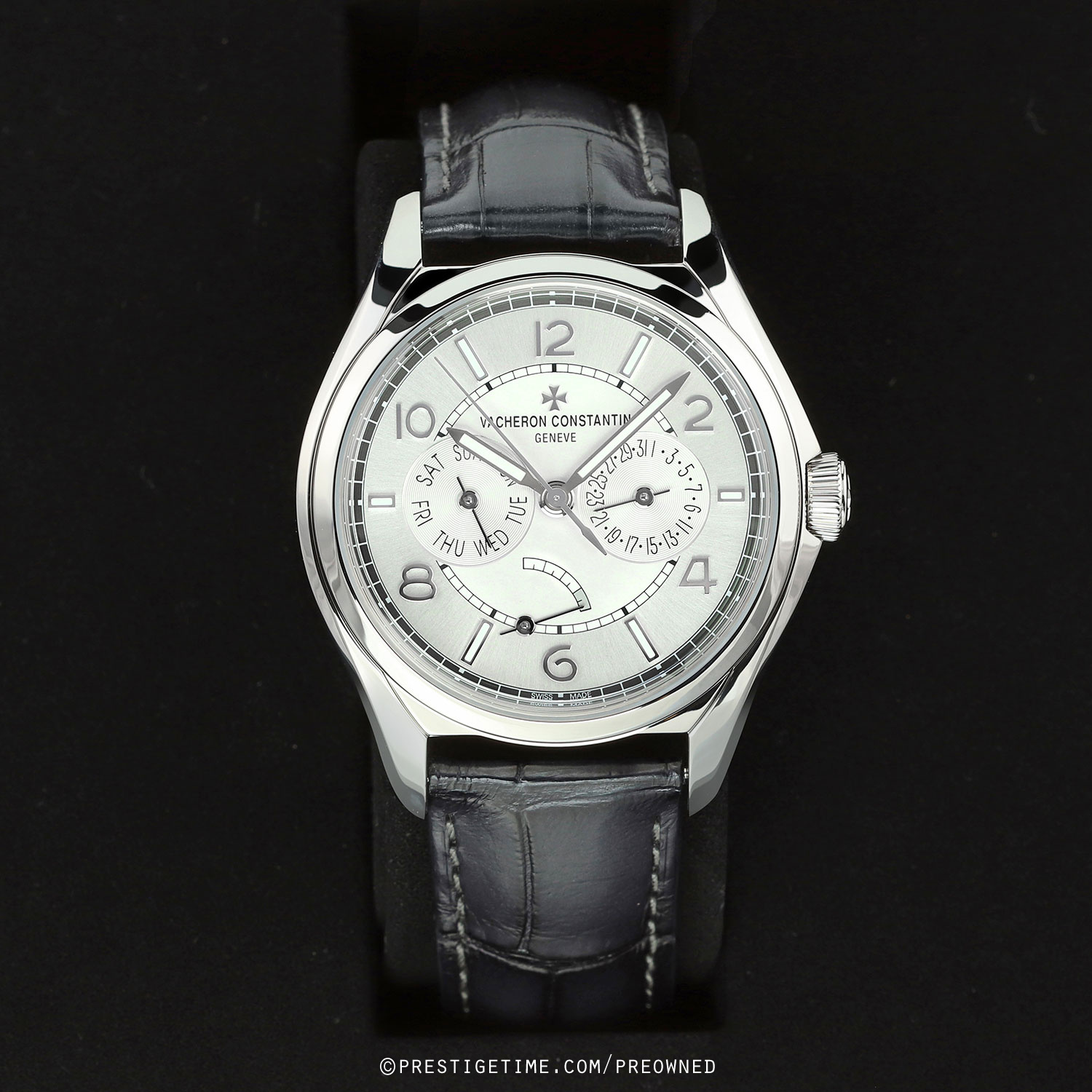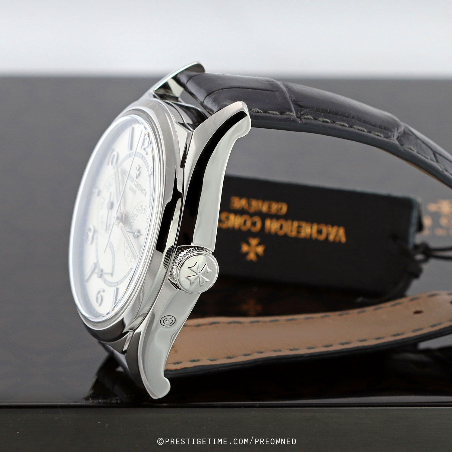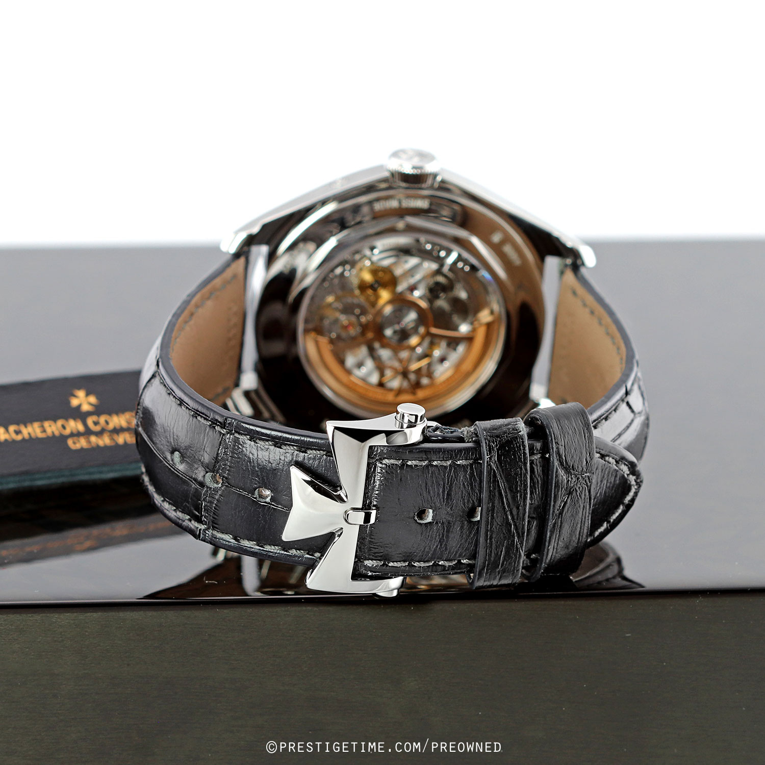 Strap: Fitted on its original Vacheron dark grey, almost black, alligator leather strap with a stainless steel push-button deployant buckle. The strap is in excellent condition with the majority of its wear lifespan remaining. We would be comfortable rating the strap as in 97%+ condition.