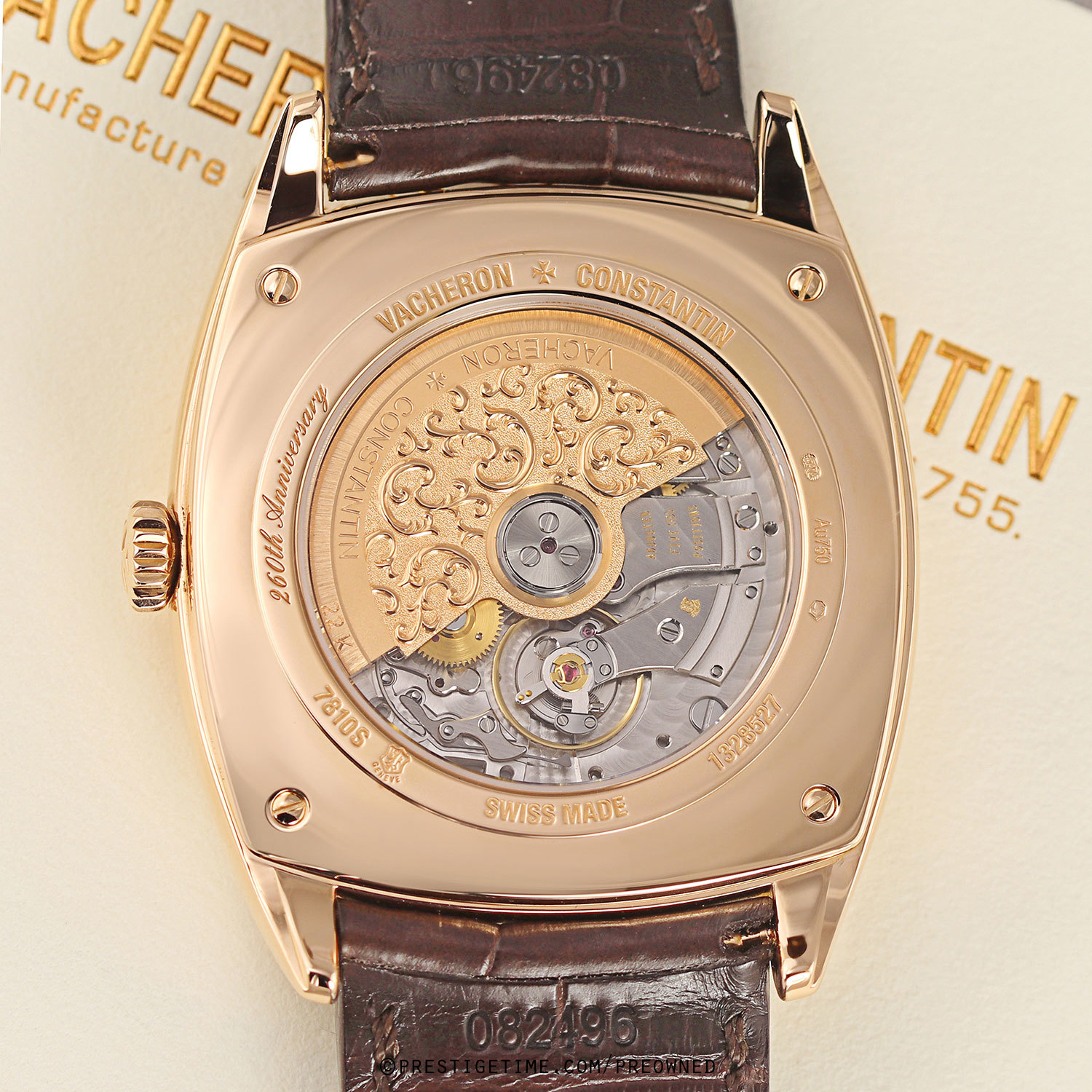 Movement: Powered by a Vacheron Constantin in-house caliber 2460 DT which beats at 28,800 vph (4Hz), composed out of 233 parts, contains 27 jewels & has a power reserve of +/- 40 hours. The 22kt gold rotor is decorated with a unique “fleurisanne engraving” specific to the 260th anniversary edition watches. Fleurisanne is the art of hand carving metal in high relief with a contrasting background. The movement is stamped with the